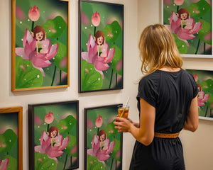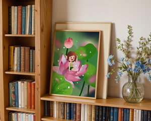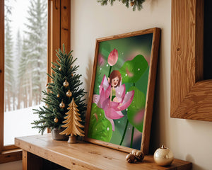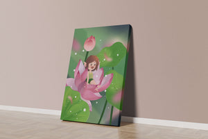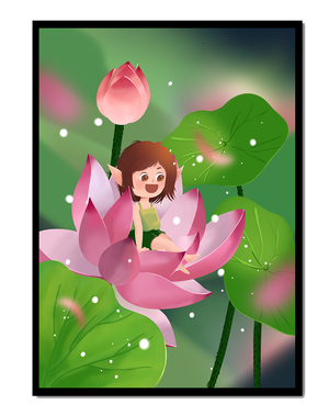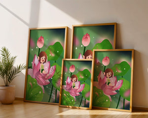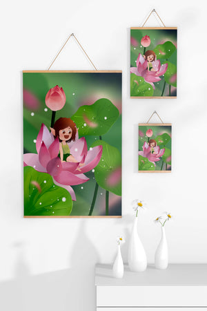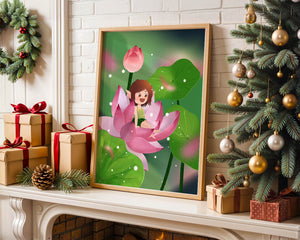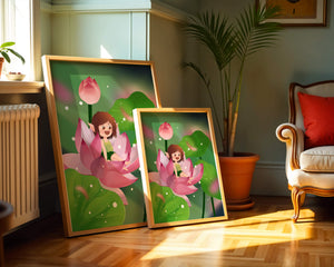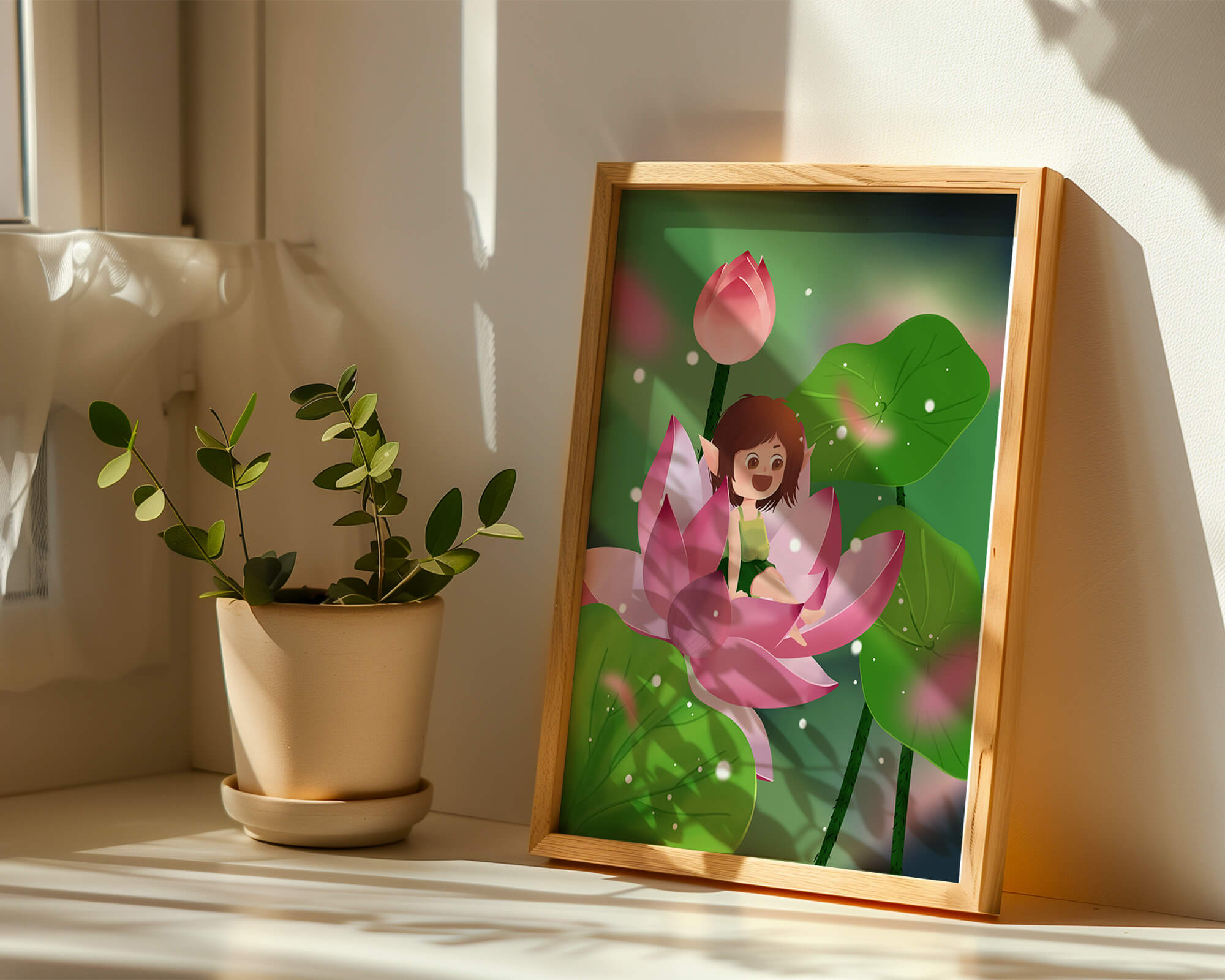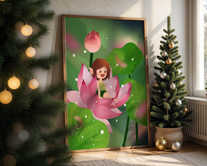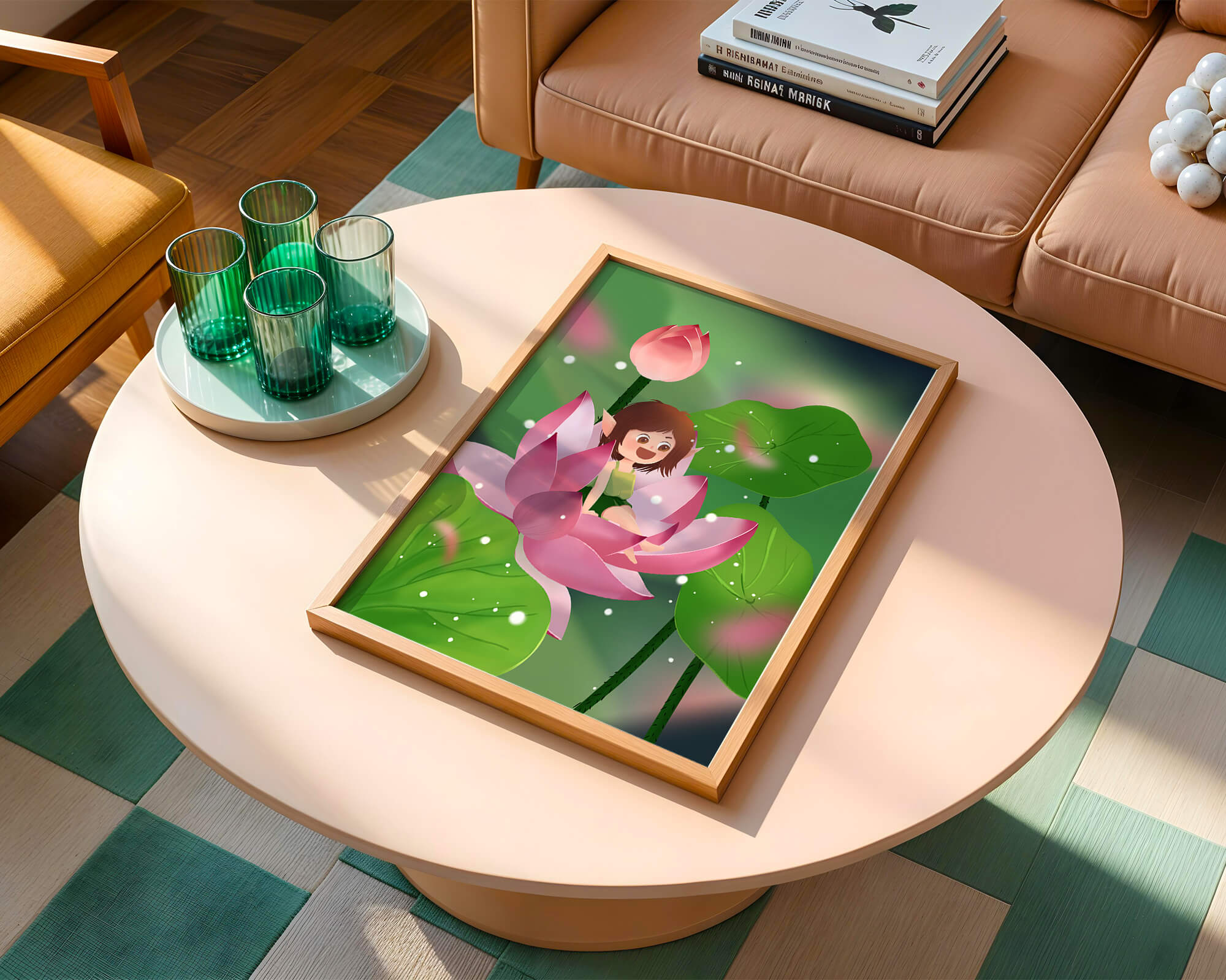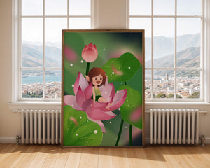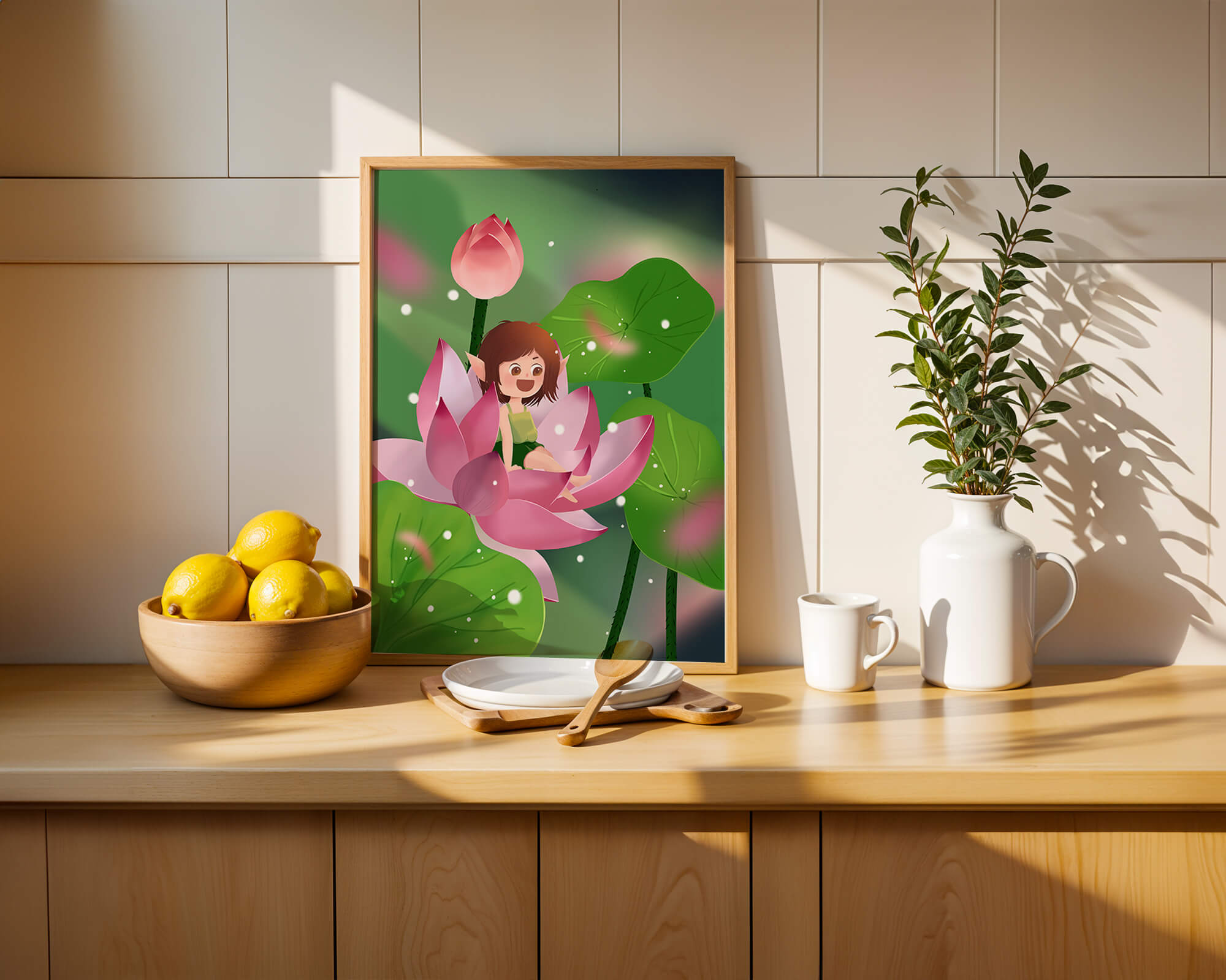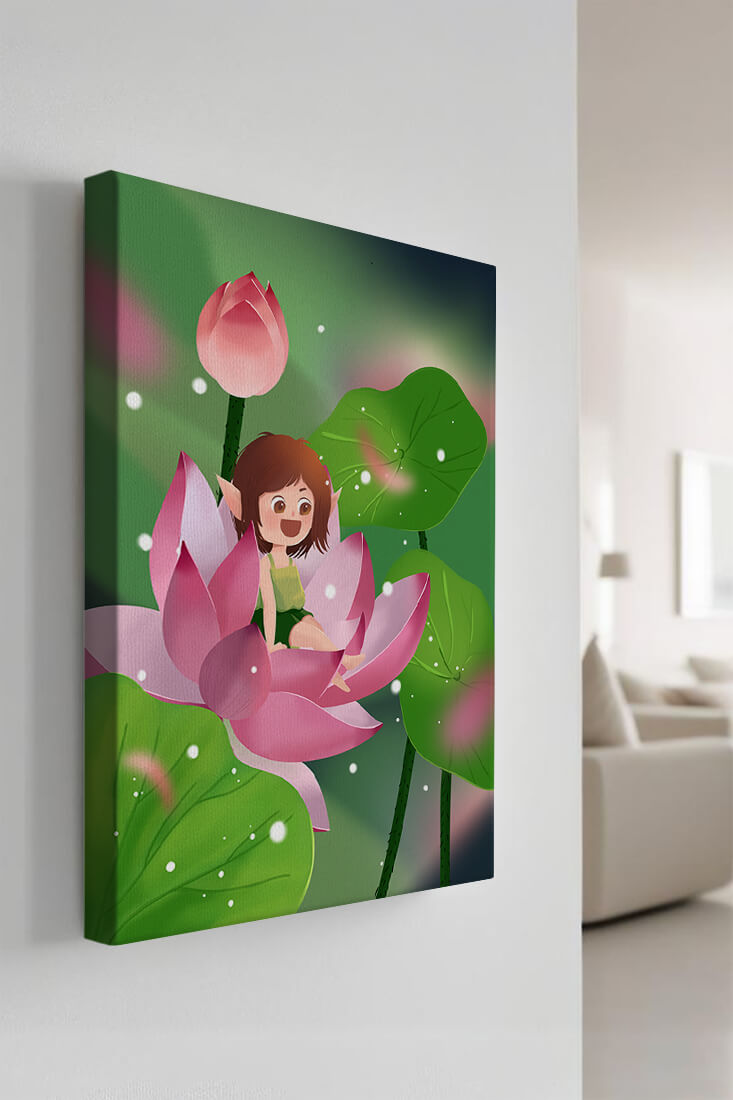 In this enchanting image, a small fairy is seen joyfully sitting atop a beautiful pink lotus flower. The surrounding environment is lush with greenery, creating a dreamy and whimsical atmosphere.The image captures the essence of a magical garden, where vibrant colors and playful elements combine to create a scene straight out of a fairy tale. The fairy, with her delightful expression, adds to the charm, making it ideal for adding a touch of fantasy to any childrens room.The interplay of pinks and greens gives the piece a refreshing look, making it perfect for those who appreciate imaginative and vibrant wall art. Whether its for a childs space or a nature-themed corner, this illustration brings the magic of fantasy to life.