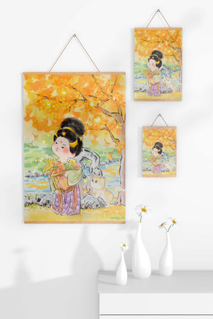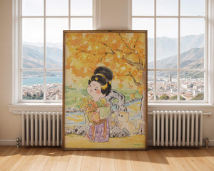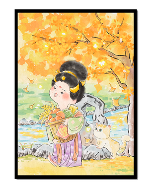 The image depicts a young girl carrying a basket filled with freshly harvested vegetables and grains, signifying the beauty and abundance of the fall season. Her bright expression radiates joy and innocence, adding a joyful touch to the serene environment. Beside her, a playful cat follows her through the enchanting landscape.Golden leaves flutter gently around her, creating a picturesque scene as they fall from the trees above. The winding stream in the background, along with the picturesque rocky formations, adds depth and serenity to the artwork. This serene and lively depiction is a perfect addition to any childrens room or as a charming piece of art decor.| Type |