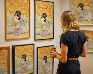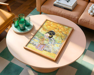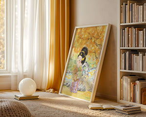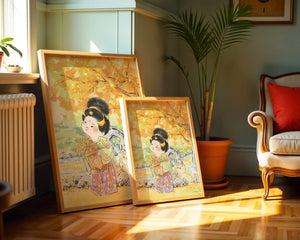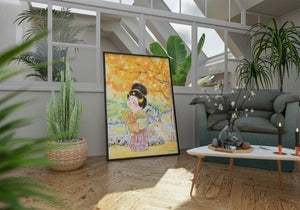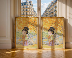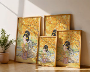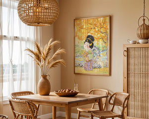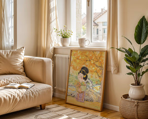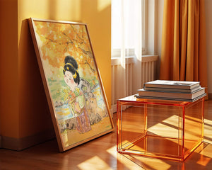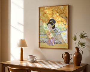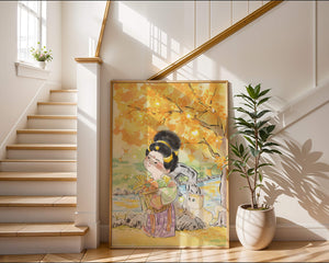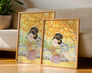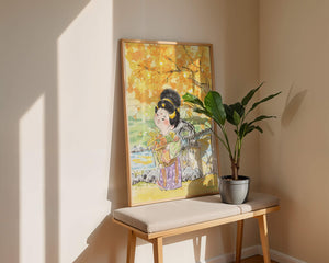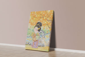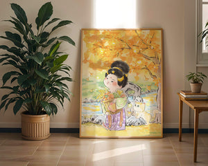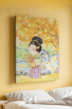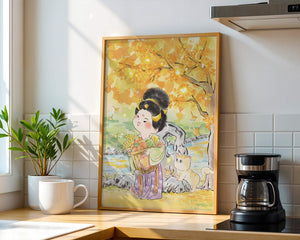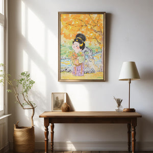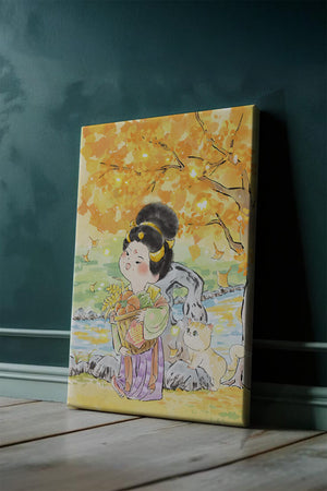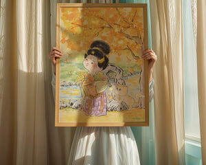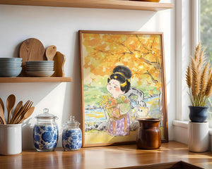 This delightful watercolor illustration captures a whimsical scene of a charming little girl in a traditional Japanese kimono. The setting is beautifully rendered with vibrant autumn colors.