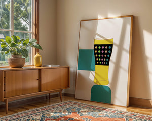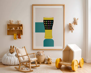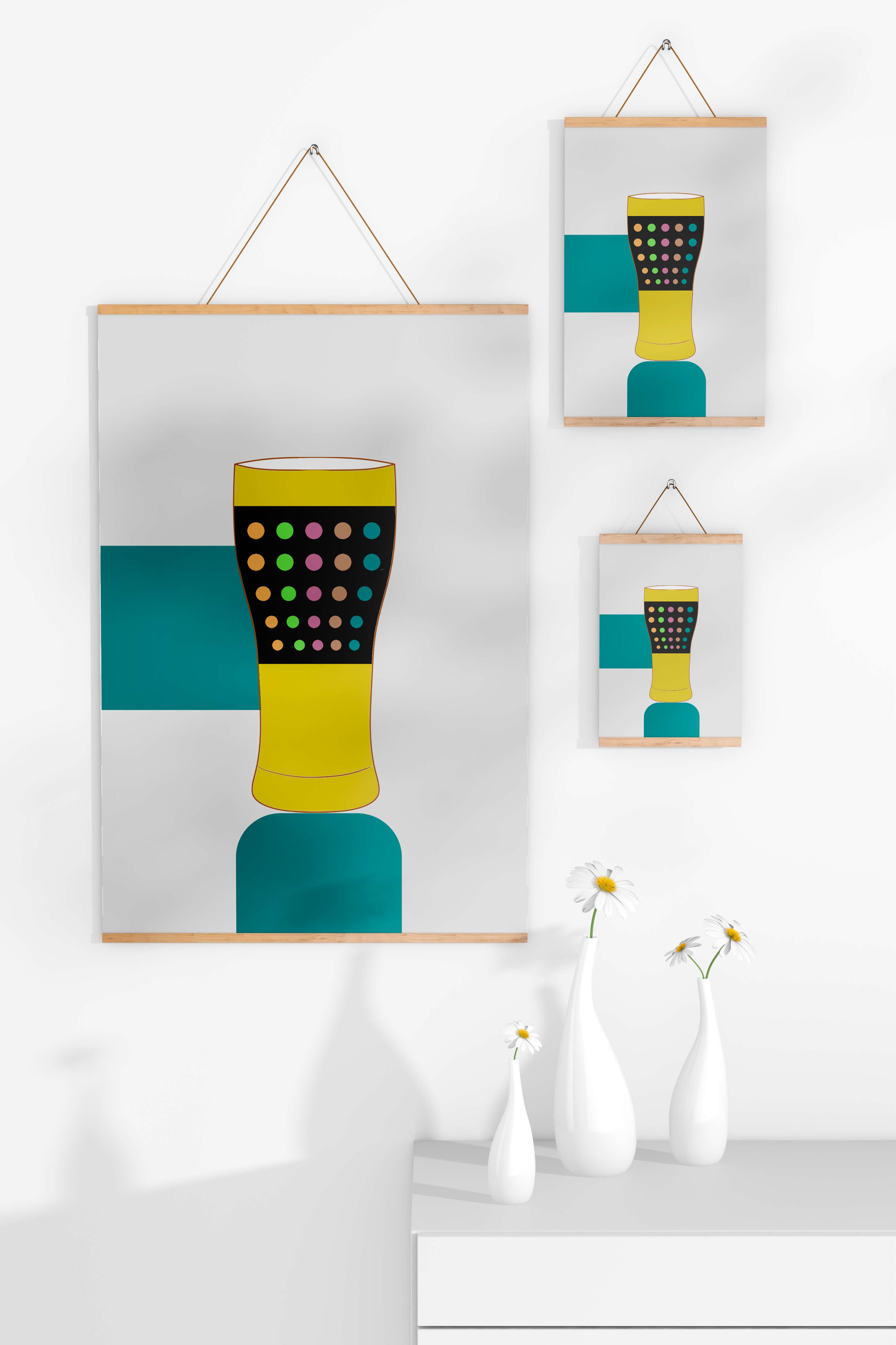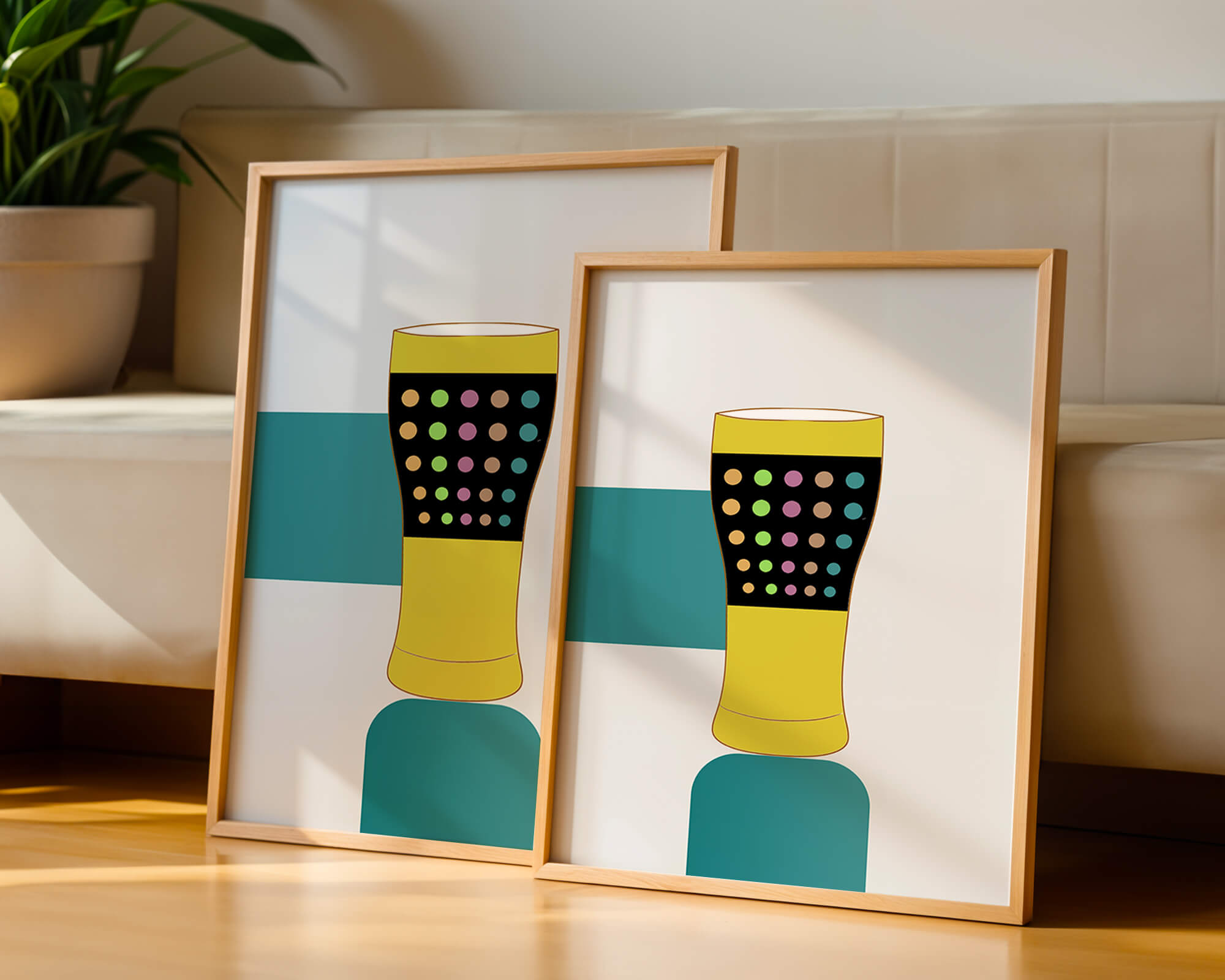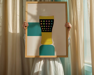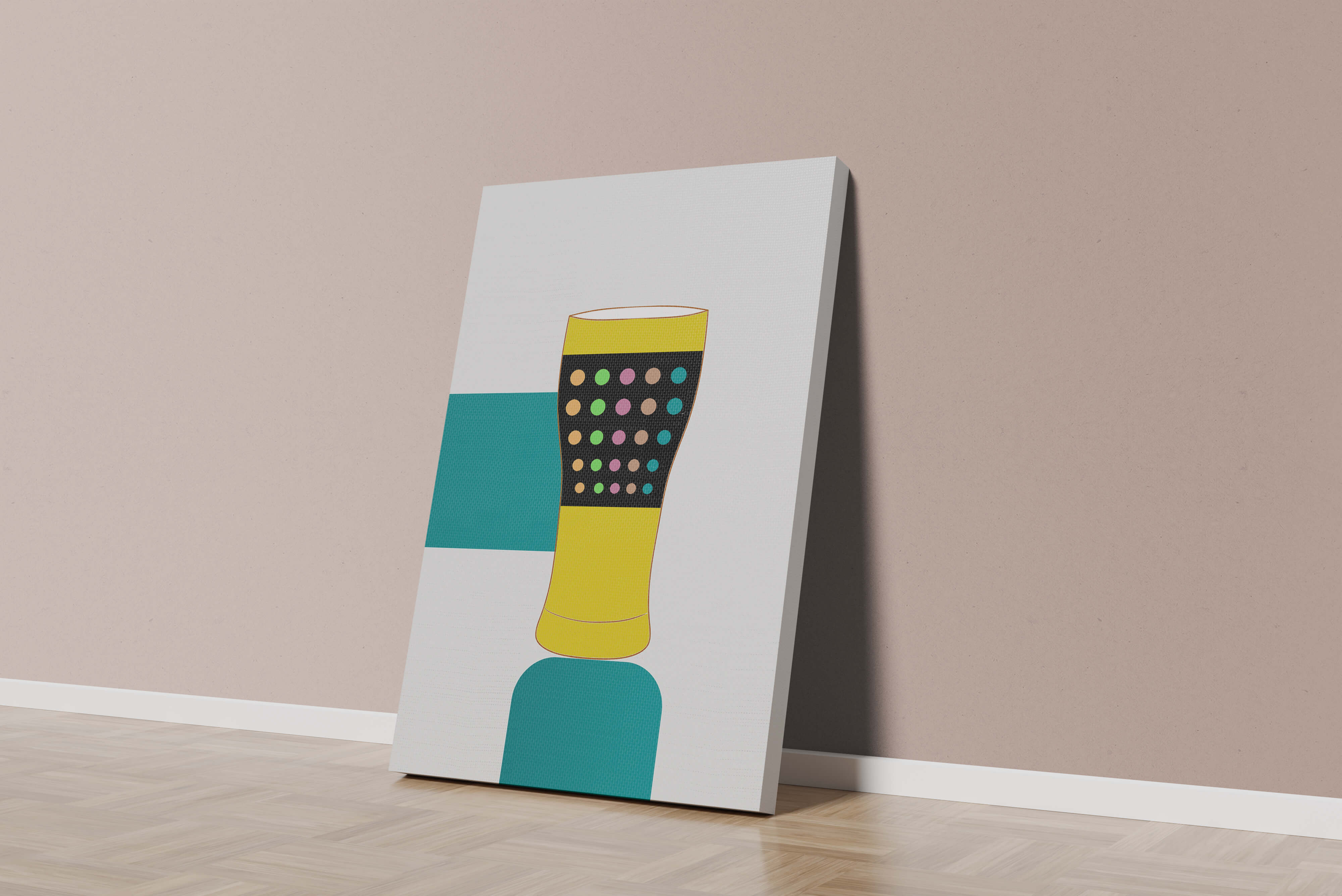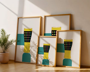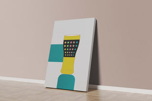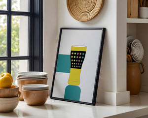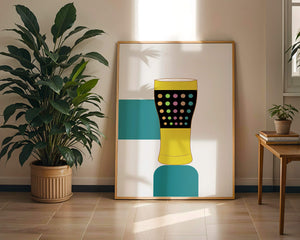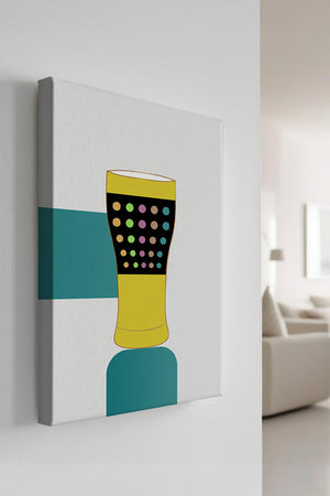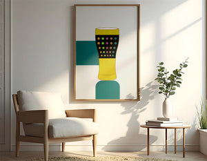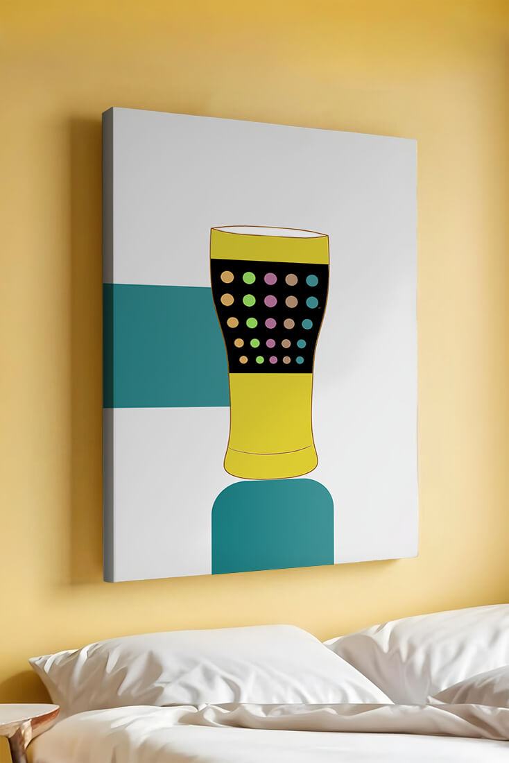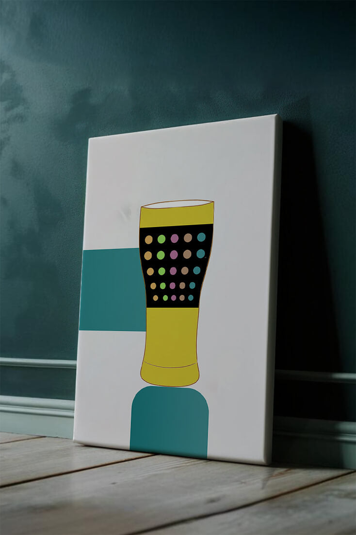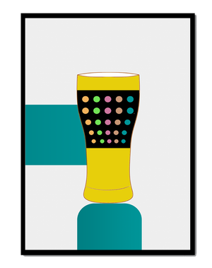 The illustration highlights a colorful pint glass set against a minimalistic background. The glass is adorned with a series of multicolored dots, creating a lively and dynamic visual appeal. The yellow and black elements contrast with the playful polka dot design, embodying both modern and artistic sensibilities.The use of bold and vivid colors makes this design an eye-catching piece, ideal for various settings such as a bar or a kitchen. The combination of simplicity and complexity in the design offers versatility, making it suitable for enhancing contemporary home decor or adding a splash of creativity to any room.| Type |
