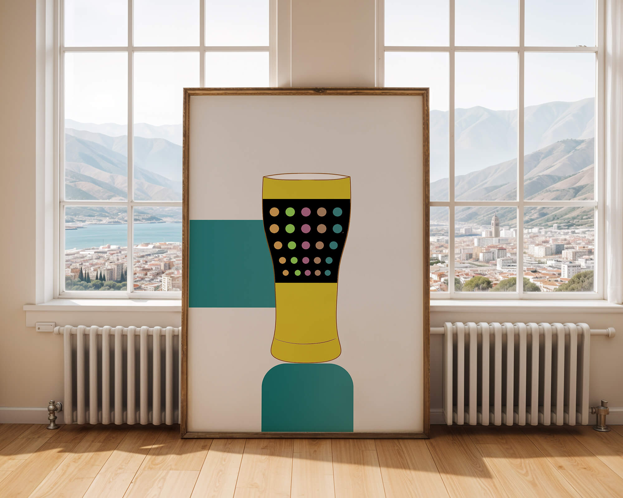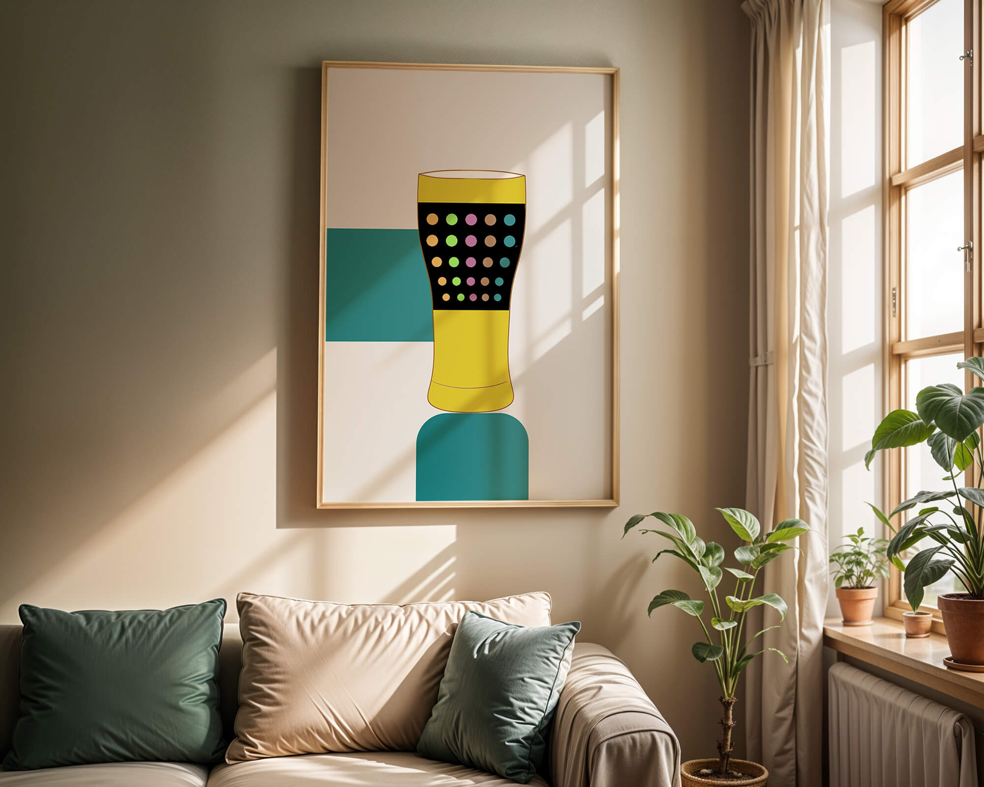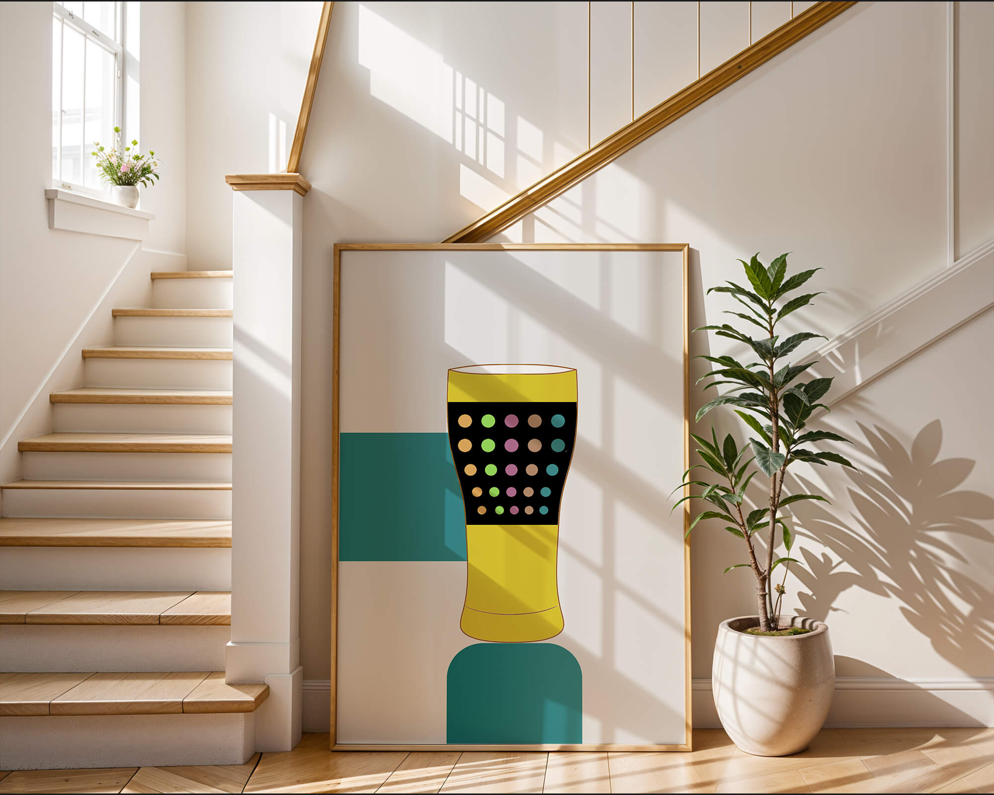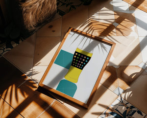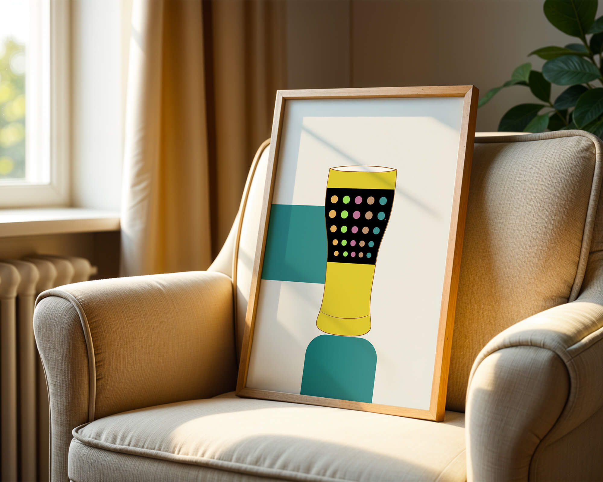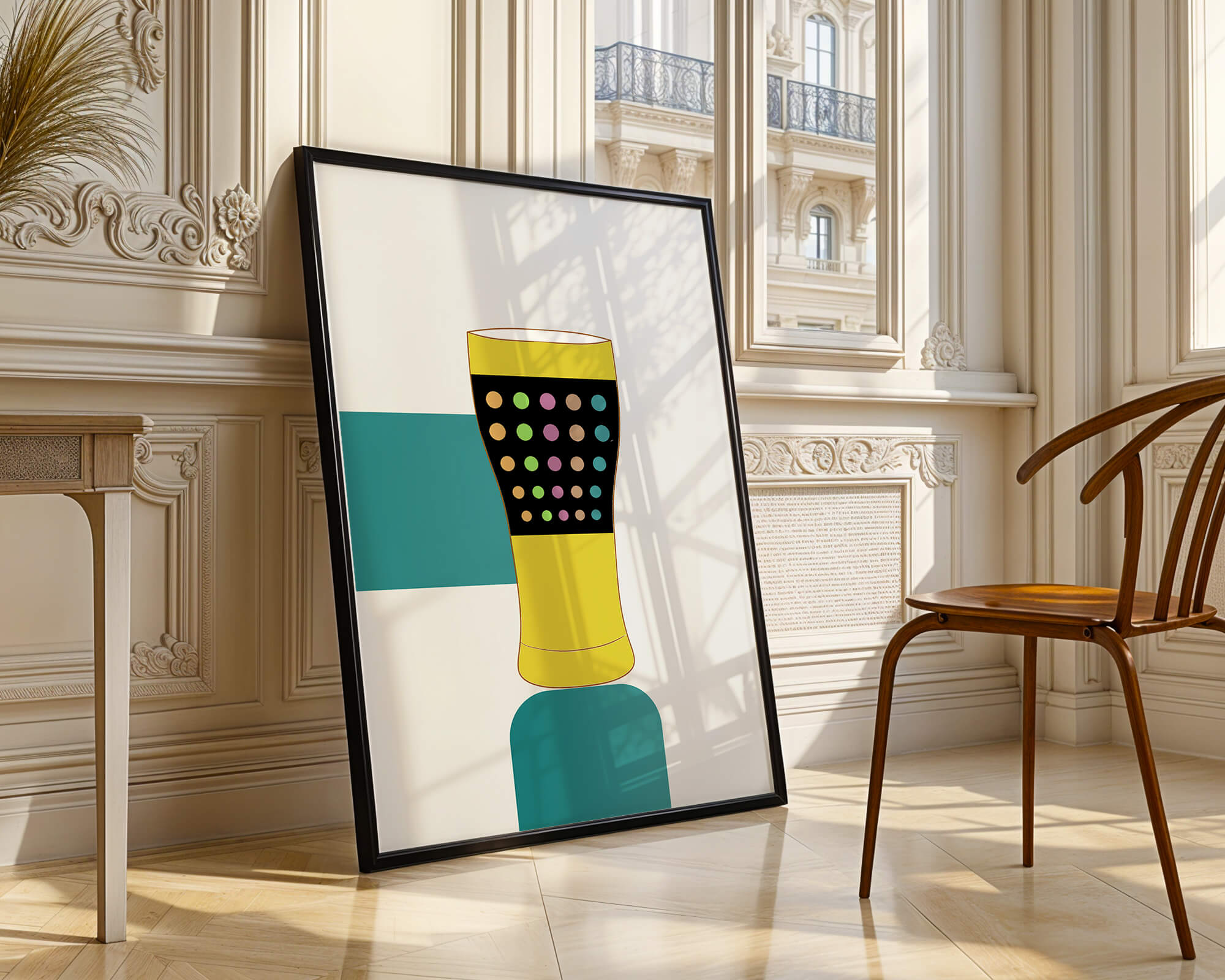 The illustration highlights a colorful pint glass set against a minimalistic background. The glass is adorned with a series of multicolored dots, creating a lively and dynamic visual appeal. The yellow and black elements contrast with the playful polka dot design, embodying both modern and artistic sensibilities.The use of bold and vivid colors makes this design an eye-catching piece, ideal for various settings such as a bar or a kitchen. The combination of simplicity and complexity in the design offers versatility, making it suitable for enhancing contemporary home decor or adding a splash of creativity to any room.| Type |