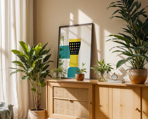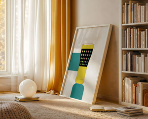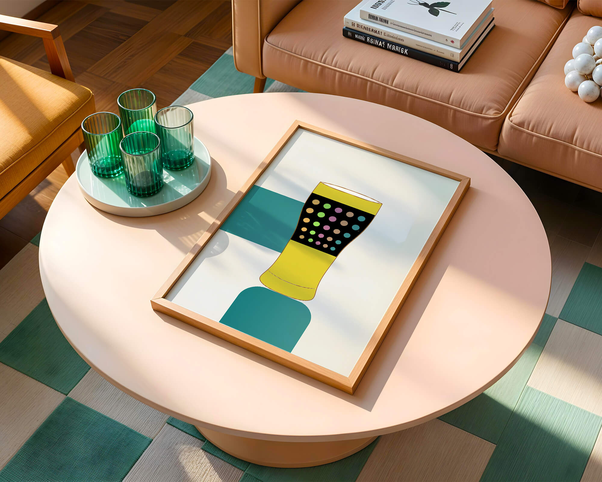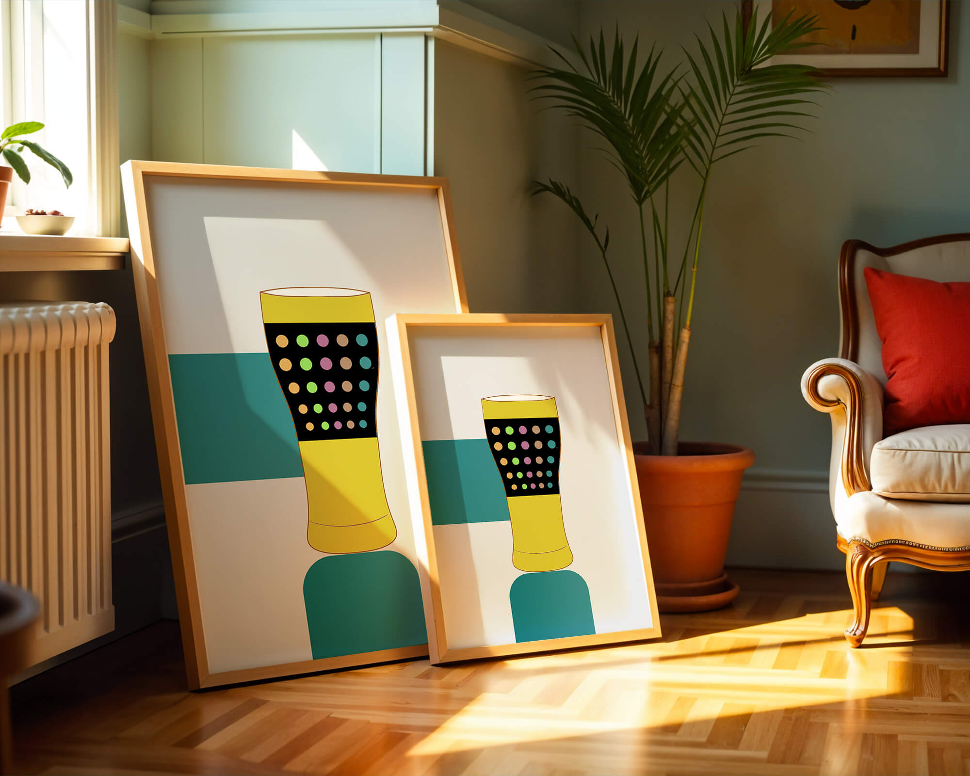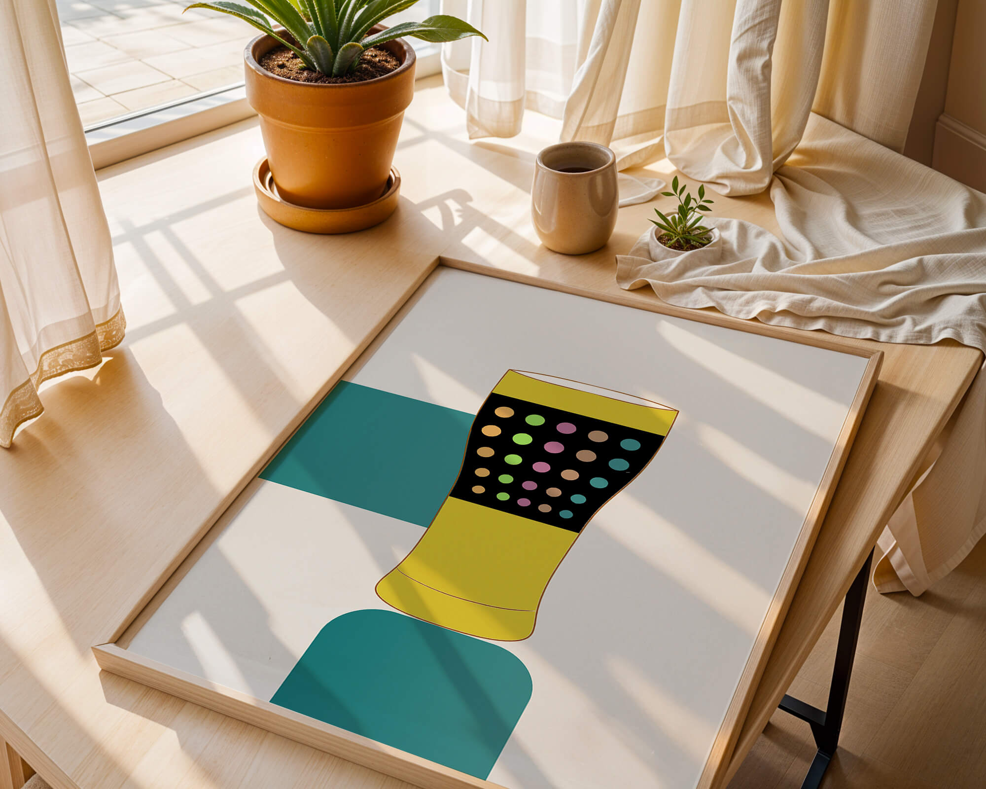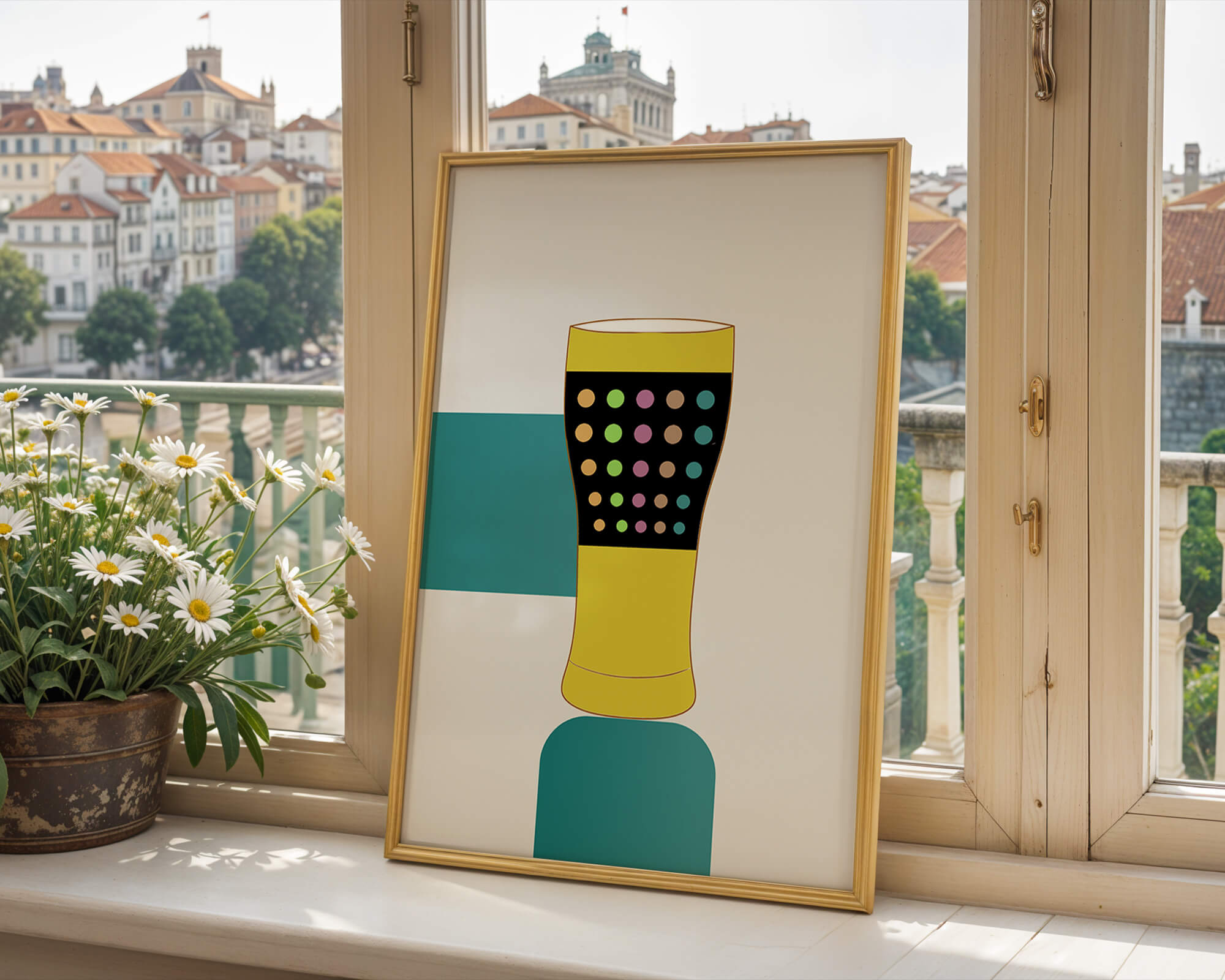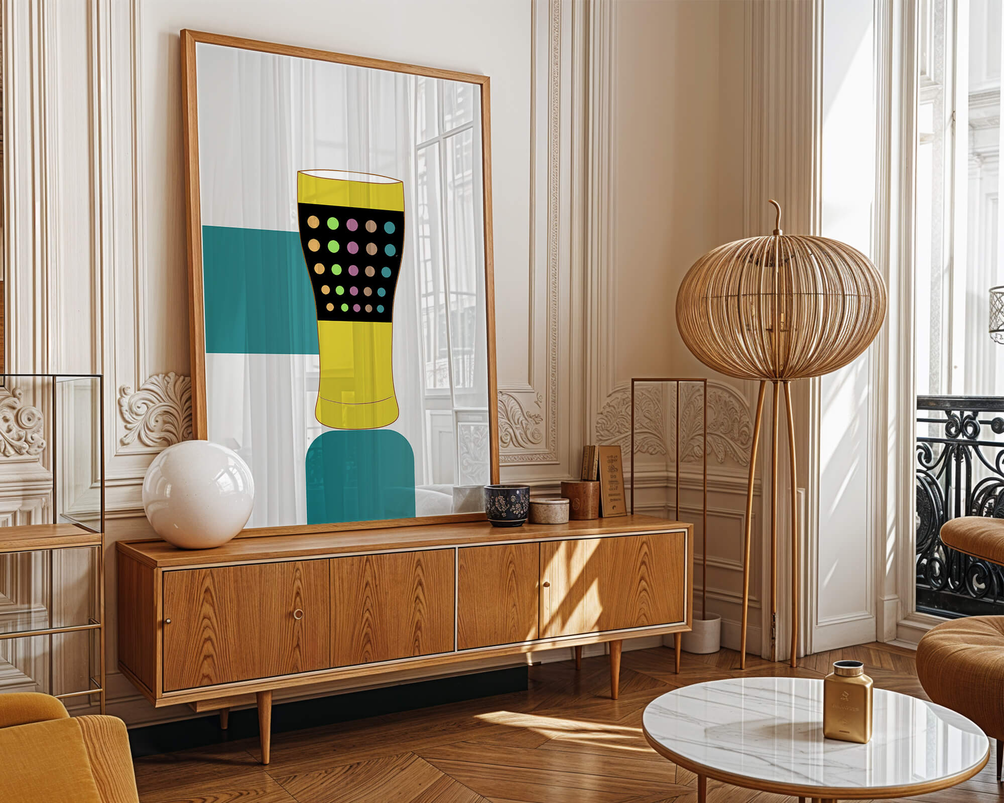 The illustration highlights a colorful pint glass set against a minimalistic background. The glass is adorned with a series of multicolored dots, creating a lively and dynamic visual appeal. The yellow and black elements contrast with the playful polka dot design, embodying both modern and artistic sensibilities.The use of bold and vivid colors makes this design an eye-catching piece, ideal for various settings such as a bar or a kitchen. The combination of simplicity and complexity in the design offers versatility, making it suitable for enhancing contemporary home decor or adding a splash of creativity to any room.| Type |