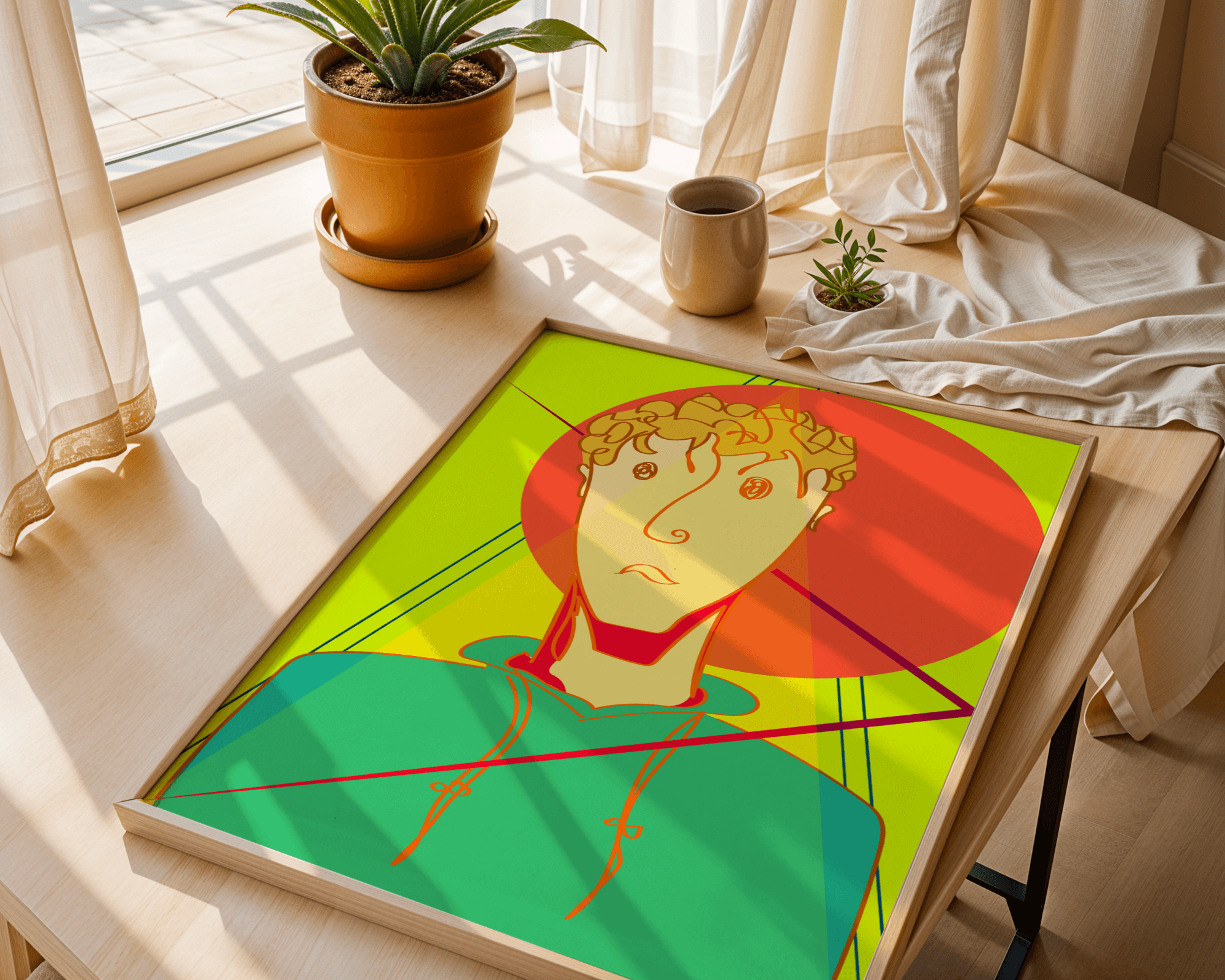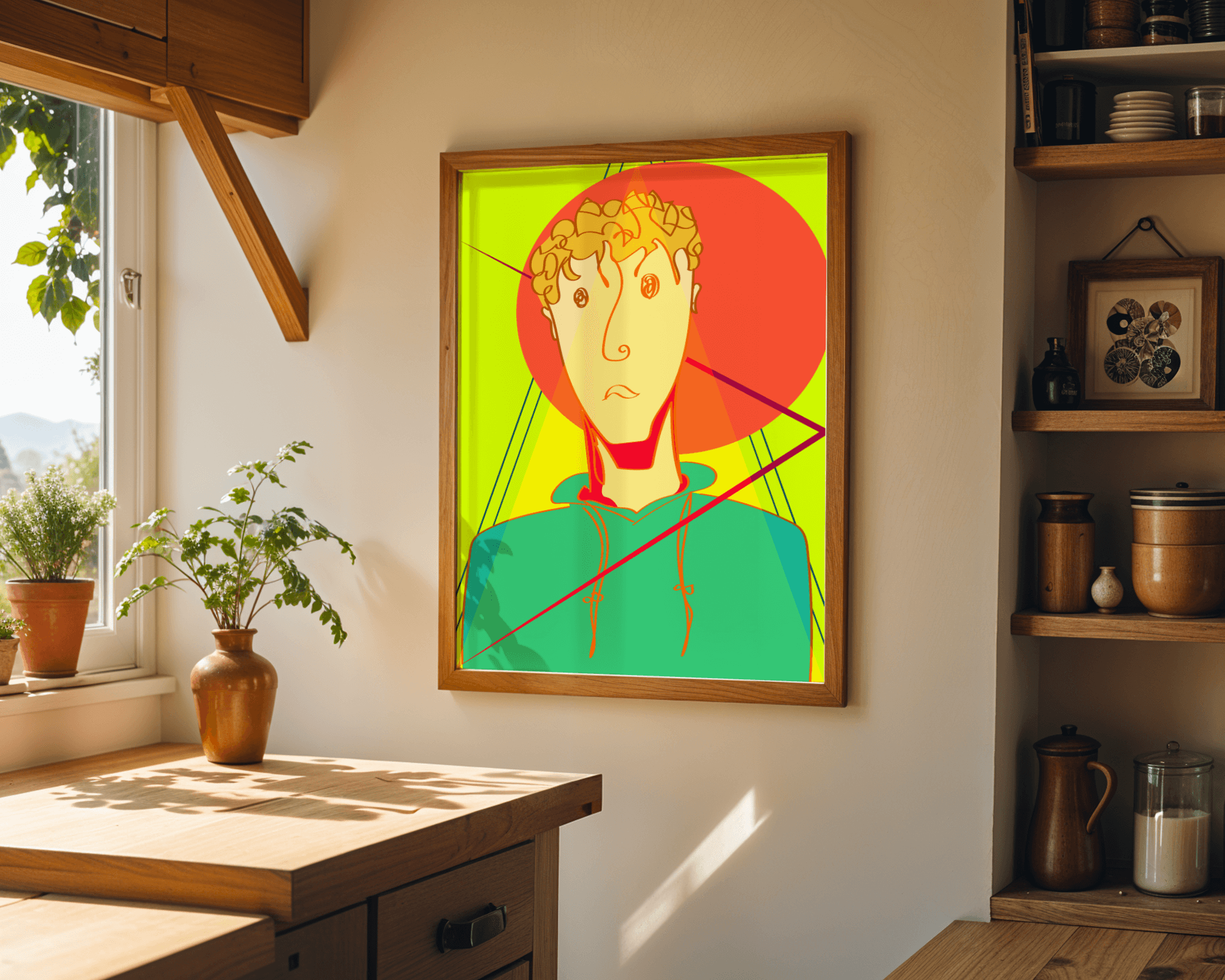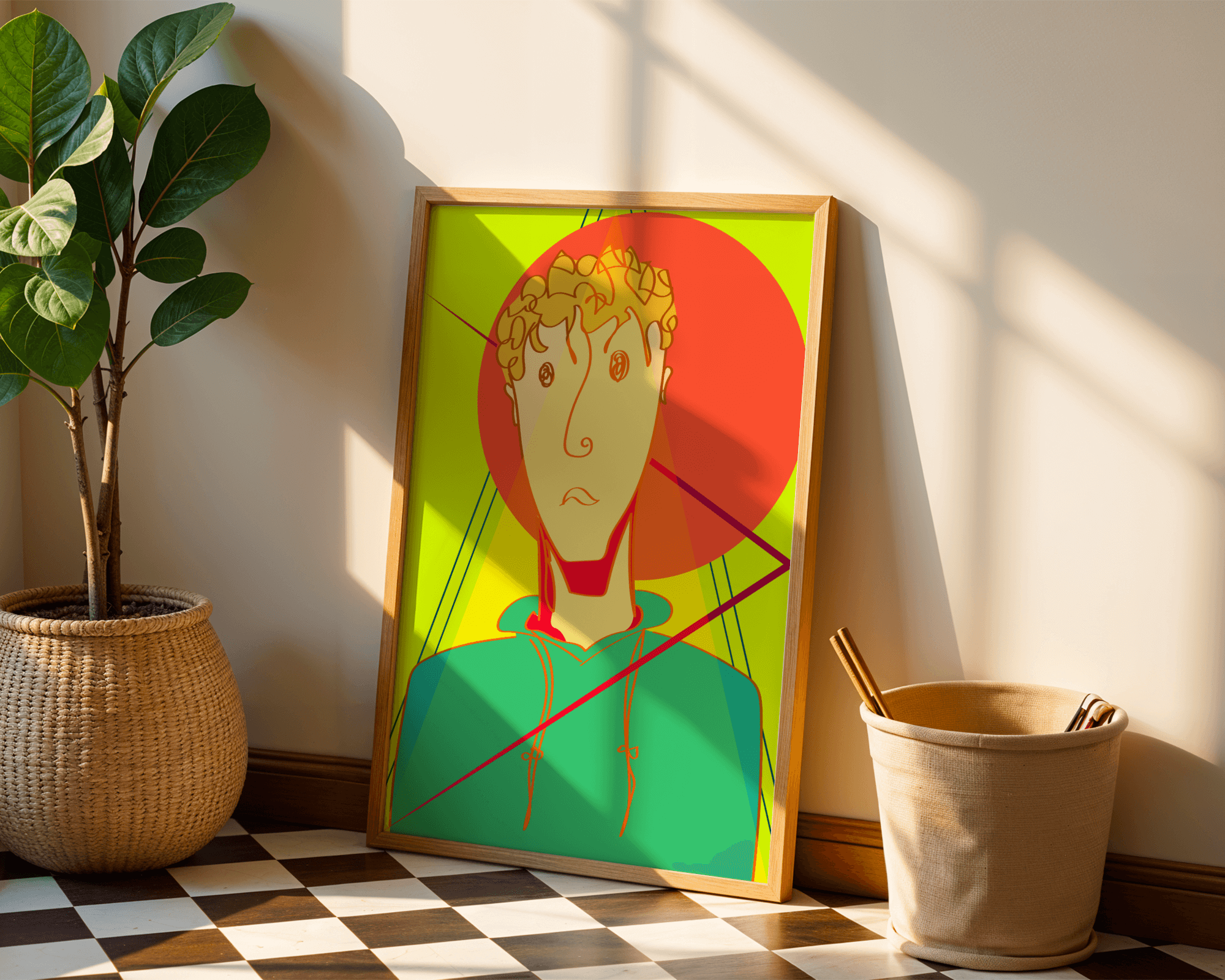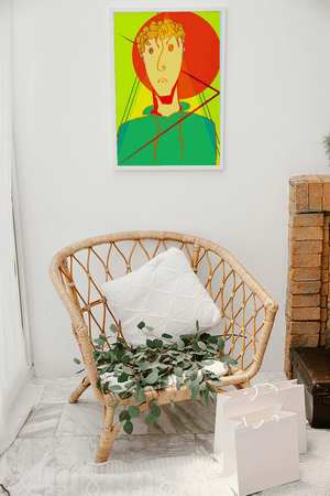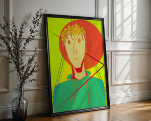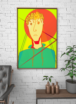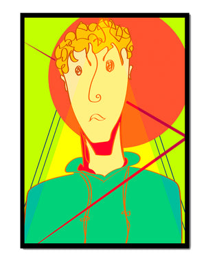 This artwork features a vibrant abstract portrait of a man, depicted with bold geometric shapes and intense colors. The dynamic contrast between the neon hues and the expressive lines creates a visually striking composition.