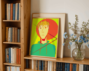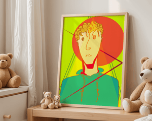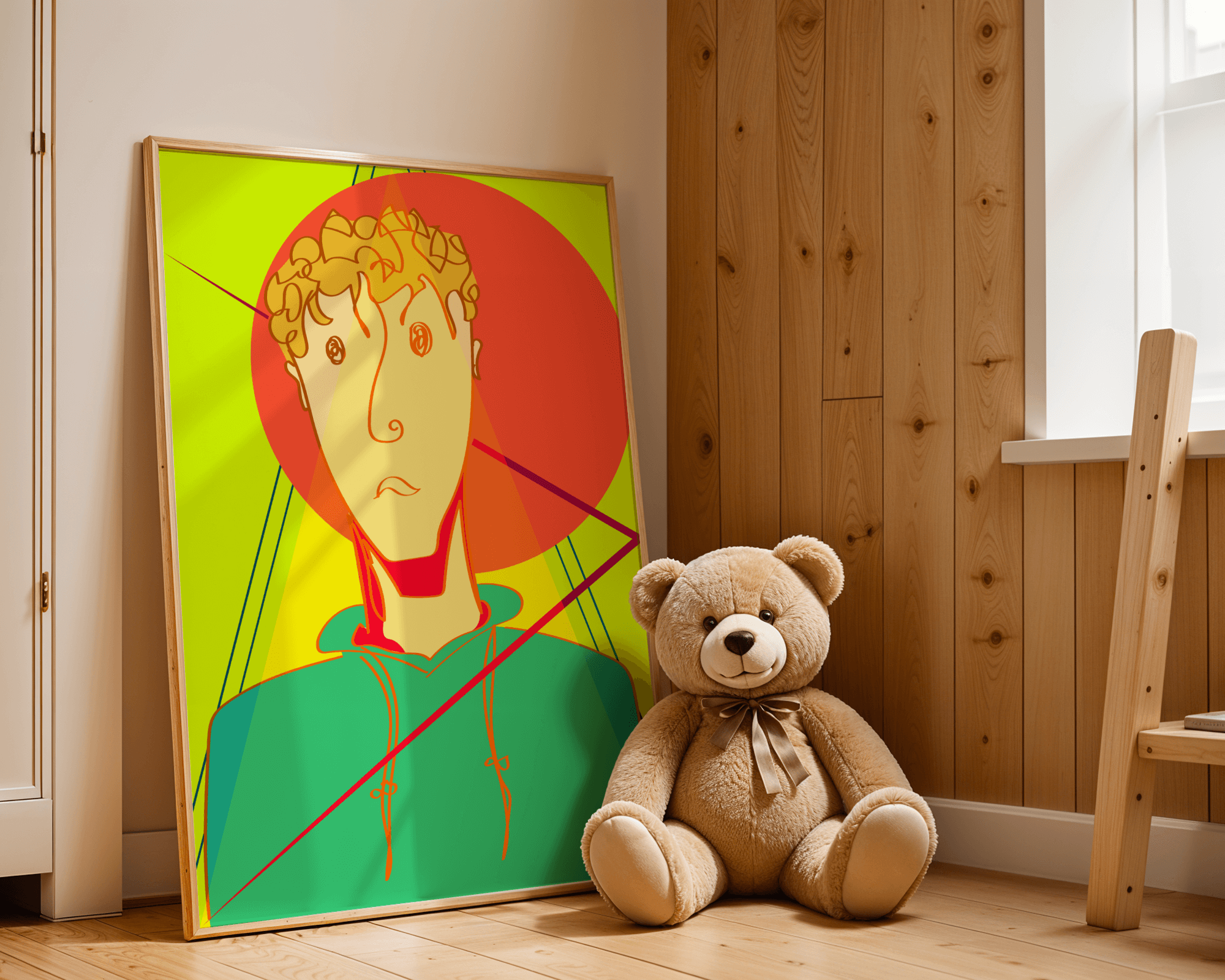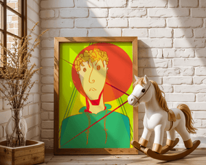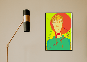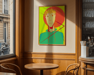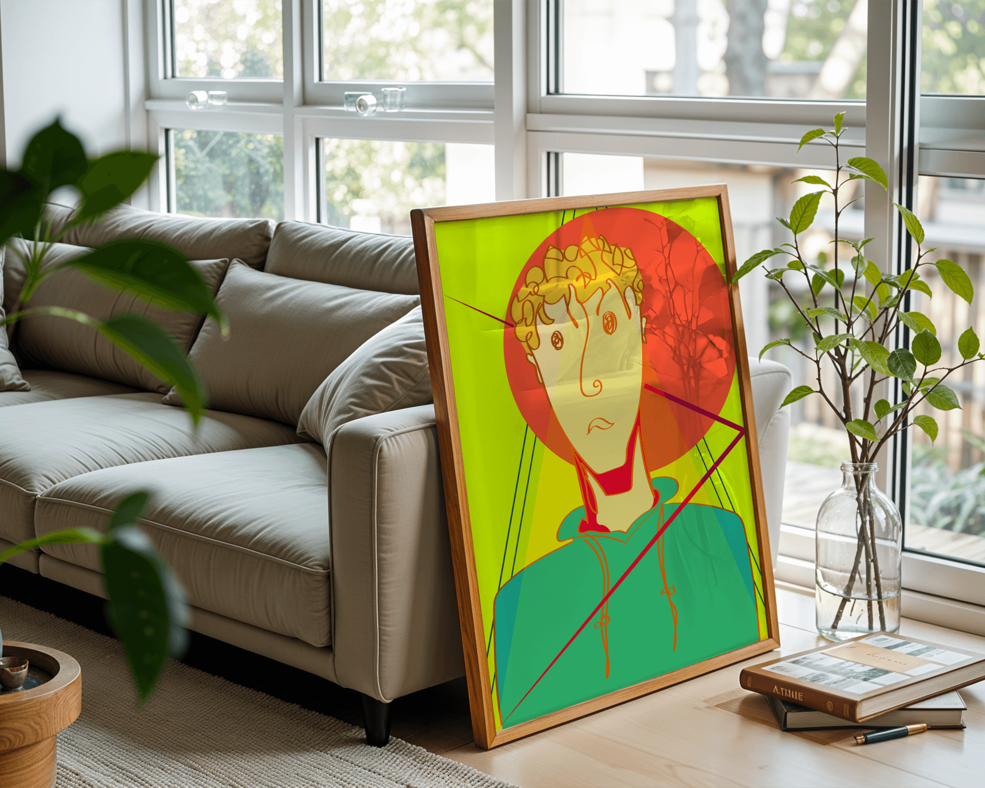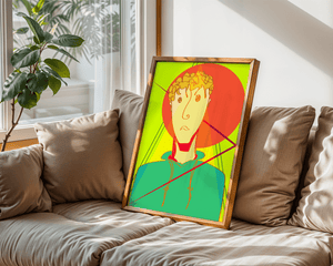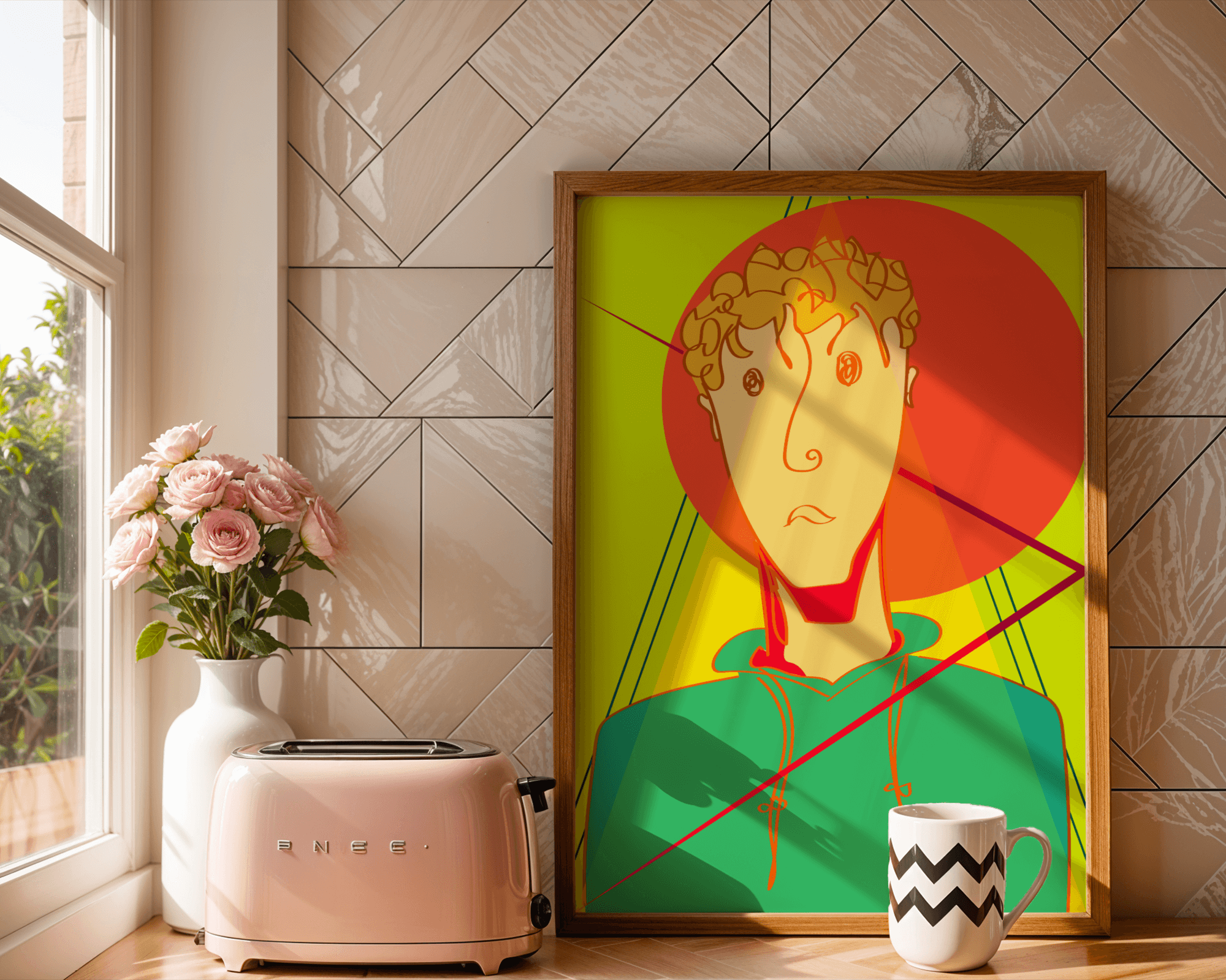 This artwork features a vibrant abstract portrait of a man, depicted with bold geometric shapes and intense colors. The dynamic contrast between the neon hues and the expressive lines creates a visually striking composition.