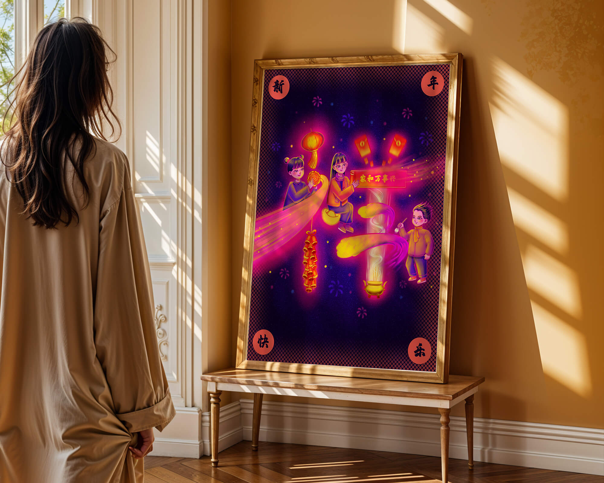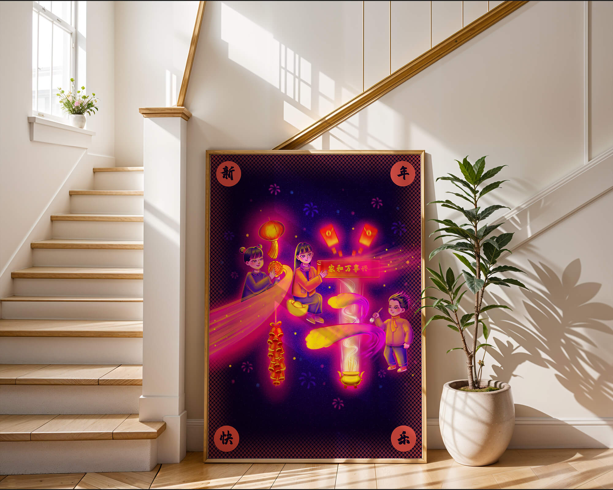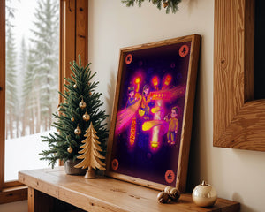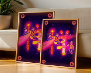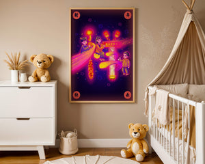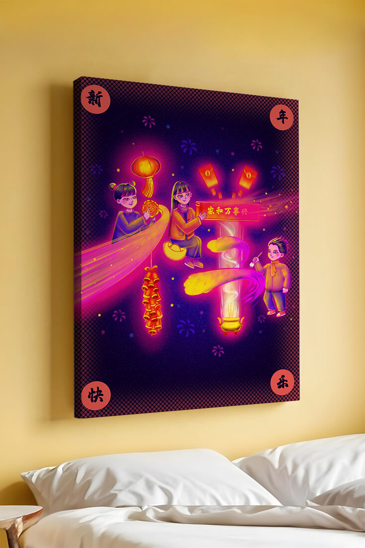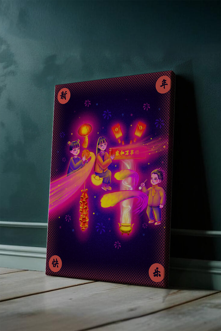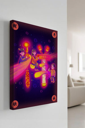 This captivating image features themes of celebration and tradition, with children holding lanterns and festive banners. The background exudes vibrancy, highlighting various symbols of joy and festivity, including fireworks and colorful lights that illuminate the scene.The artwork is perfect for adding a touch of cultural richness and celebration to any living space. The bright colors and playful elements convey a sense of warmth and happiness, making it a suitable piece for holiday decor or everyday enjoyment. The depiction of lanterns and traditional symbols emphasizes a connection to cultural heritage and family togetherness, bringing a sense of unity and spirit to any setting.| Type |