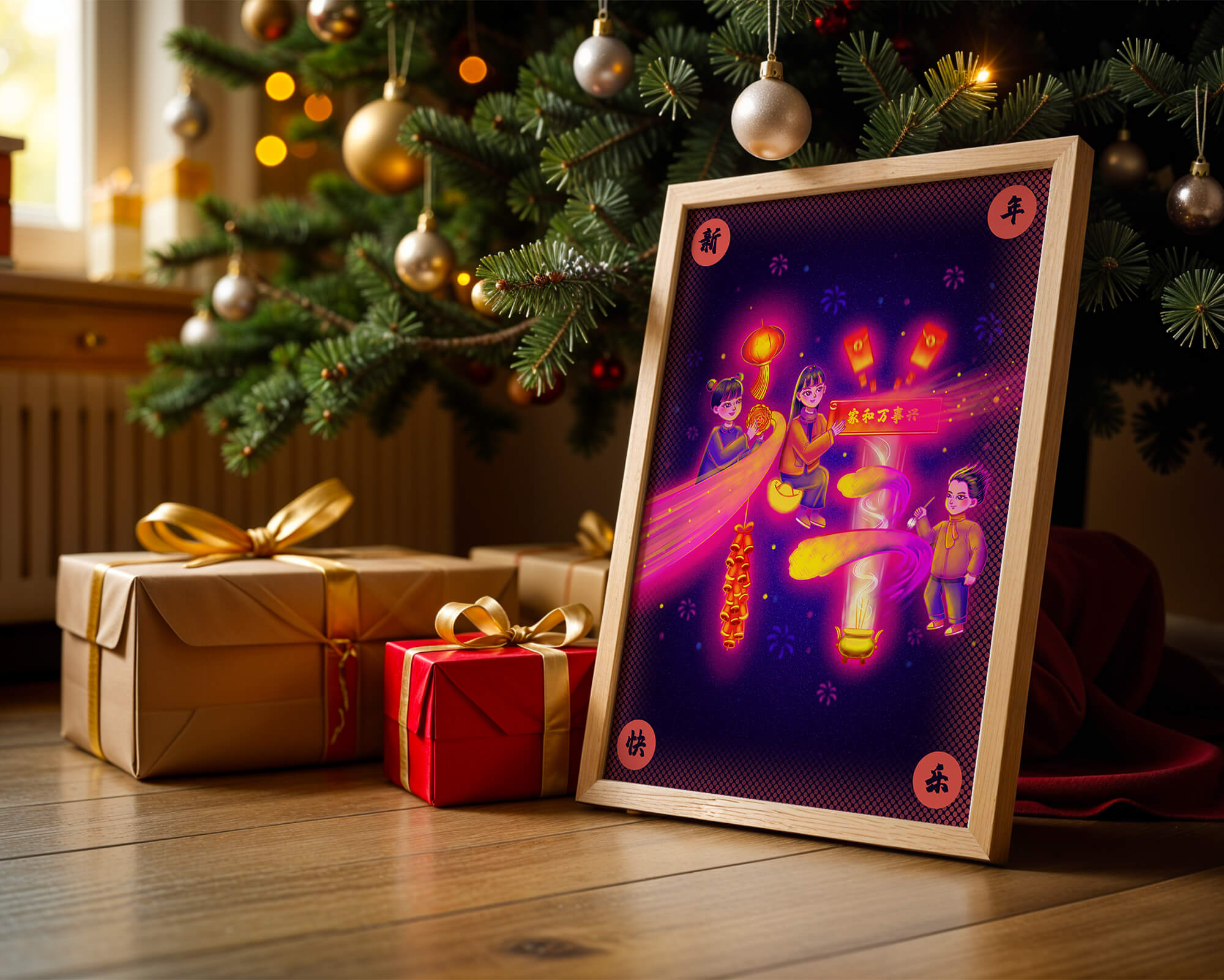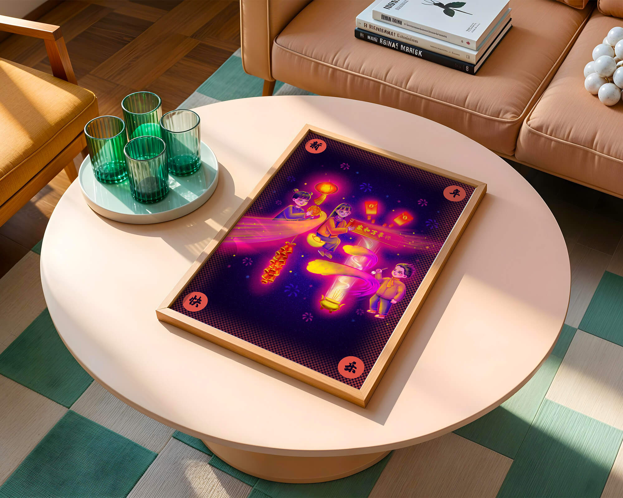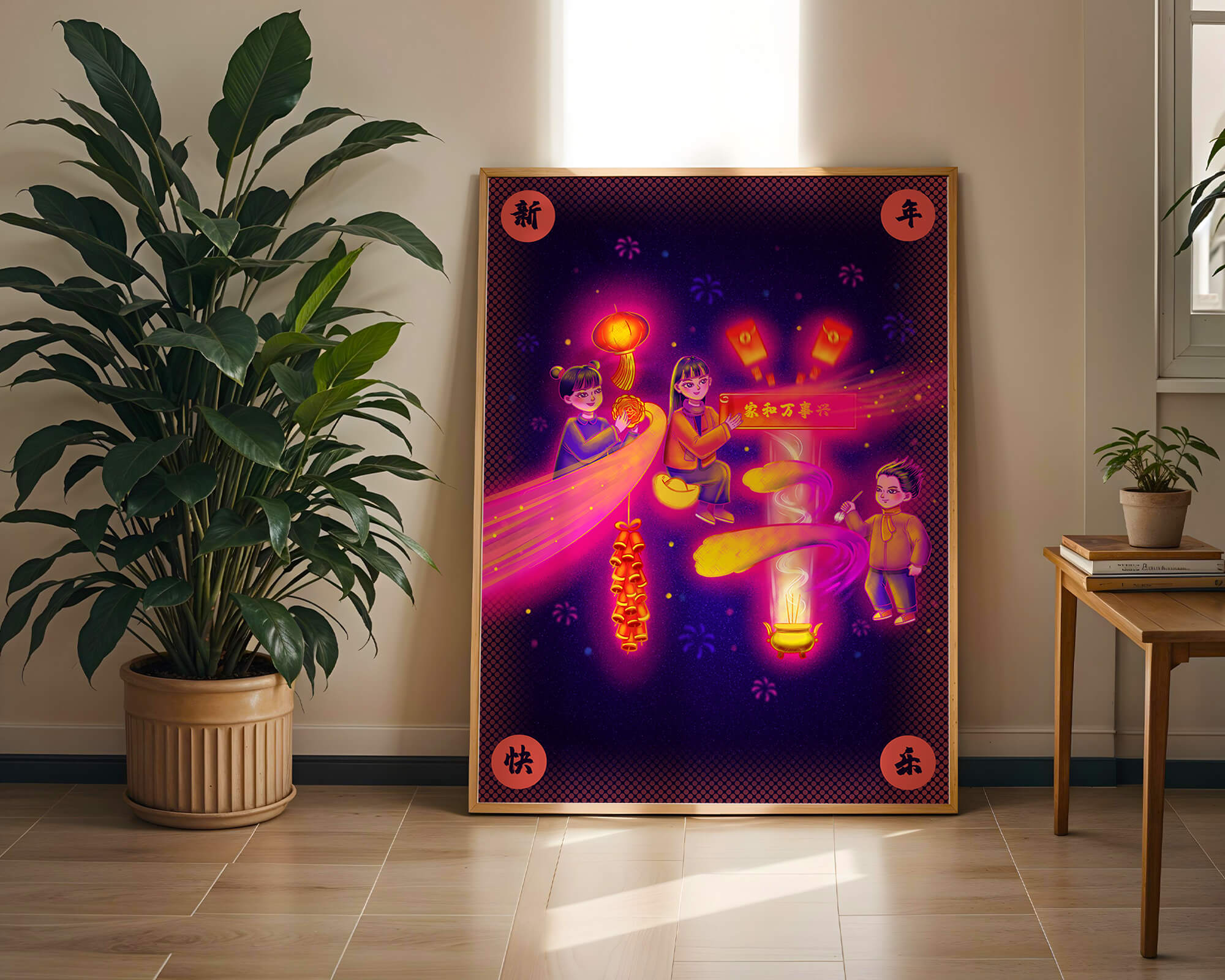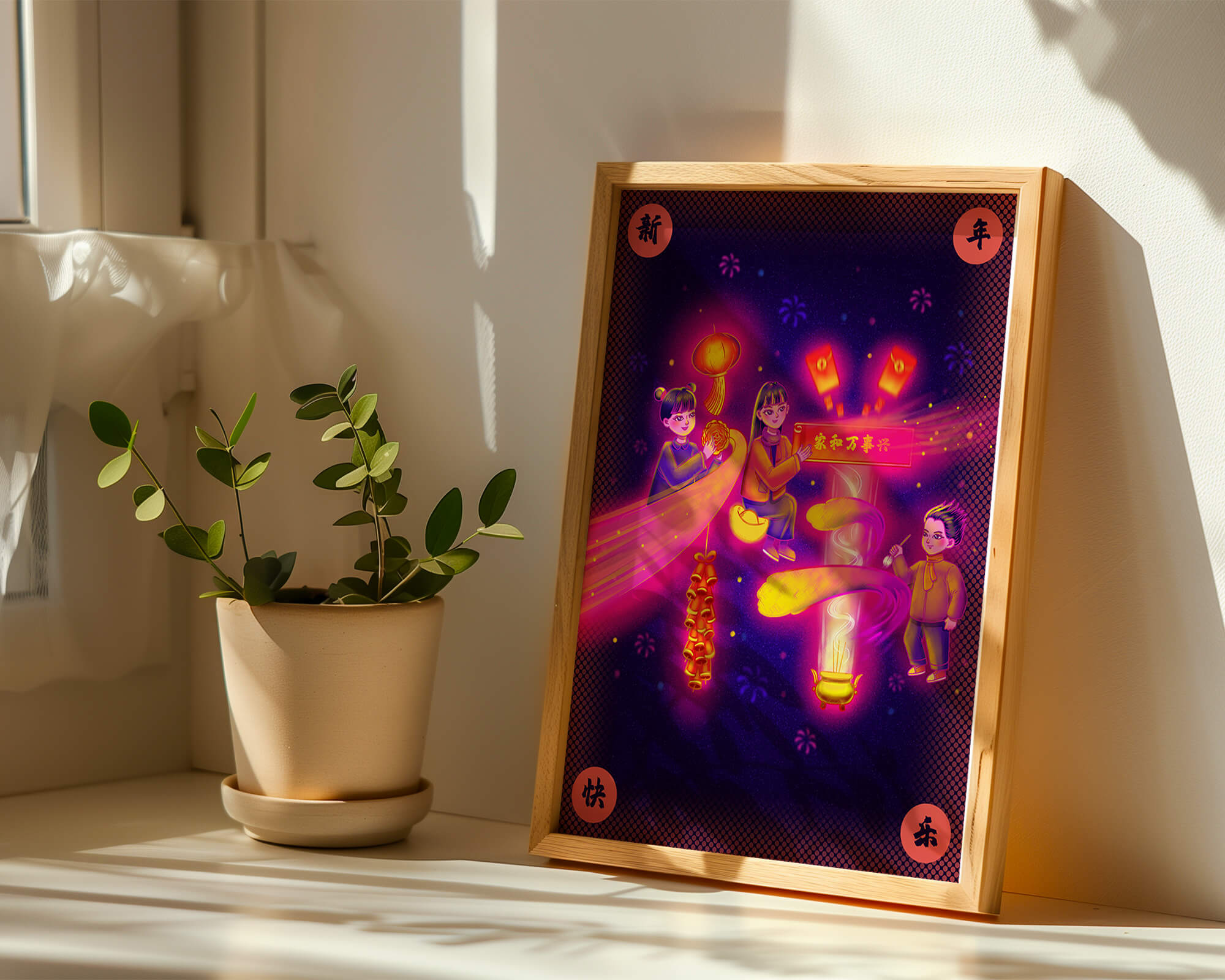 This captivating image features themes of celebration and tradition, with children holding lanterns and festive banners. The background exudes vibrancy, highlighting various symbols of joy and festivity, including fireworks and colorful lights that illuminate the scene.The artwork is perfect for adding a touch of cultural richness and celebration to any living space. The bright colors and playful elements convey a sense of warmth and happiness, making it a suitable piece for holiday decor or everyday enjoyment. The depiction of lanterns and traditional symbols emphasizes a connection to cultural heritage and family togetherness, bringing a sense of unity and spirit to any setting.| Type |