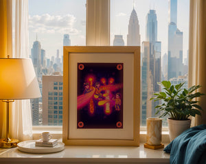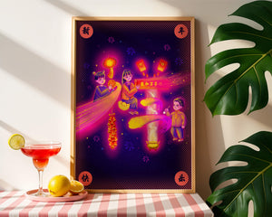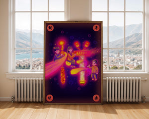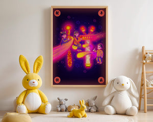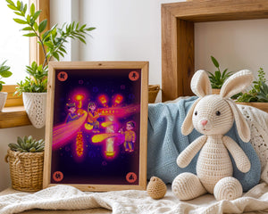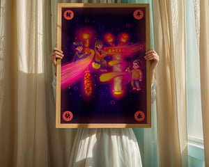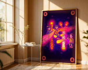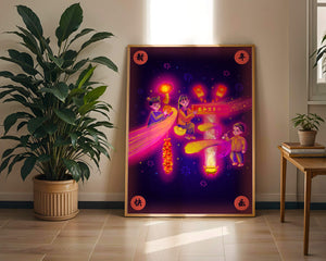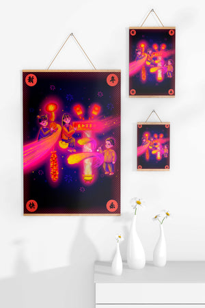This captivating image features themes of celebration and tradition, with children holding lanterns and festive banners. The background exudes vibrancy, highlighting various symbols of joy and festivity, including fireworks and colorful lights that illuminate the scene.The artwork is perfect for adding a touch of cultural richness and celebration to any living space. The bright colors and playful elements convey a sense of warmth and happiness, making it a suitable piece for holiday decor or everyday enjoyment. The depiction of lanterns and traditional symbols emphasizes a connection to cultural heritage and family togetherness, bringing a sense of unity and spirit to any setting.