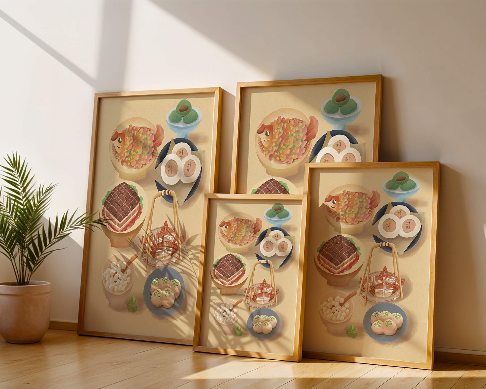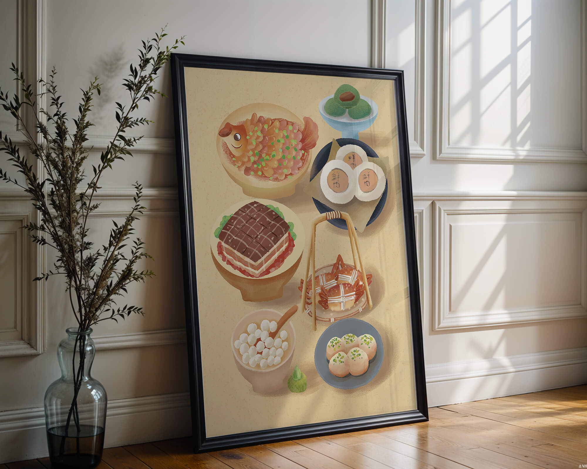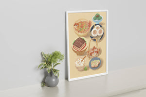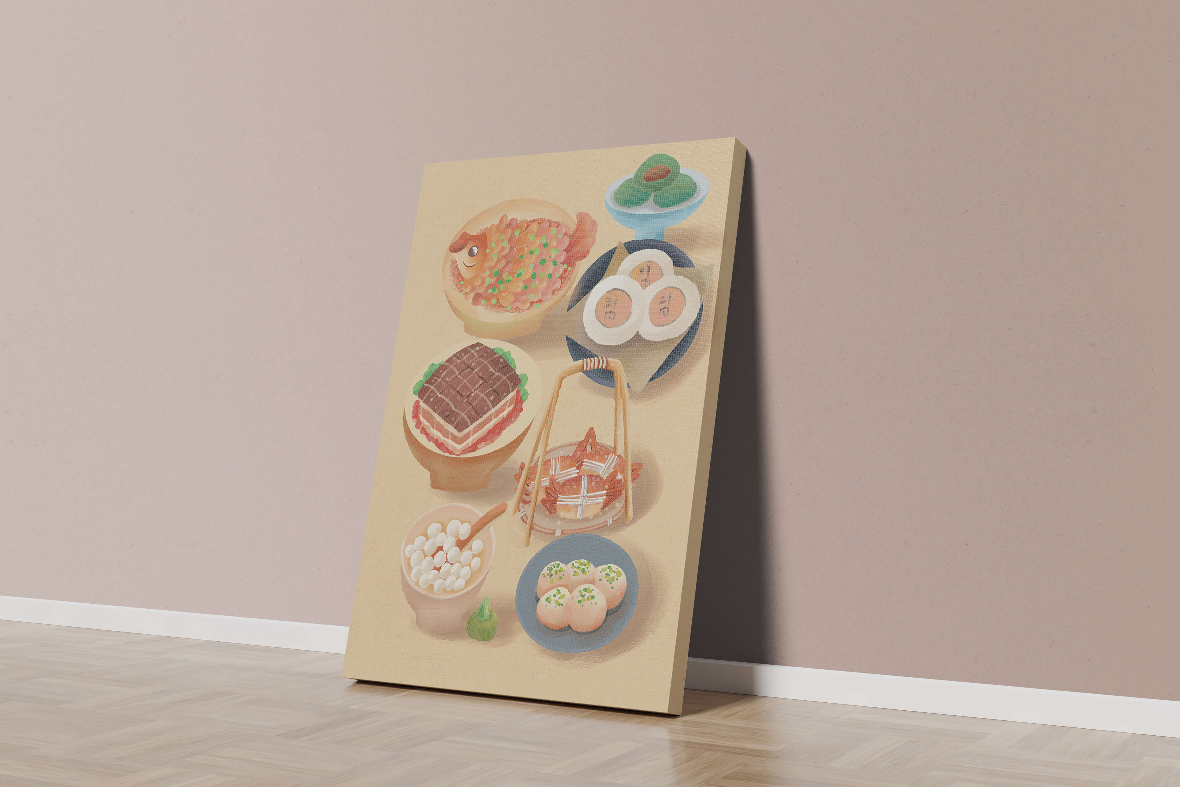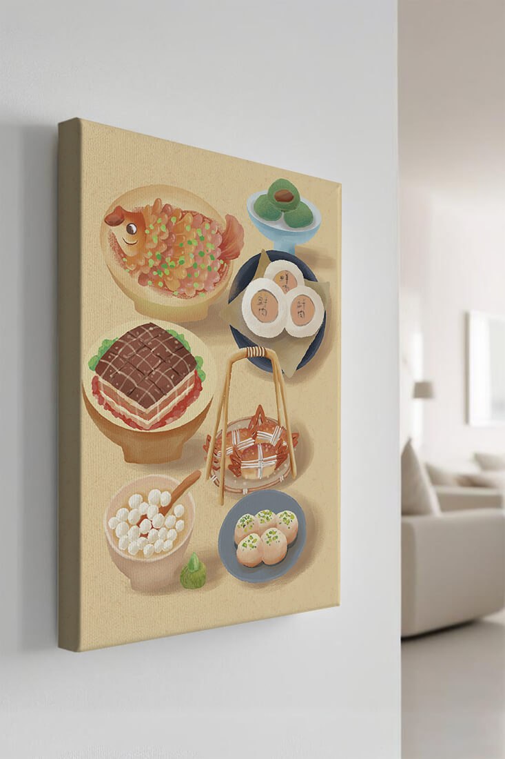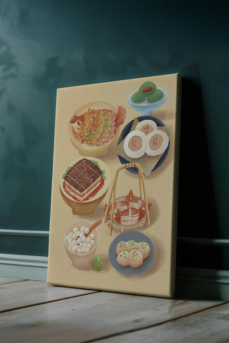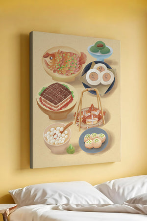 Accompanying these are delicate buns and dim sum items, each meticulously illustrated to capture their texture and appeal. The green desserts add a fresh touch to the composition, enhancing the overall vibrant and appetizing presentation of this culinary artwork.