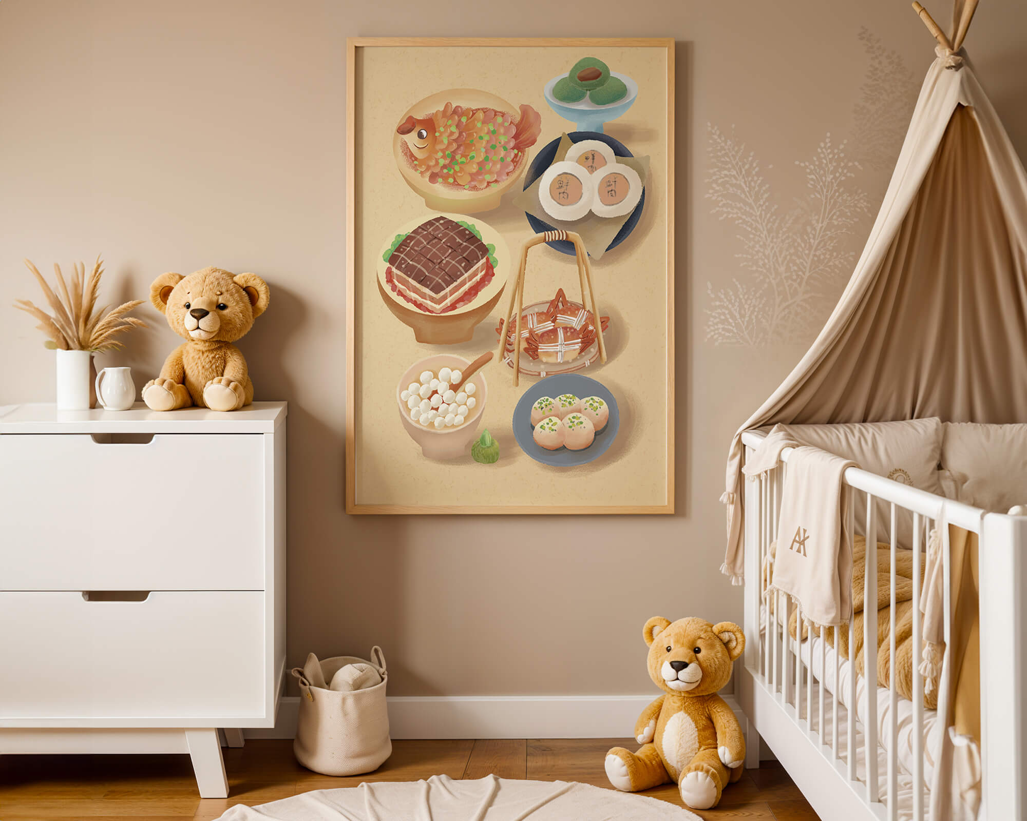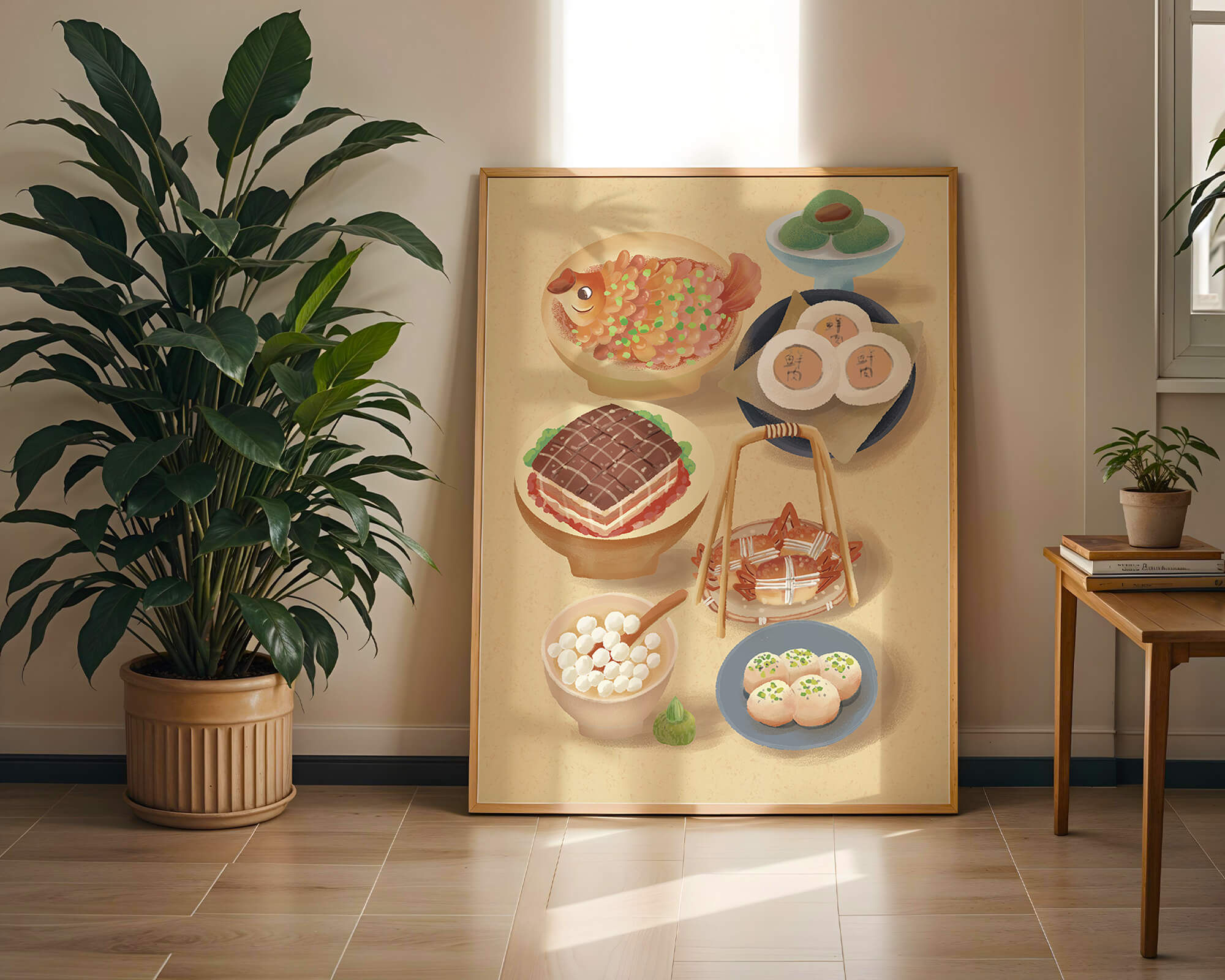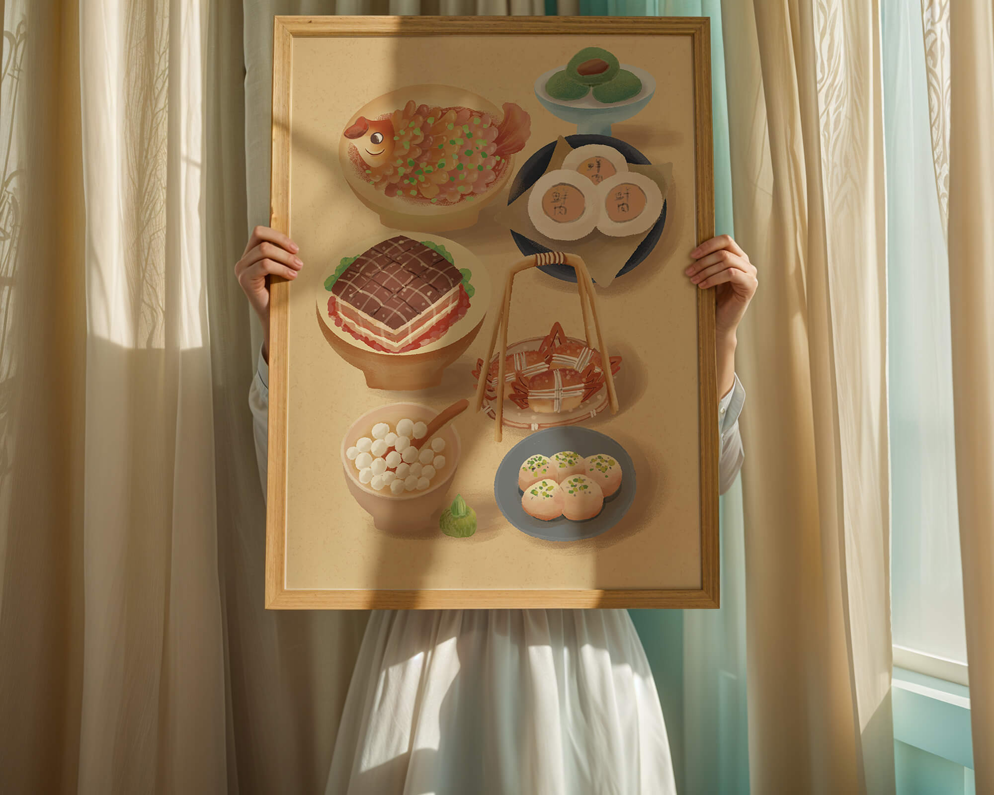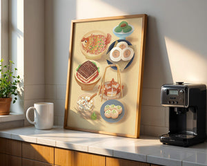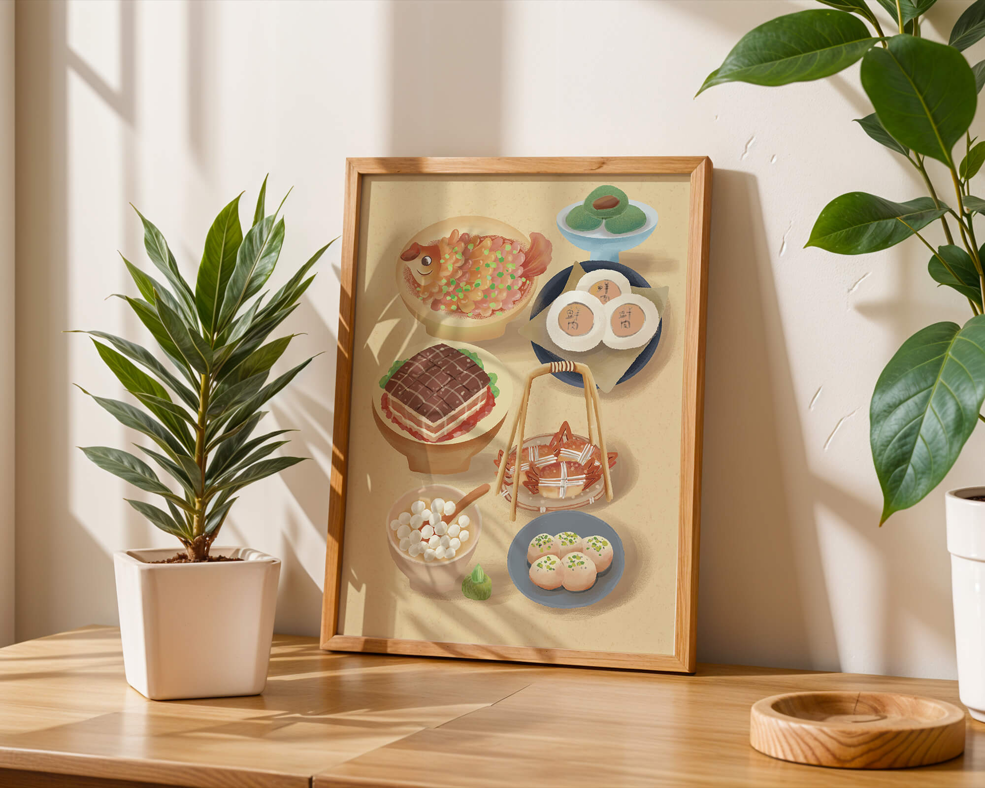 Accompanying these are delicate buns and dim sum items, each meticulously illustrated to capture their texture and appeal. The green desserts add a fresh touch to the composition, enhancing the overall vibrant and appetizing presentation of this culinary artwork.
