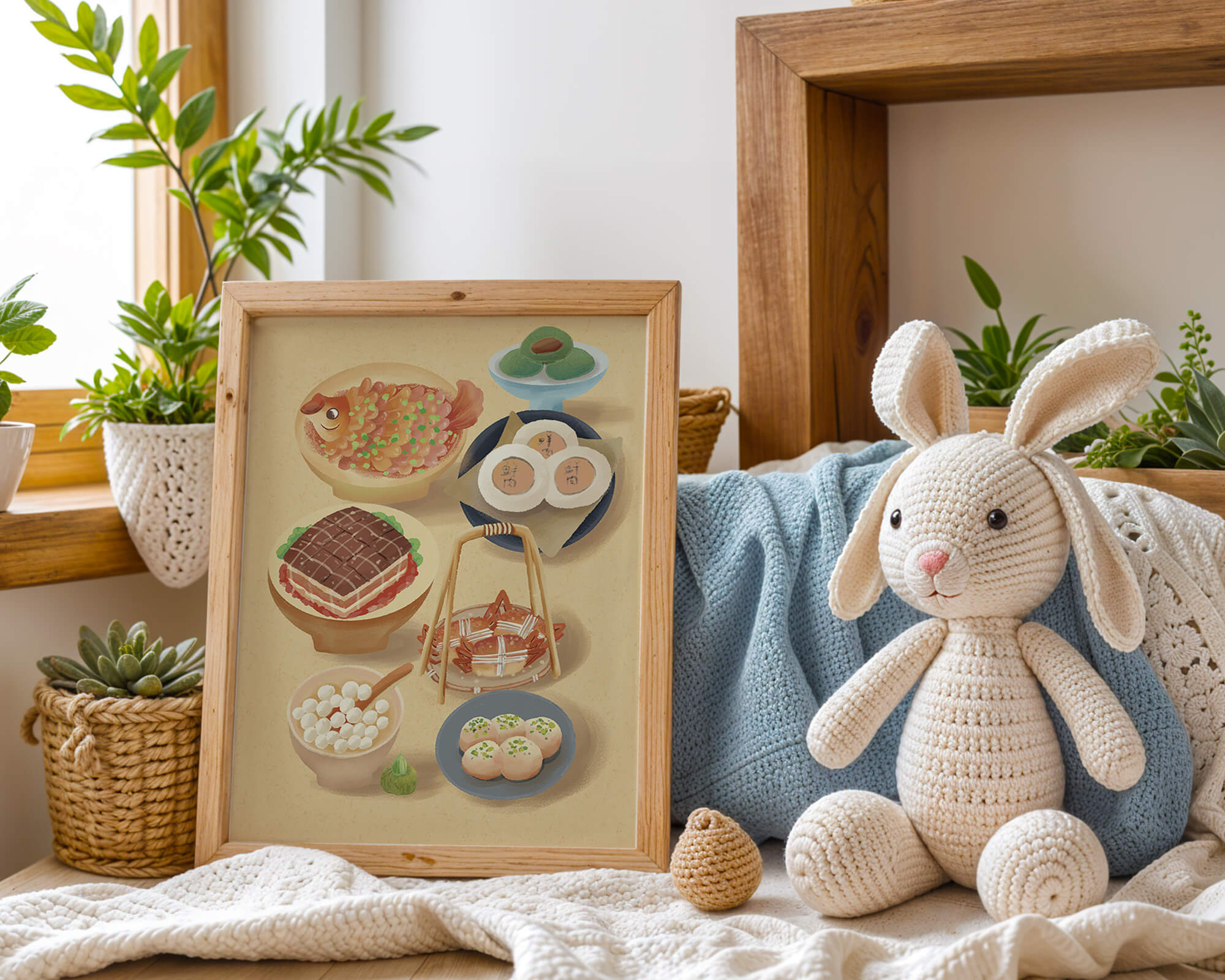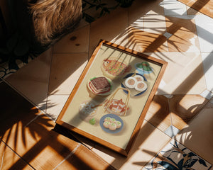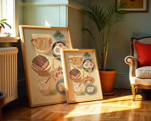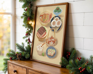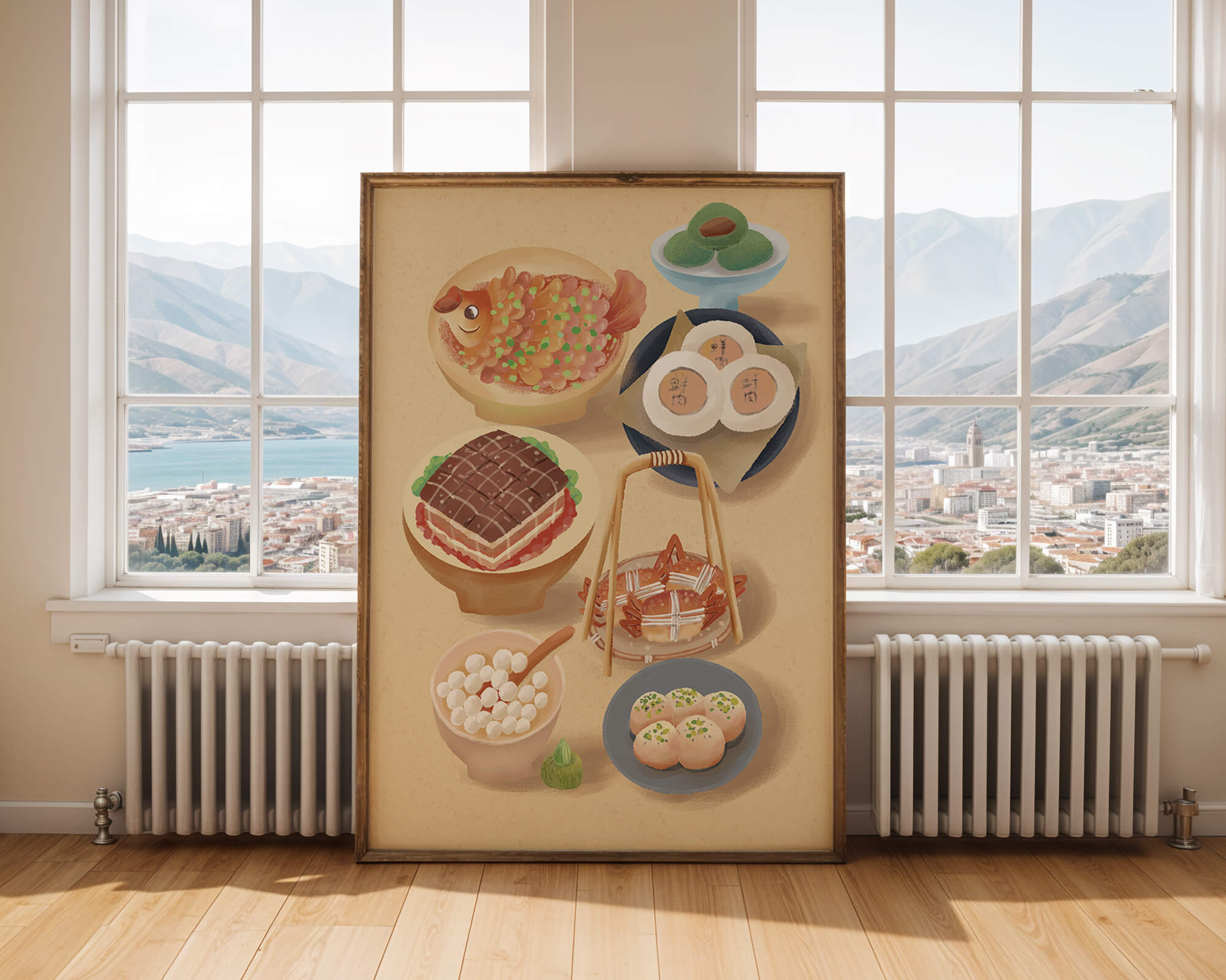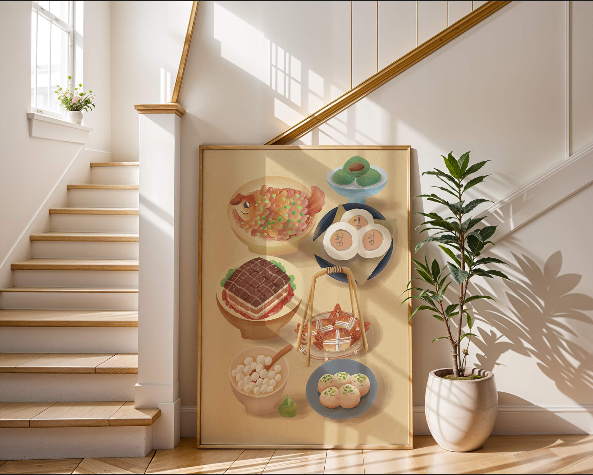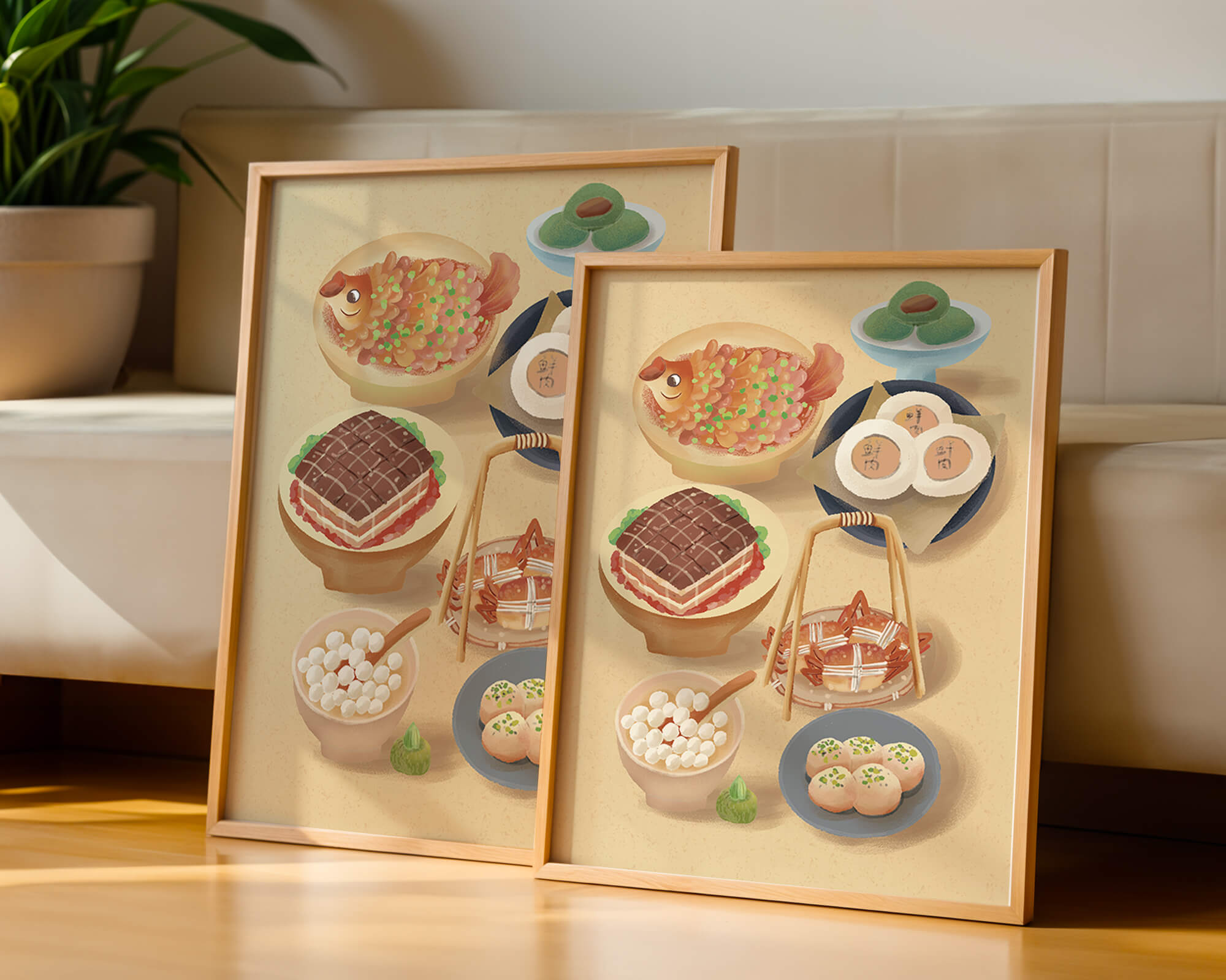 Accompanying these are delicate buns and dim sum items, each meticulously illustrated to capture their texture and appeal. The green desserts add a fresh touch to the composition, enhancing the overall vibrant and appetizing presentation of this culinary artwork.