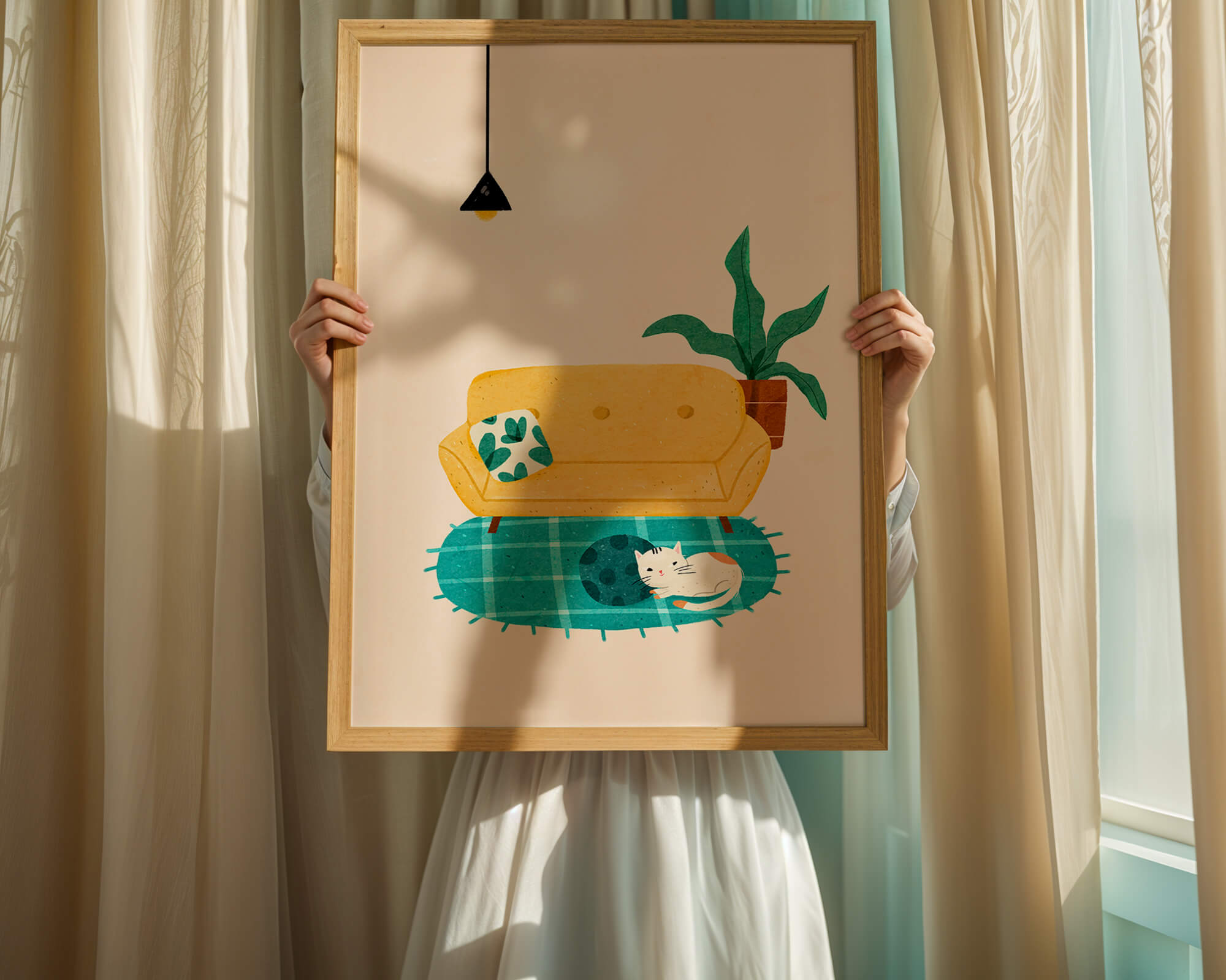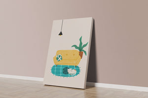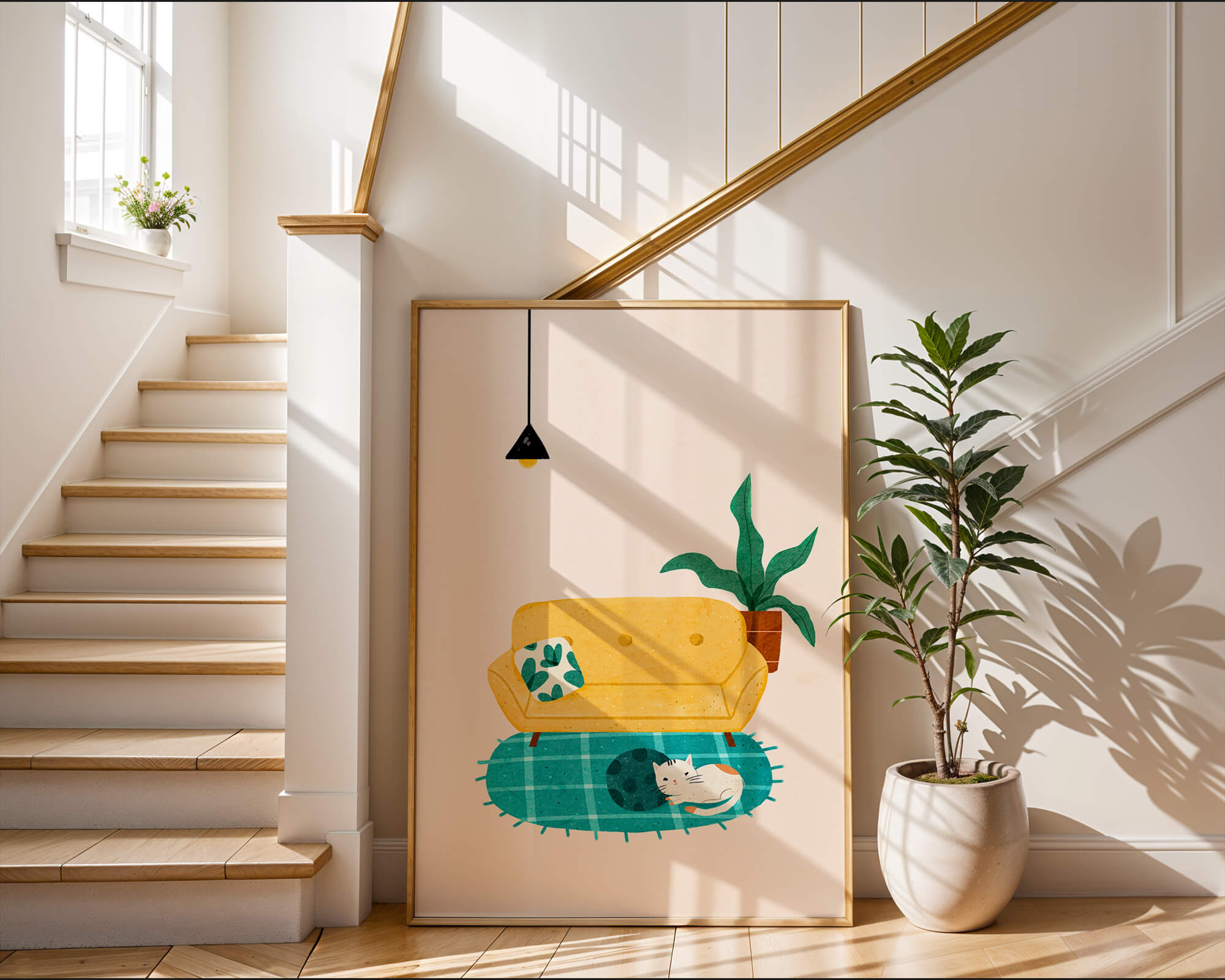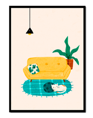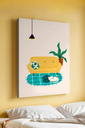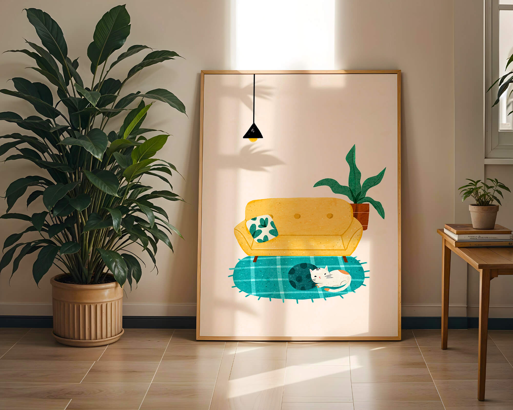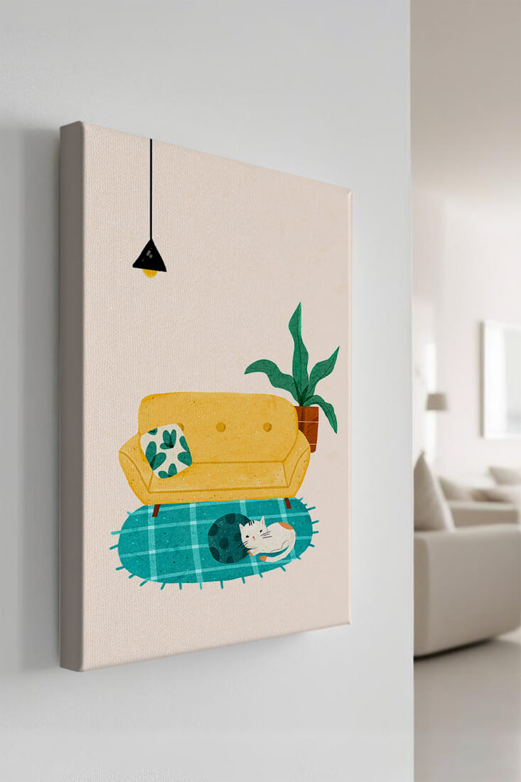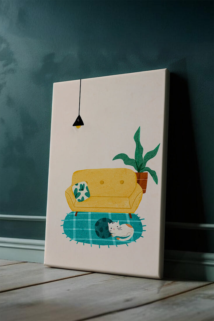 This delightful image captures the essence of leisure and comfort with its simple yet effective use of color and design. The inviting yellow sofa is complemented by a stylish green-and-blue pillow that adds a touch of elegance to the room. Beneath the sofa lies a blue rug that doubles as a cozy sleeping spot for a small, serene cat, adding a heartwarming vibe to the setting. A potted plant in the background breathes life and freshness into the space, enhancing the environment with its vibrant green leaves. Overall, the illustration exudes warmth and tranquility, perfect for anyone looking to create a relaxing and welcoming home atmosphere.| Type |