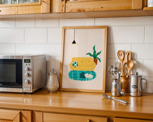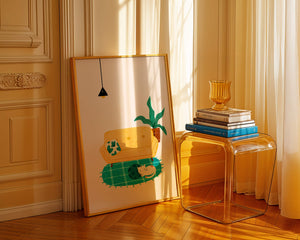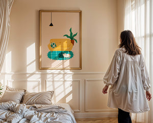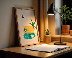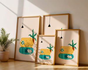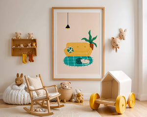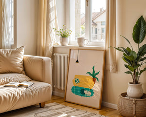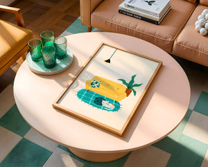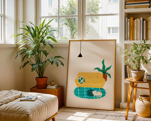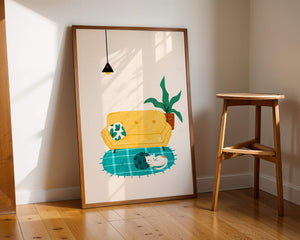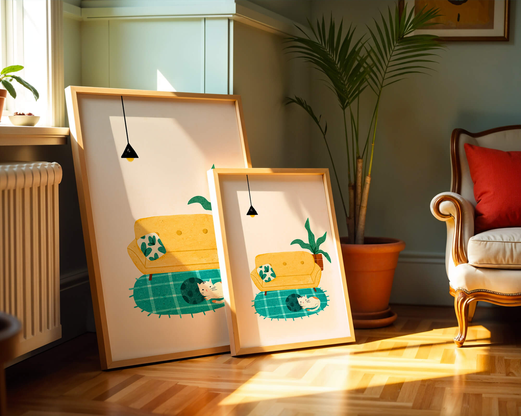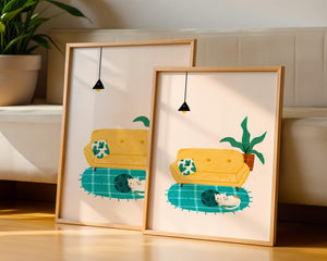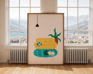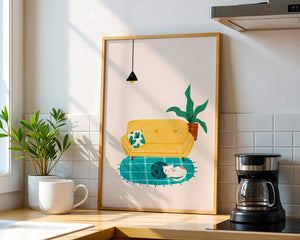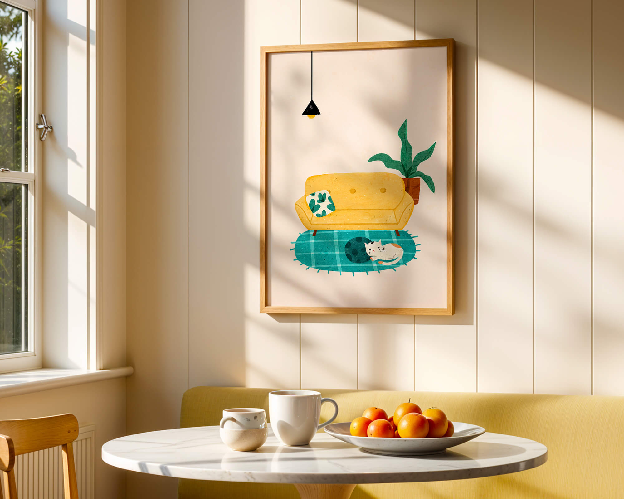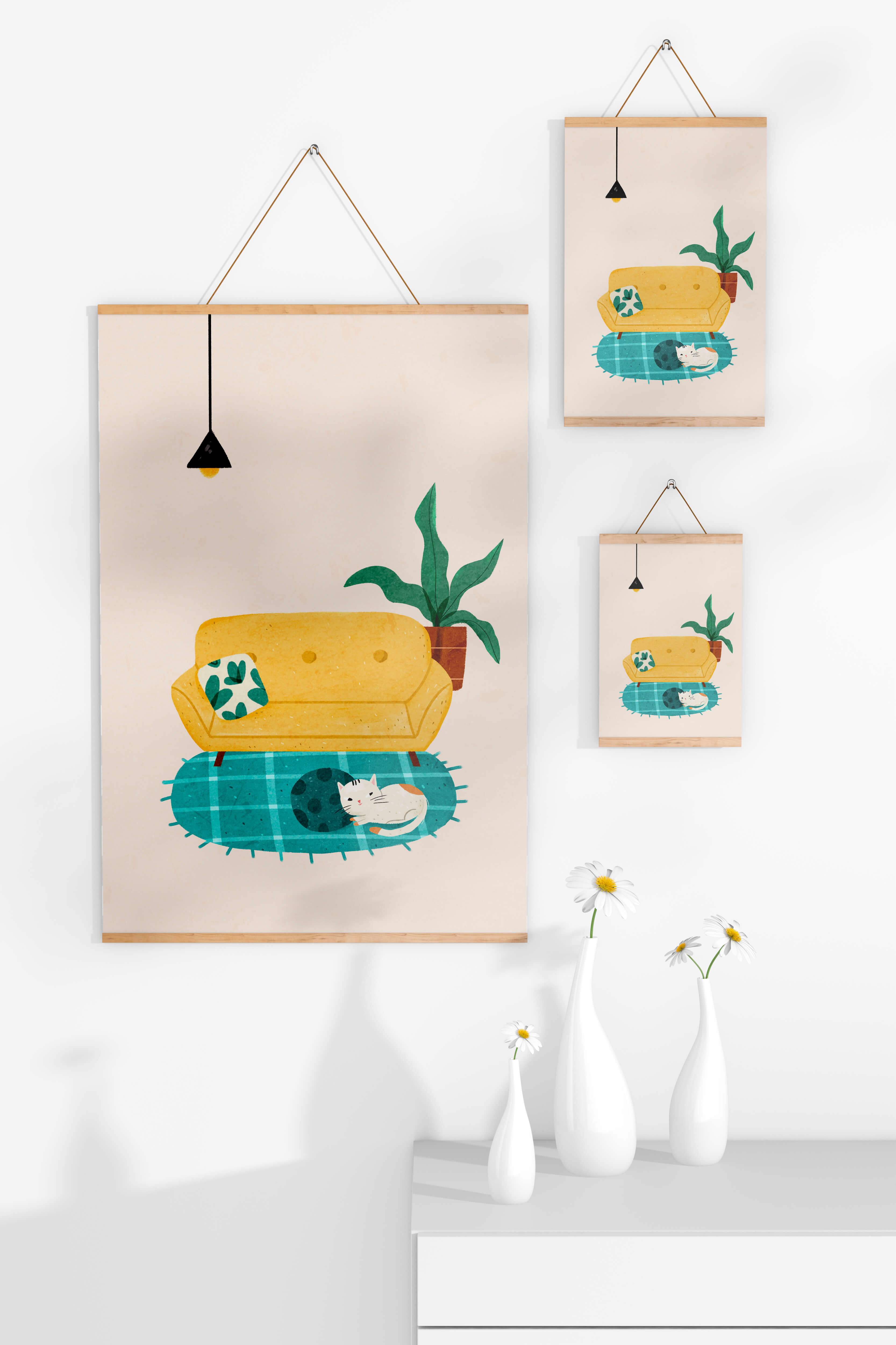 This delightful image captures the essence of leisure and comfort with its simple yet effective use of color and design. The inviting yellow sofa is complemented by a stylish green-and-blue pillow that adds a touch of elegance to the room. Beneath the sofa lies a blue rug that doubles as a cozy sleeping spot for a small, serene cat, adding a heartwarming vibe to the setting. A potted plant in the background breathes life and freshness into the space, enhancing the environment with its vibrant green leaves. Overall, the illustration exudes warmth and tranquility, perfect for anyone looking to create a relaxing and welcoming home atmosphere.| Type |