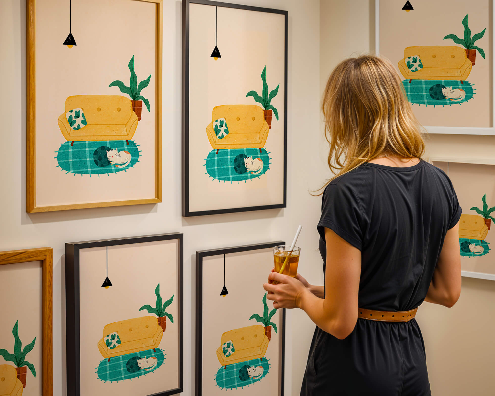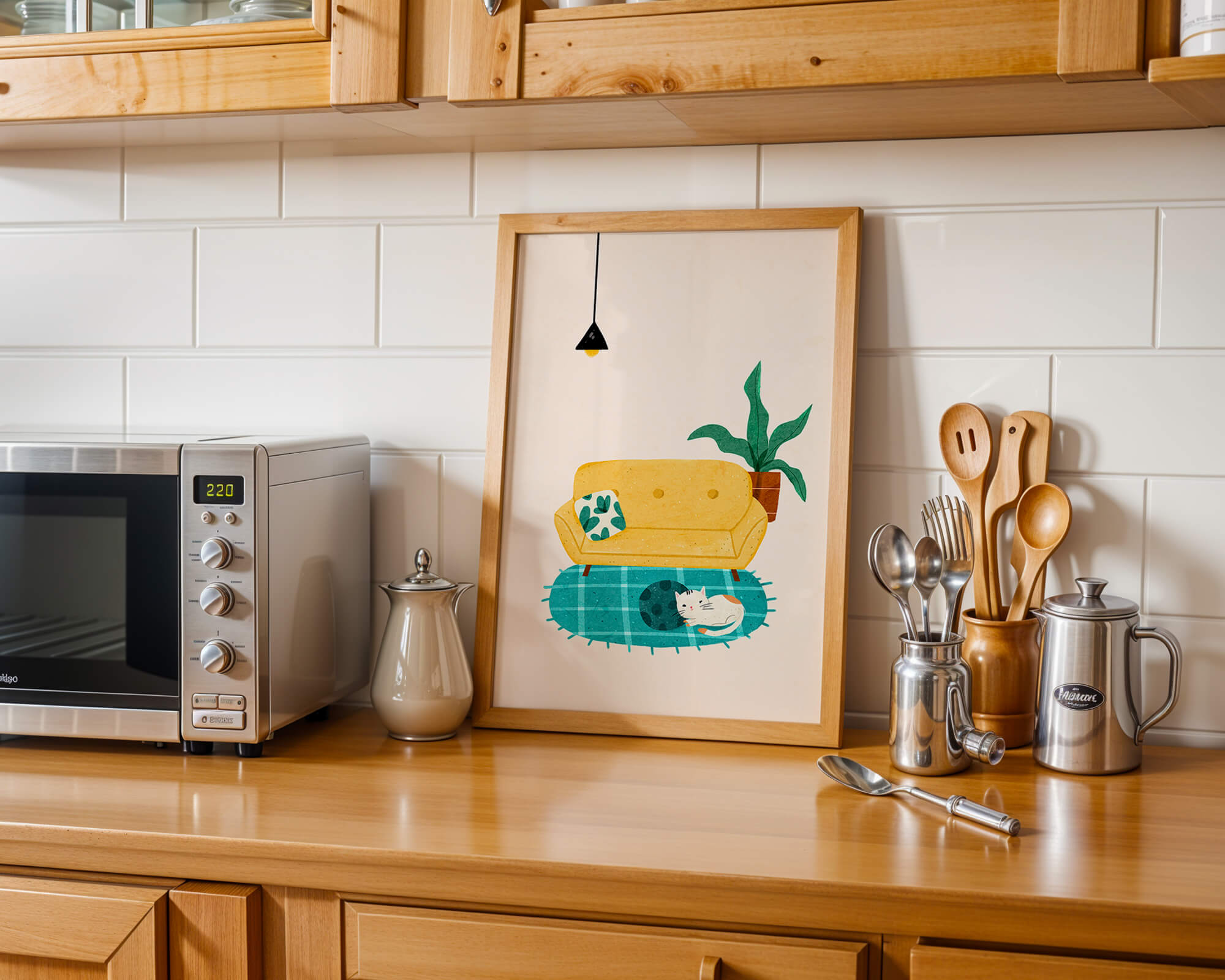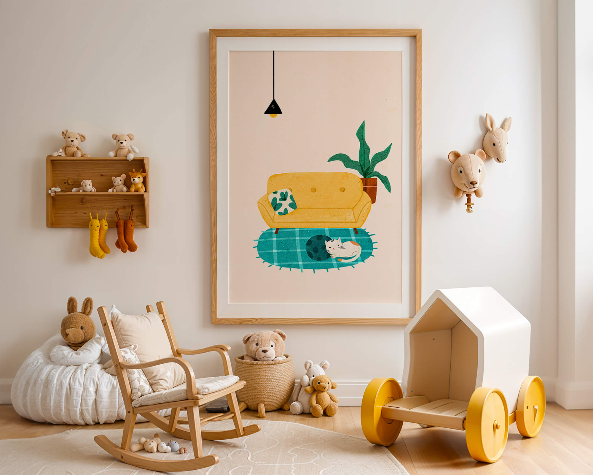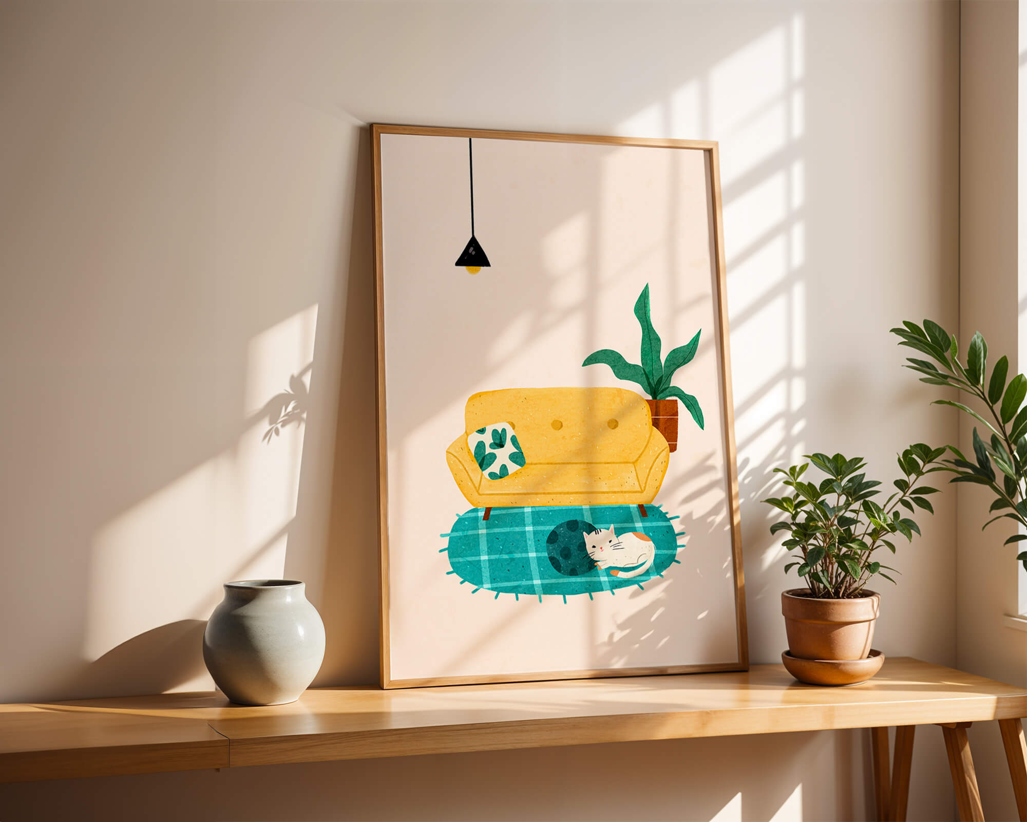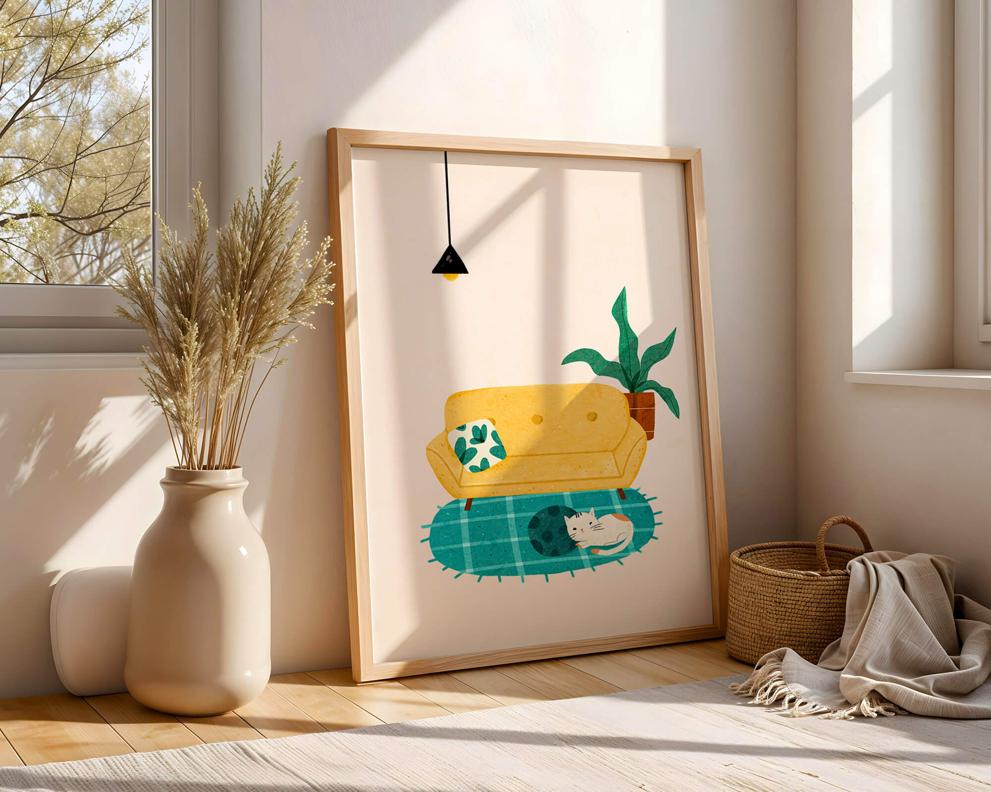 A charming illustration of a cozy living room. The scene features a yellow sofa, a decorative pillow, a green potted plant, and a content cat resting on a blue rug.