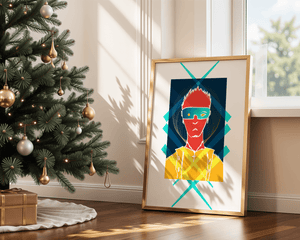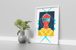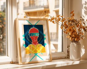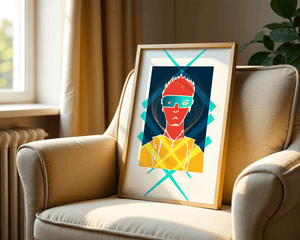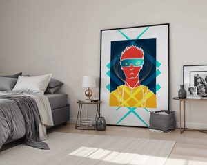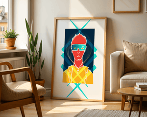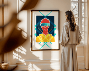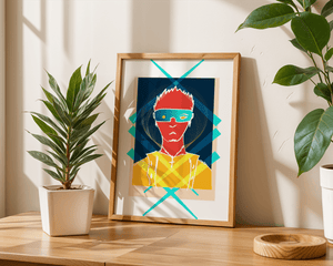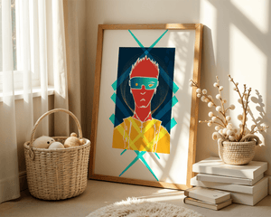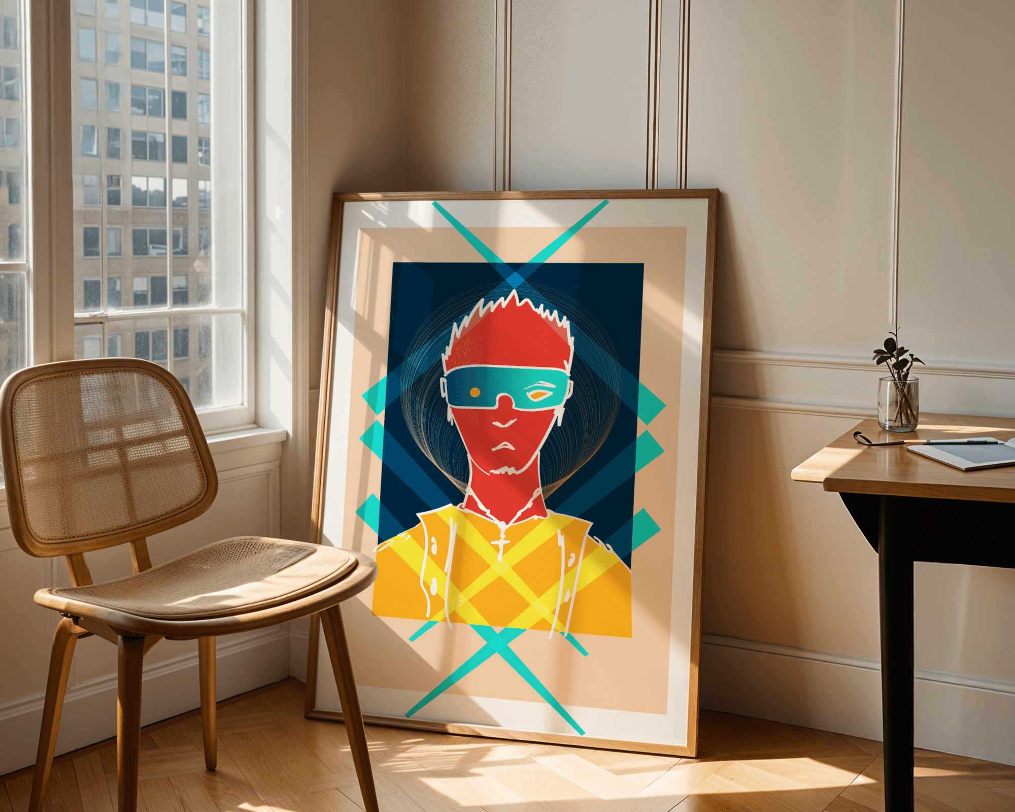 This artwork captures the essence of cyberpunk culture with its vibrant colors, sharp angles, and futuristic aesthetics. The fusion of neon blues, fiery reds, and golden yellows creates a striking contrast that commands attention. Whether placed in a living room, bedroom, or office, this piece adds a dynamic energy to your space.