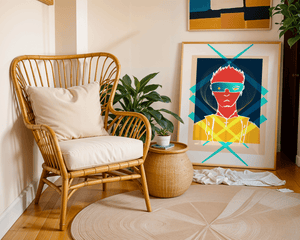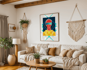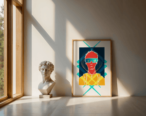 Transform your space with this bold cyberpunk artwork, featuring a futuristic warrior in striking geometric neon hues.