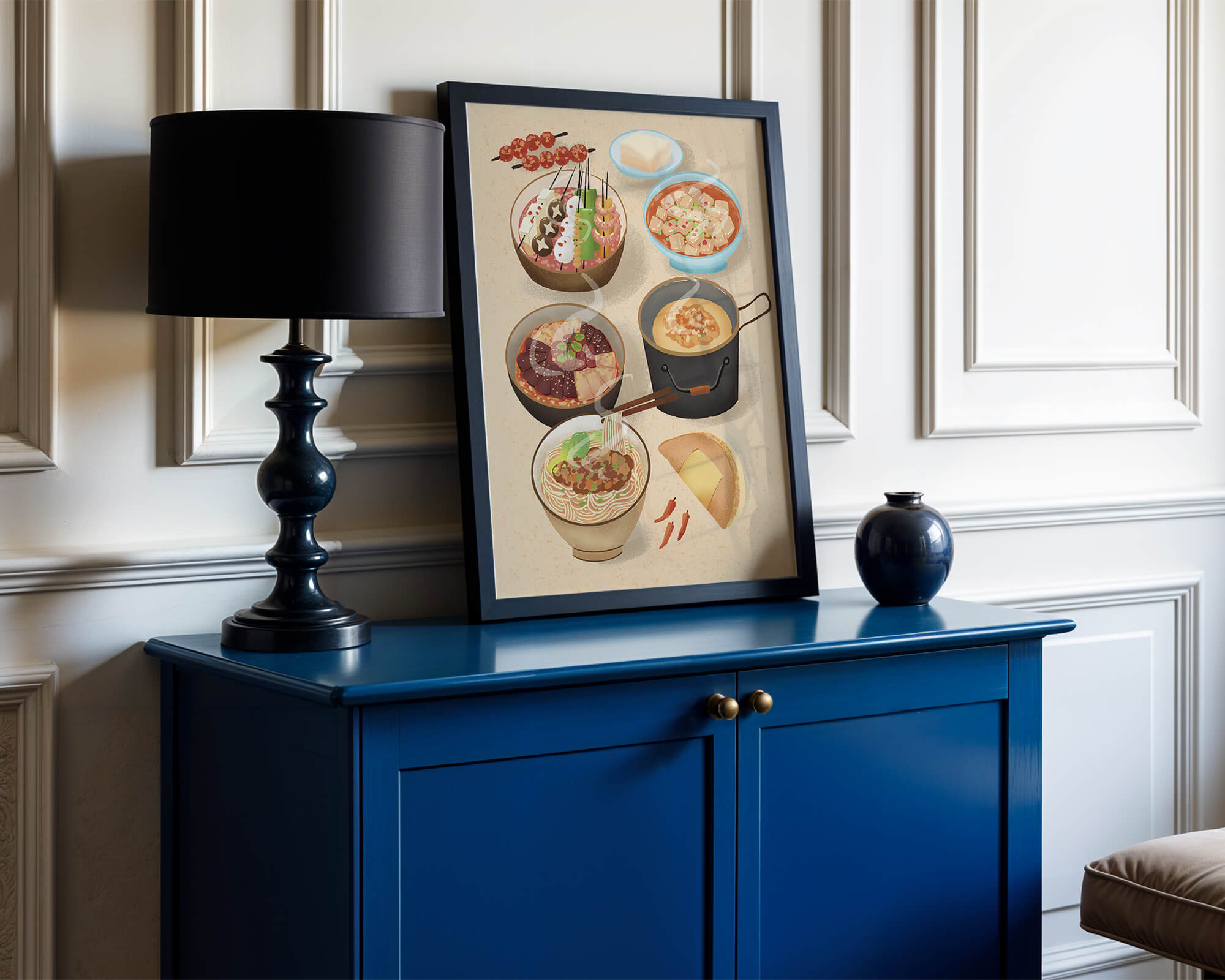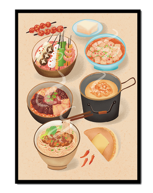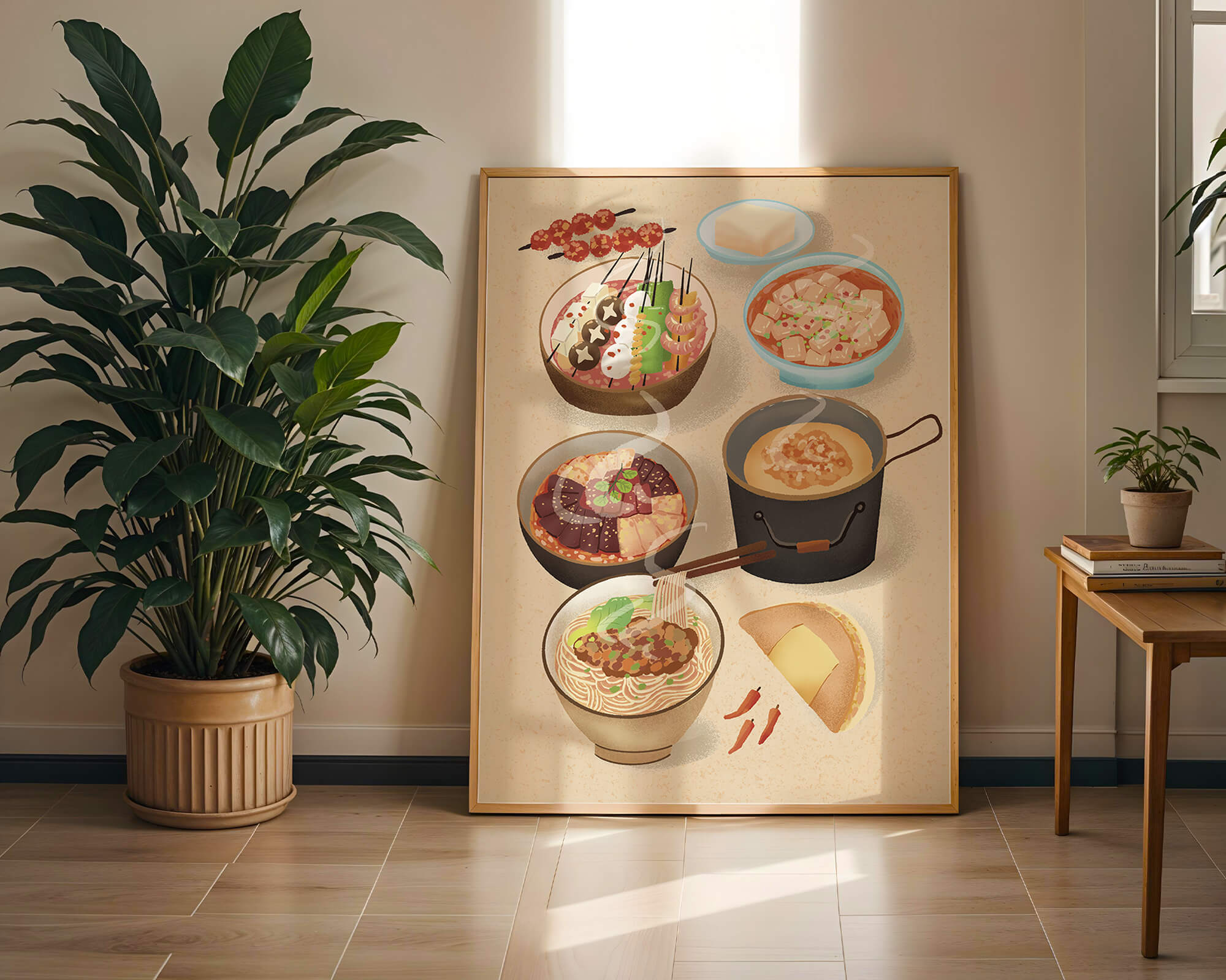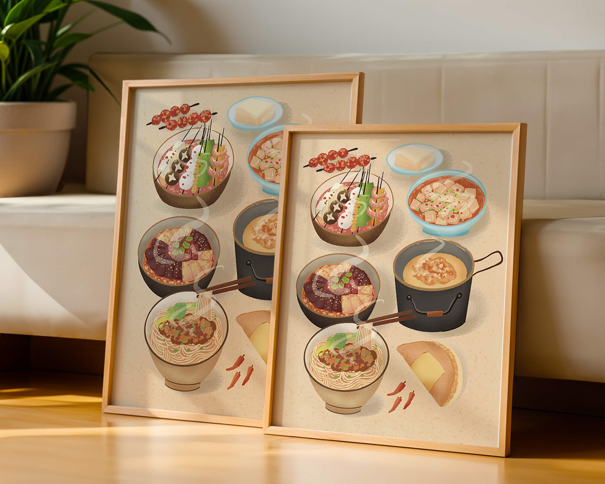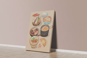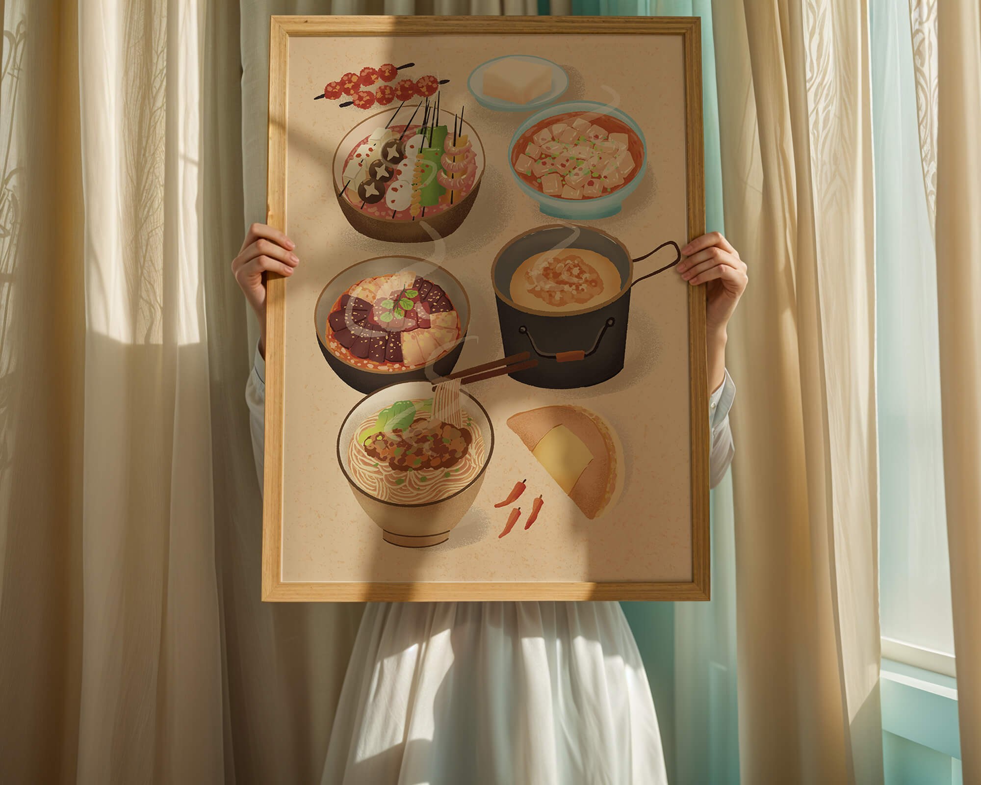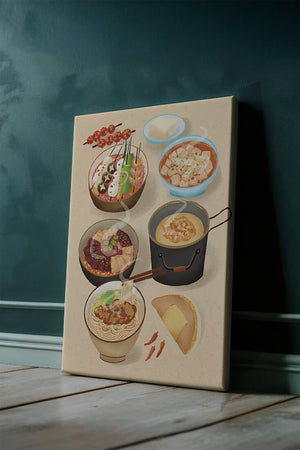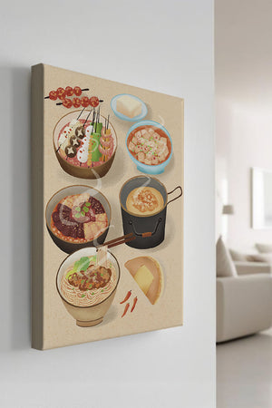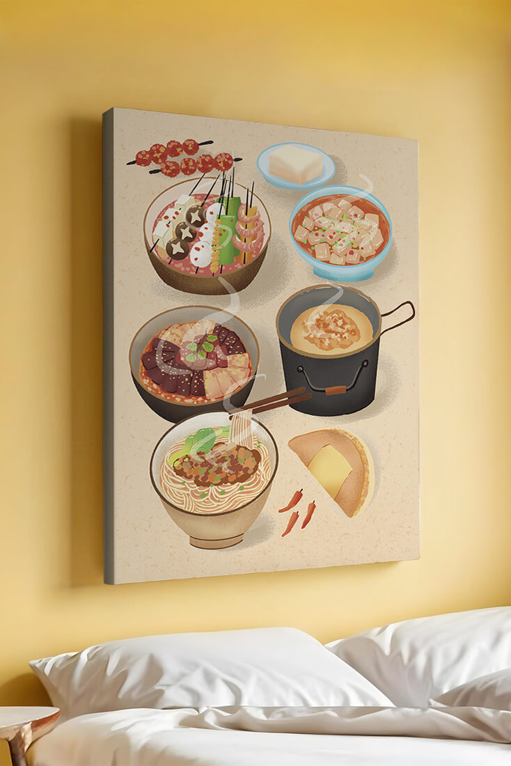 This image captures the essence of Asian culinary traditions with a variety of mouth-watering dishes. From steaming bowls of noodles to flavorful skewers, each element brings a unique taste experience. The artist skillfully represents the rich textures and colors of the food, making the viewer almost taste the vibrant flavors.Tofu cubes, spicy soups, and fresh vegetables highlight the diversity and imagination of Asian cooking. This artwork offers a visual feast that pays tribute to the art of food preparation and presentation, emblematic of cultural richness and gastronomic indulgence. Perfect for anyone appreciating the beauty found in culinary arts.| Type |