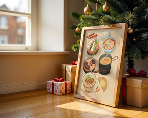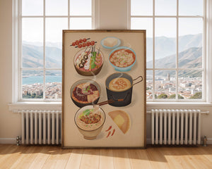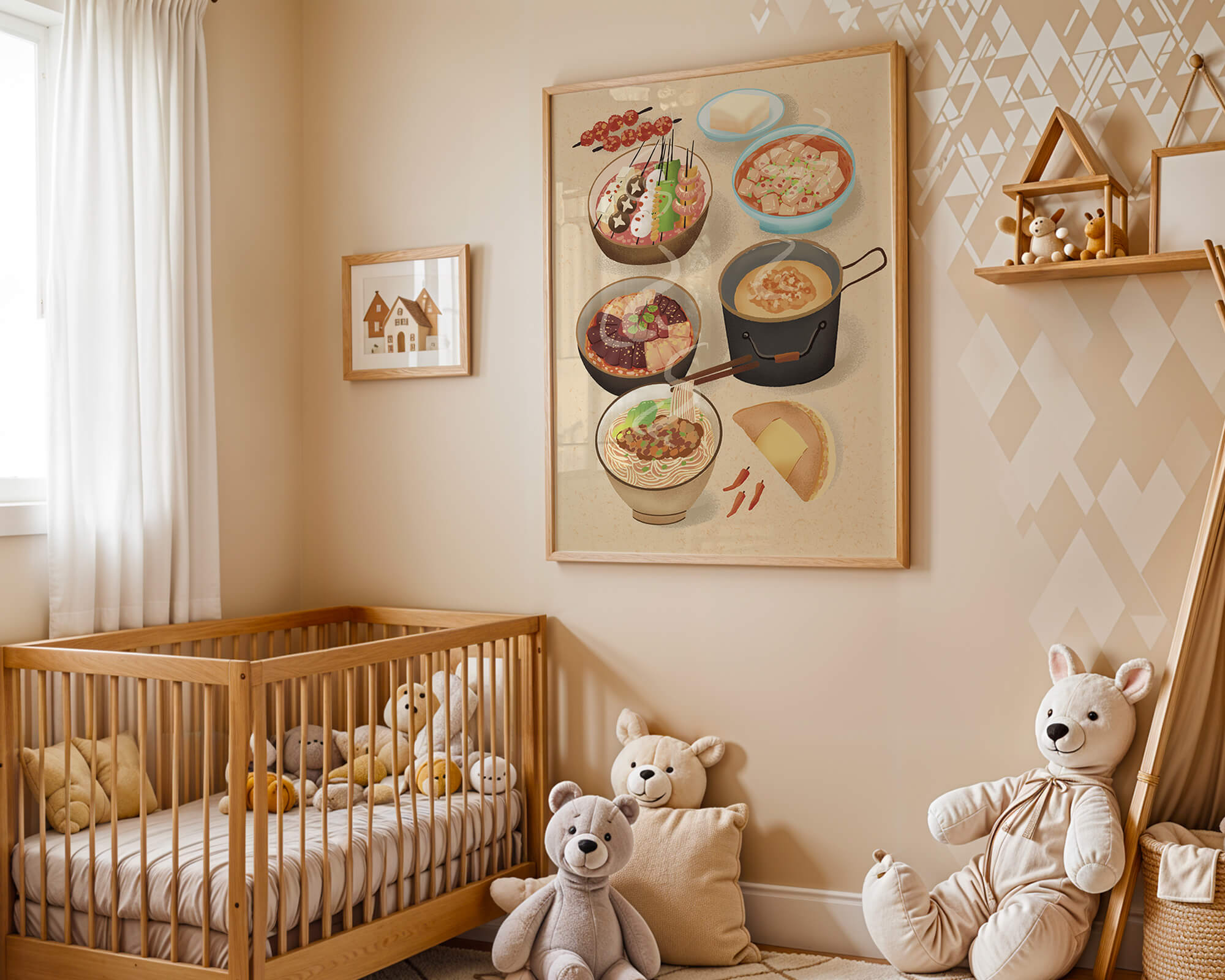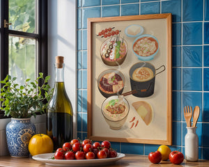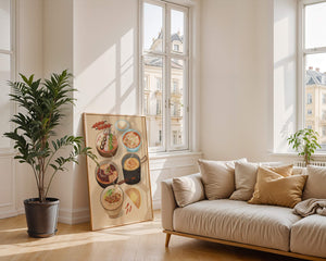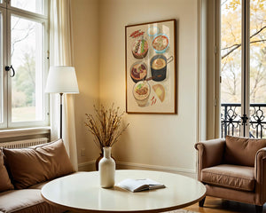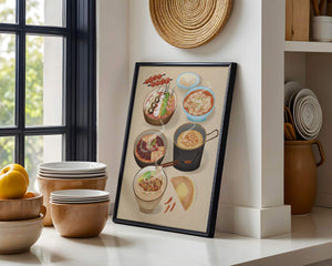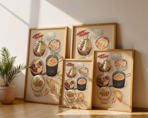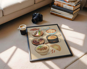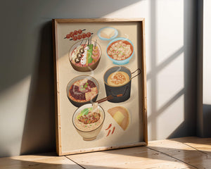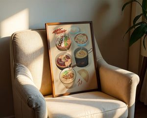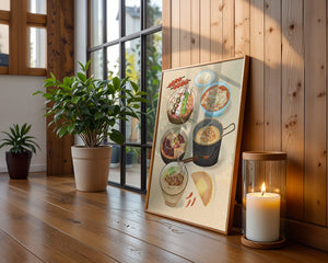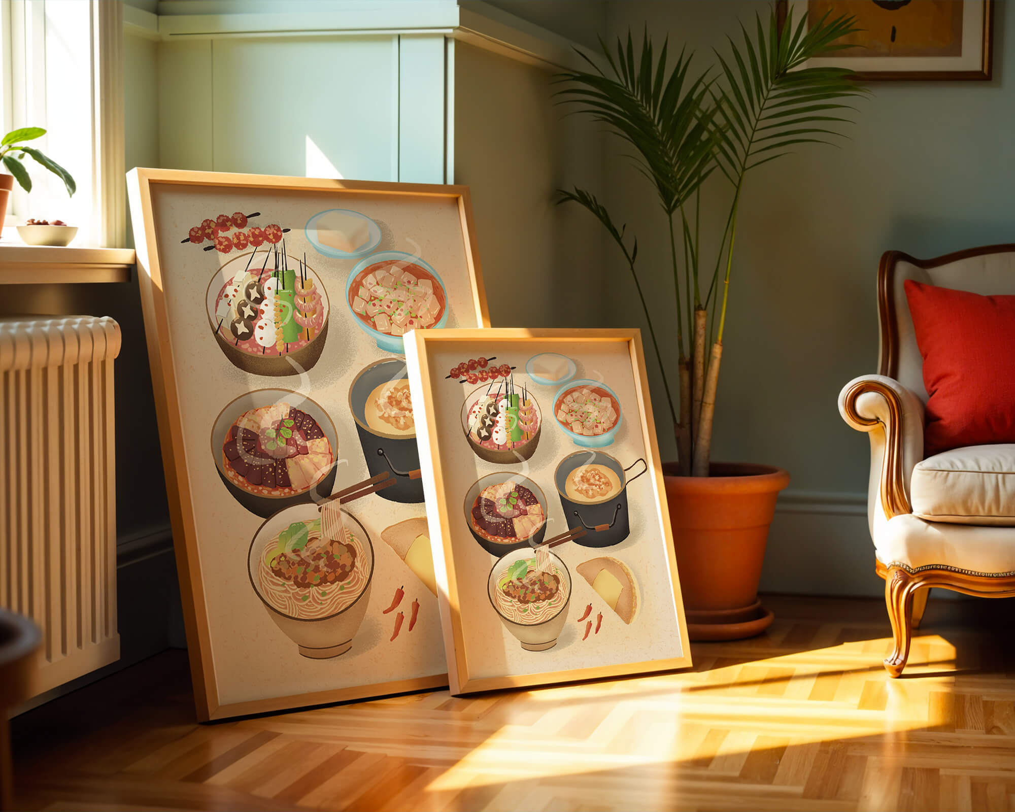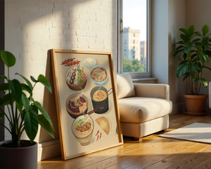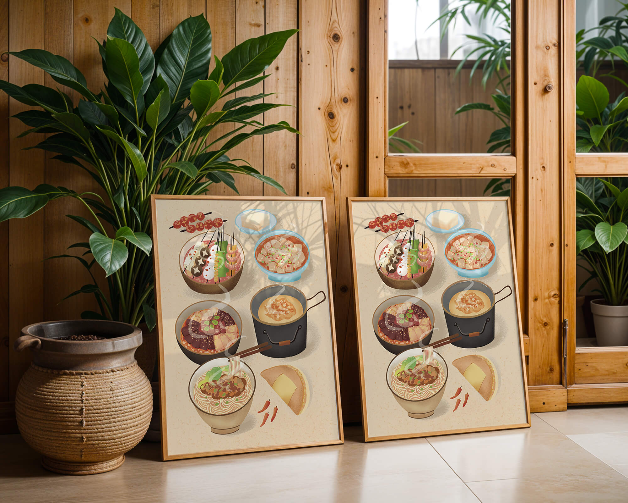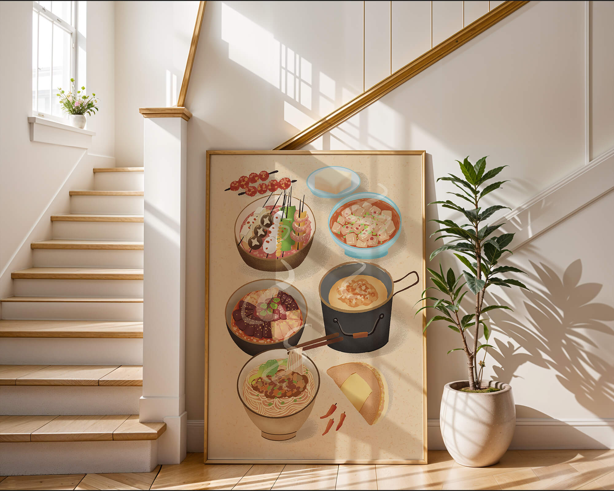 This image captures the essence of Asian culinary traditions with a variety of mouth-watering dishes. From steaming bowls of noodles to flavorful skewers, each element brings a unique taste experience. The artist skillfully represents the rich textures and colors of the food, making the viewer almost taste the vibrant flavors.Tofu cubes, spicy soups, and fresh vegetables highlight the diversity and imagination of Asian cooking. This artwork offers a visual feast that pays tribute to the art of food preparation and presentation, emblematic of cultural richness and gastronomic indulgence. Perfect for anyone appreciating the beauty found in culinary arts.| Type |