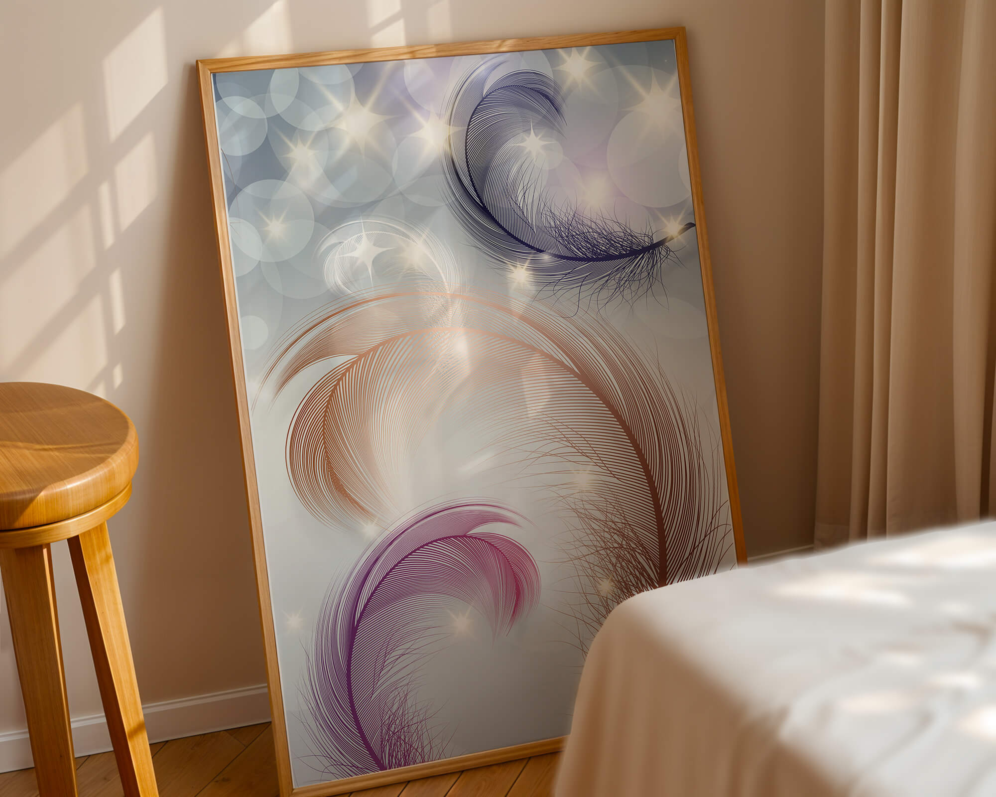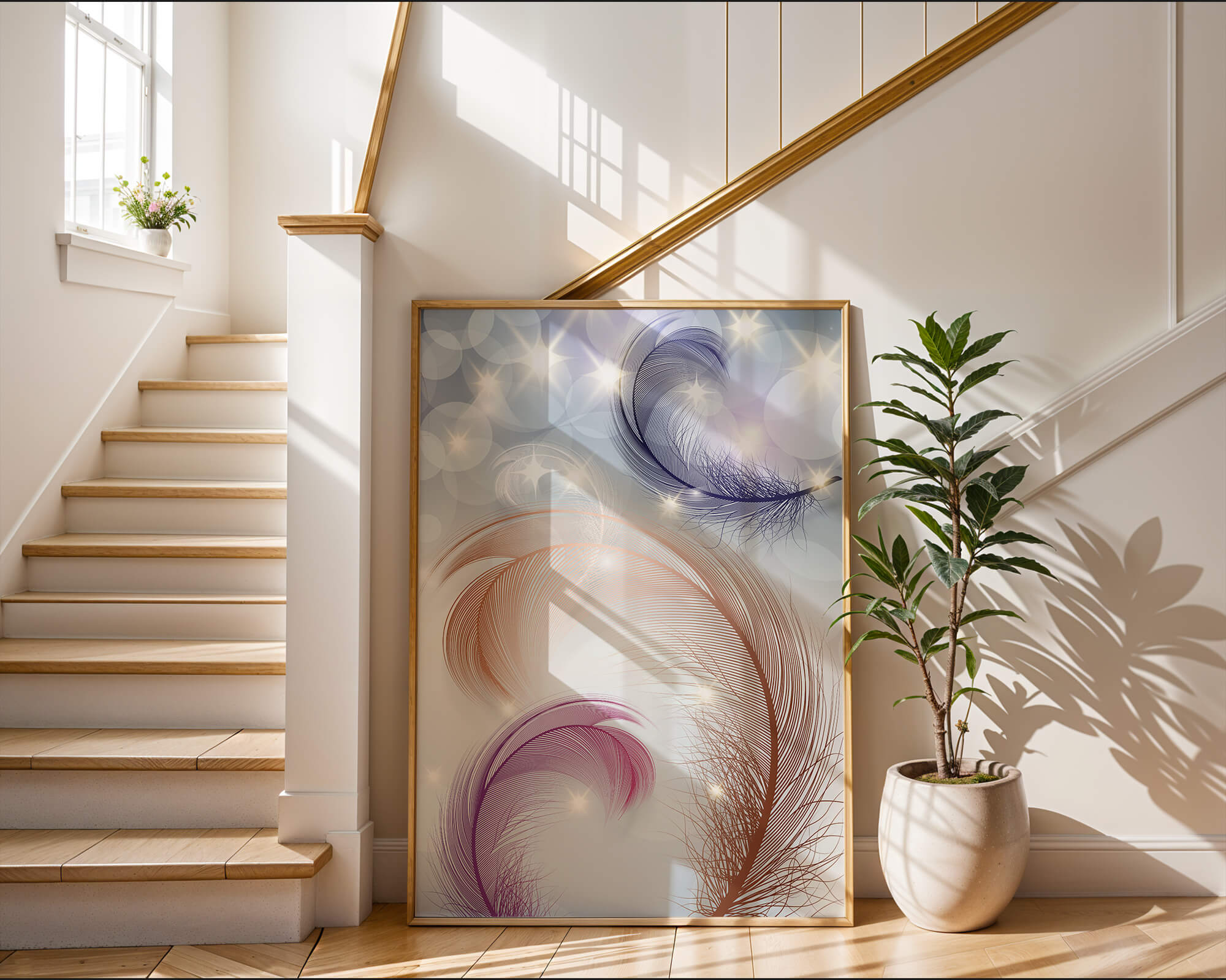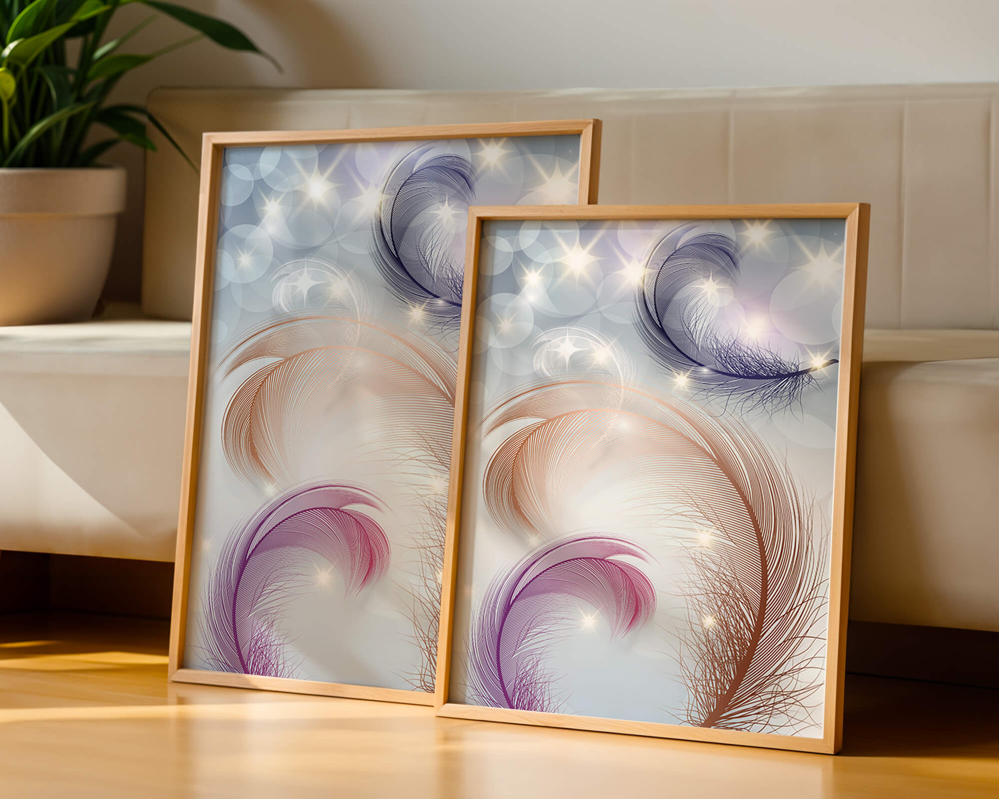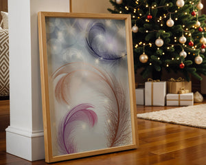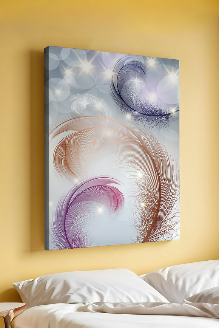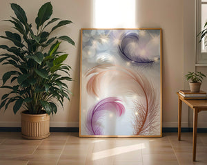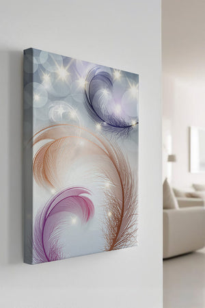 This image beautifully captures the elegance of abstract design through delicate feather motifs intertwined with soft sparkles against a soothing background. The careful blend of colors and textures creates a serene and stylish atmosphere, making it an ideal choice for modern decor environments.The feather patterns gracefully flow across the image, enhanced by subtle lighting effects that evoke a sense of serenity and tranquility. The combination of blues, purples, and soft whites adds depth and sophistication, perfect for enhancing the aesthetic appeal of living rooms or bedrooms. This piece embodies a perfect harmony of art and modern design, offering a unique centerpiece for various interior styles.