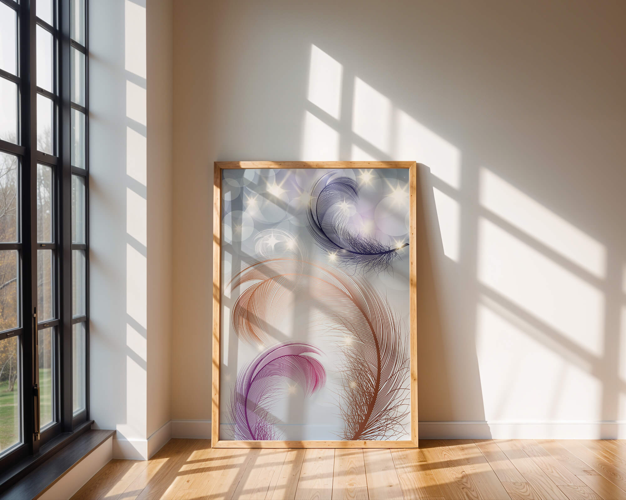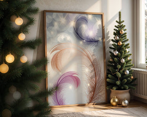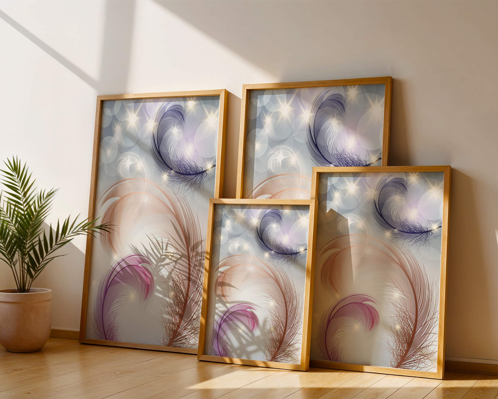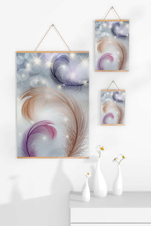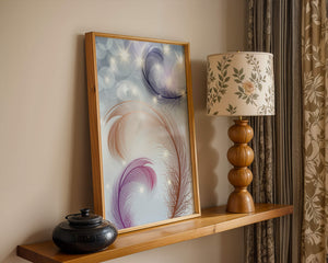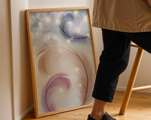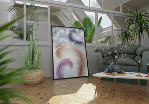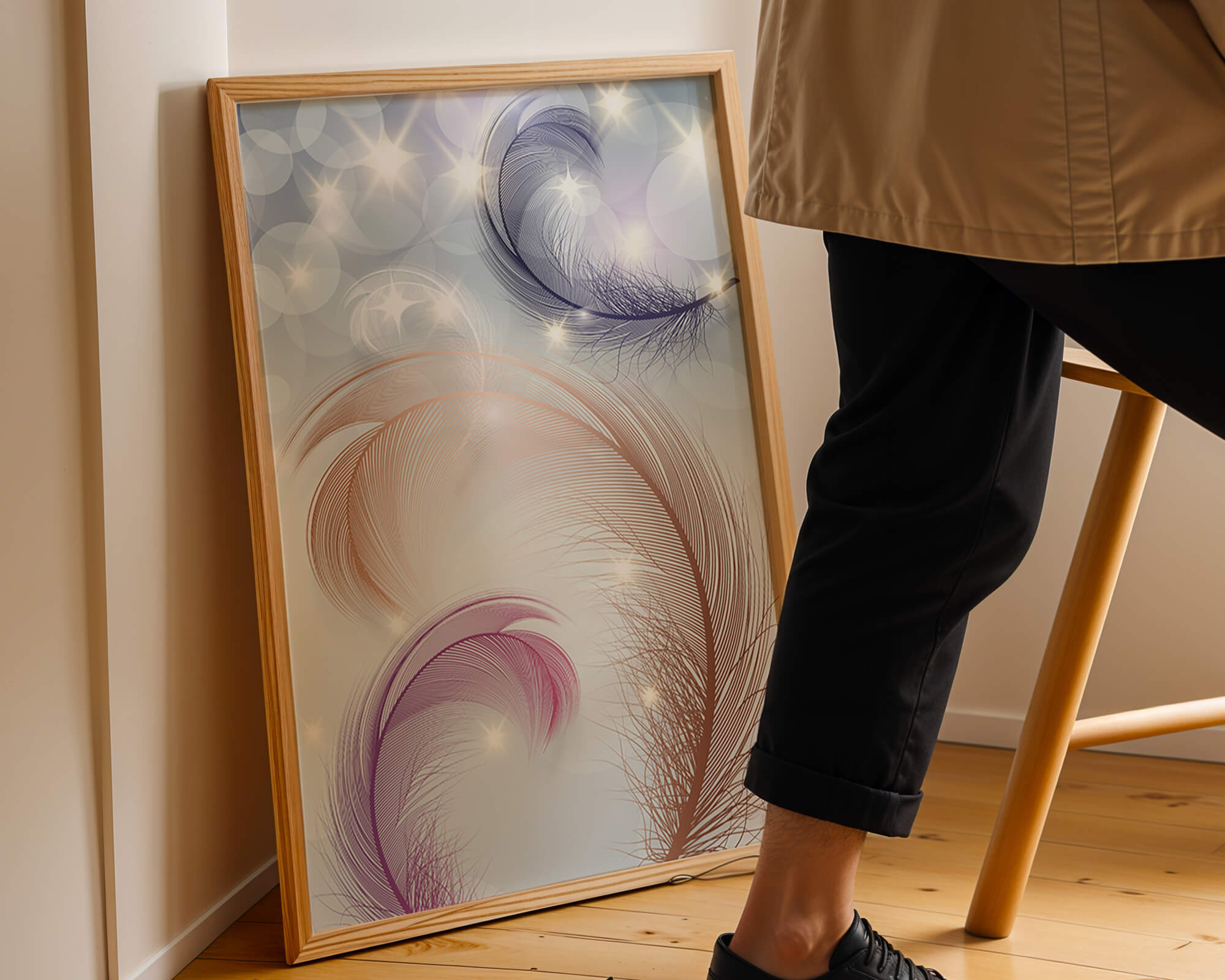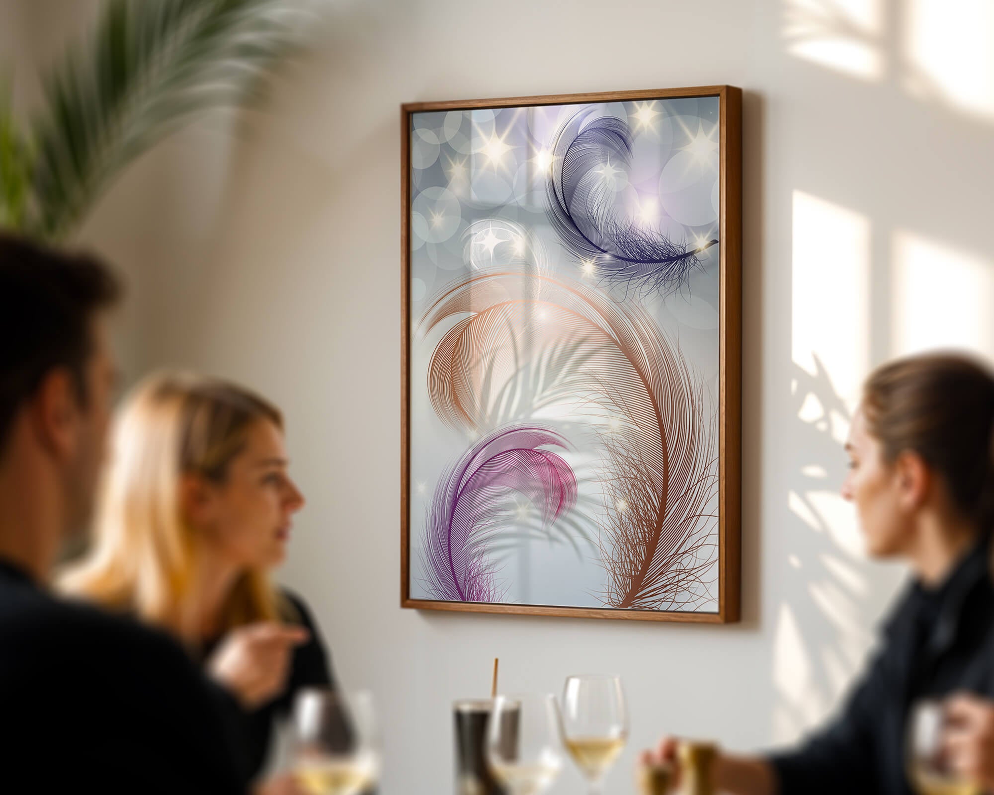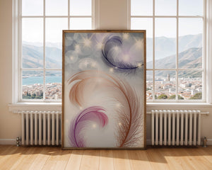 This image beautifully captures the elegance of abstract design through delicate feather motifs intertwined with soft sparkles against a soothing background. The careful blend of colors and textures creates a serene and stylish atmosphere, making it an ideal choice for modern decor environments.The feather patterns gracefully flow across the image, enhanced by subtle lighting effects that evoke a sense of serenity and tranquility. The combination of blues, purples, and soft whites adds depth and sophistication, perfect for enhancing the aesthetic appeal of living rooms or bedrooms. This piece embodies a perfect harmony of art and modern design, offering a unique centerpiece for various interior styles.