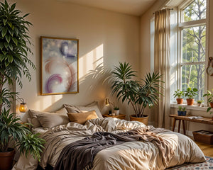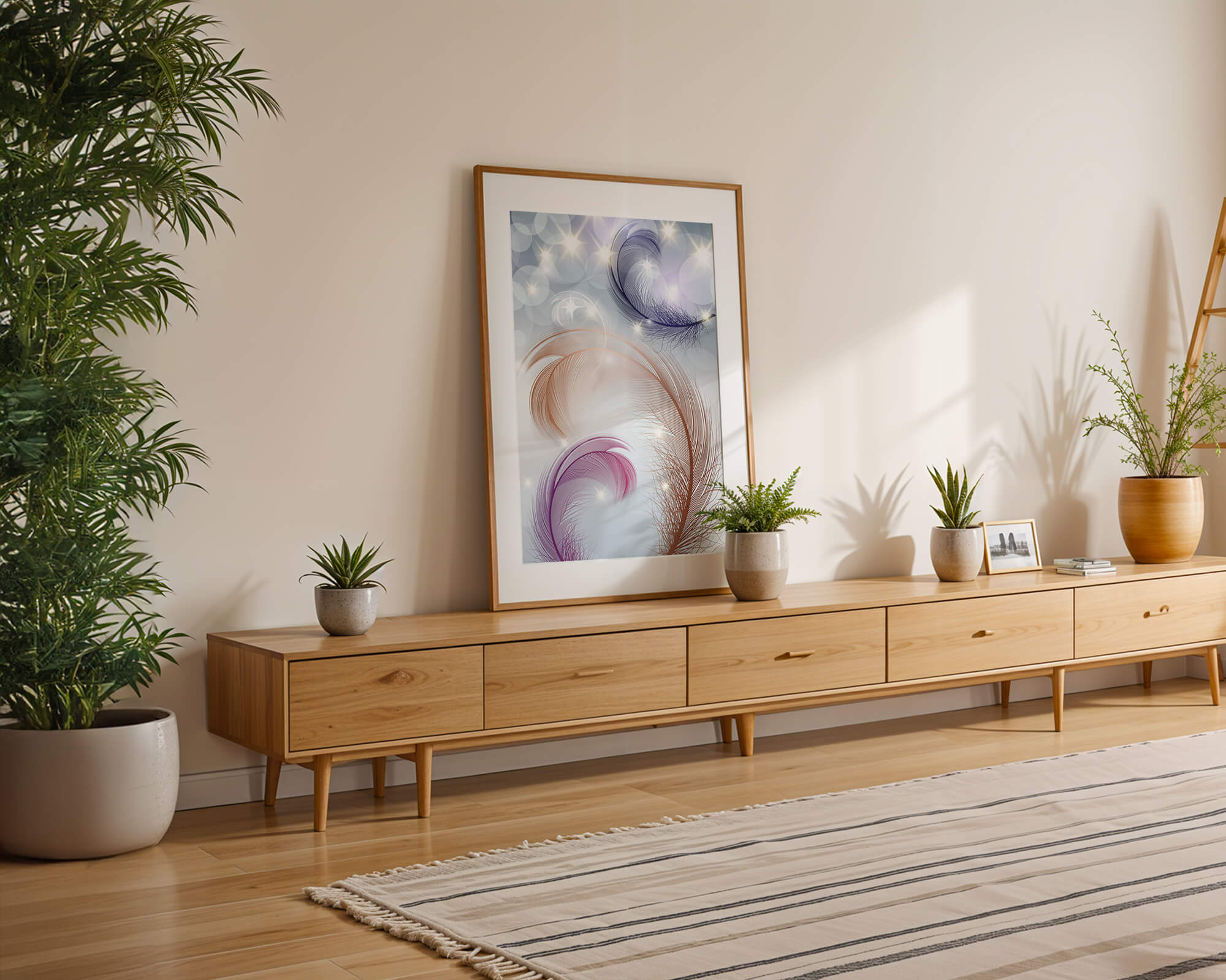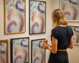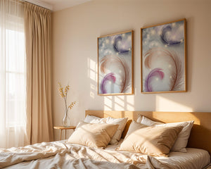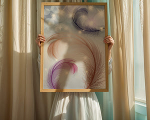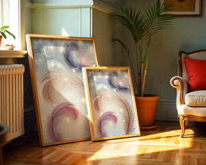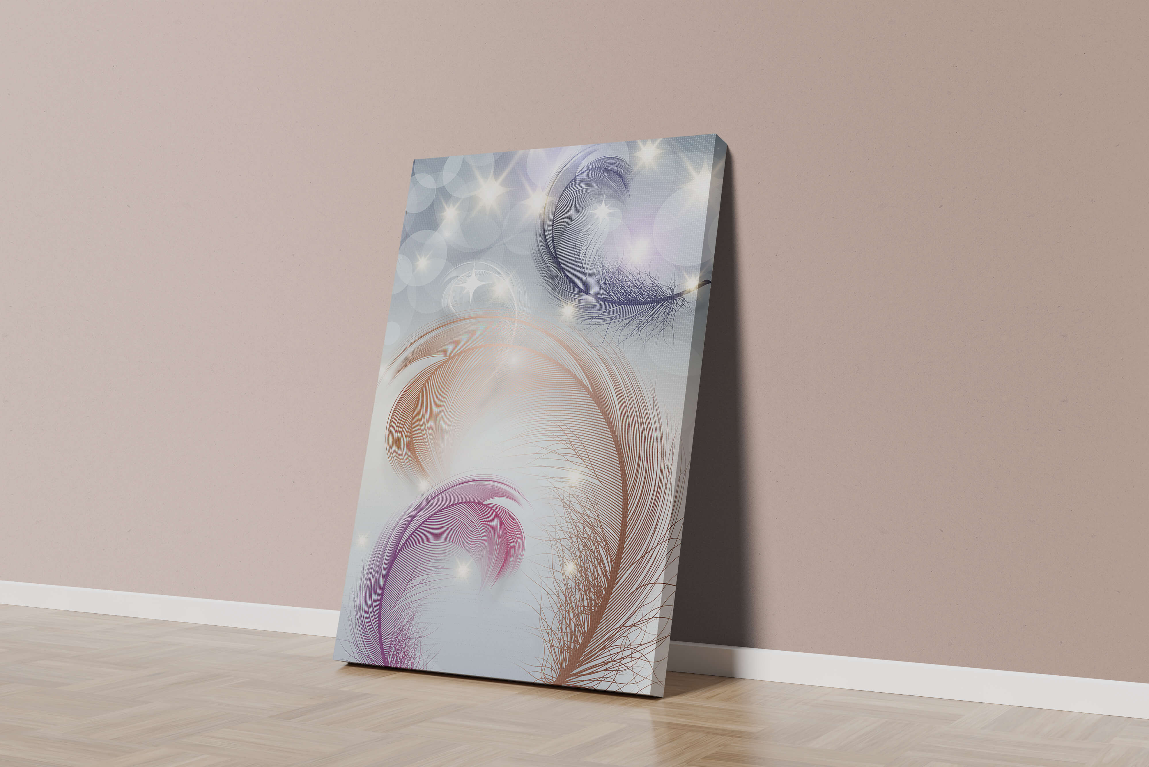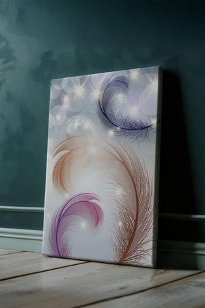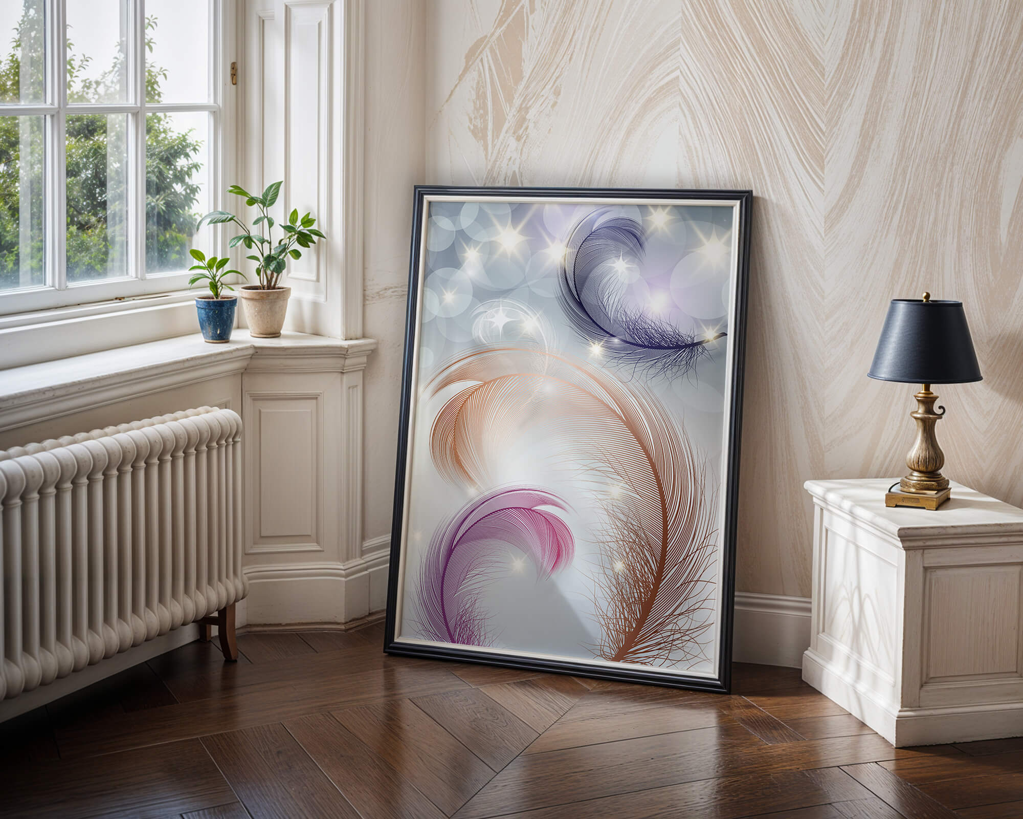 This image beautifully captures the elegance of abstract design through delicate feather motifs intertwined with soft sparkles against a soothing background. The careful blend of colors and textures creates a serene and stylish atmosphere, making it an ideal choice for modern decor environments.The feather patterns gracefully flow across the image, enhanced by subtle lighting effects that evoke a sense of serenity and tranquility. The combination of blues, purples, and soft whites adds depth and sophistication, perfect for enhancing the aesthetic appeal of living rooms or bedrooms. This piece embodies a perfect harmony of art and modern design, offering a unique centerpiece for various interior styles.