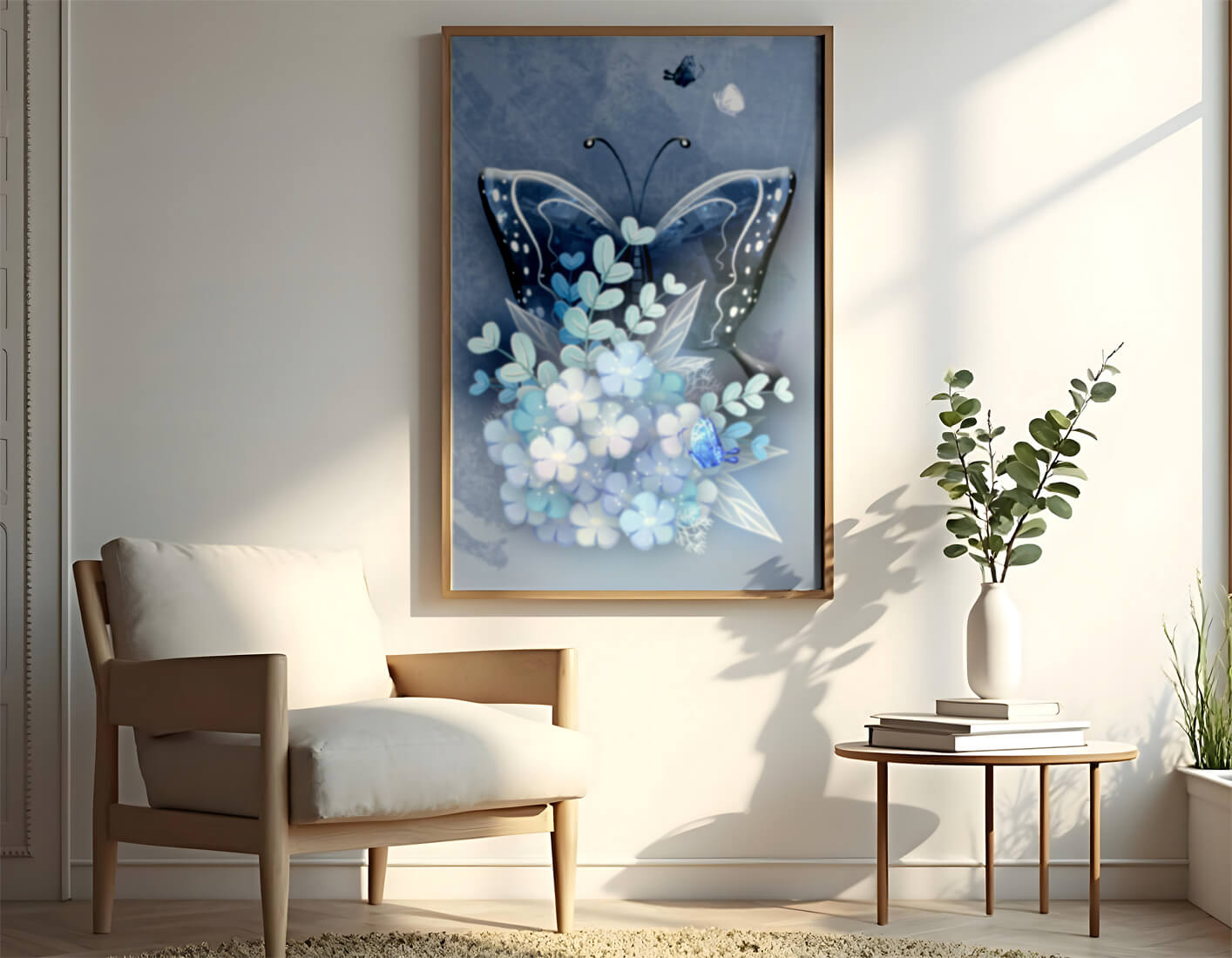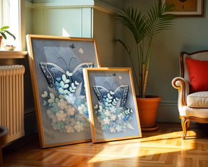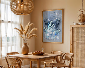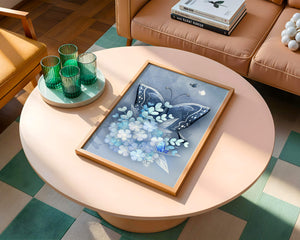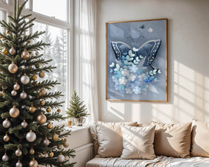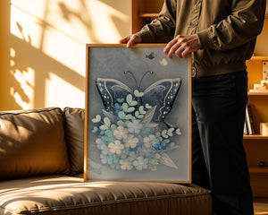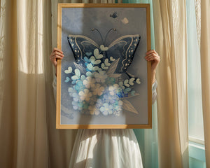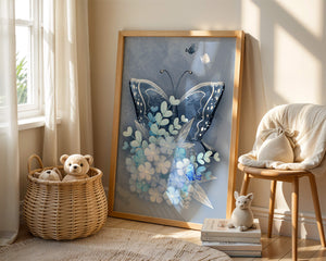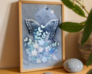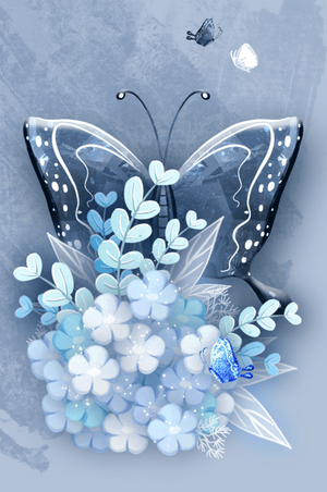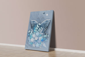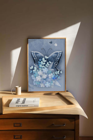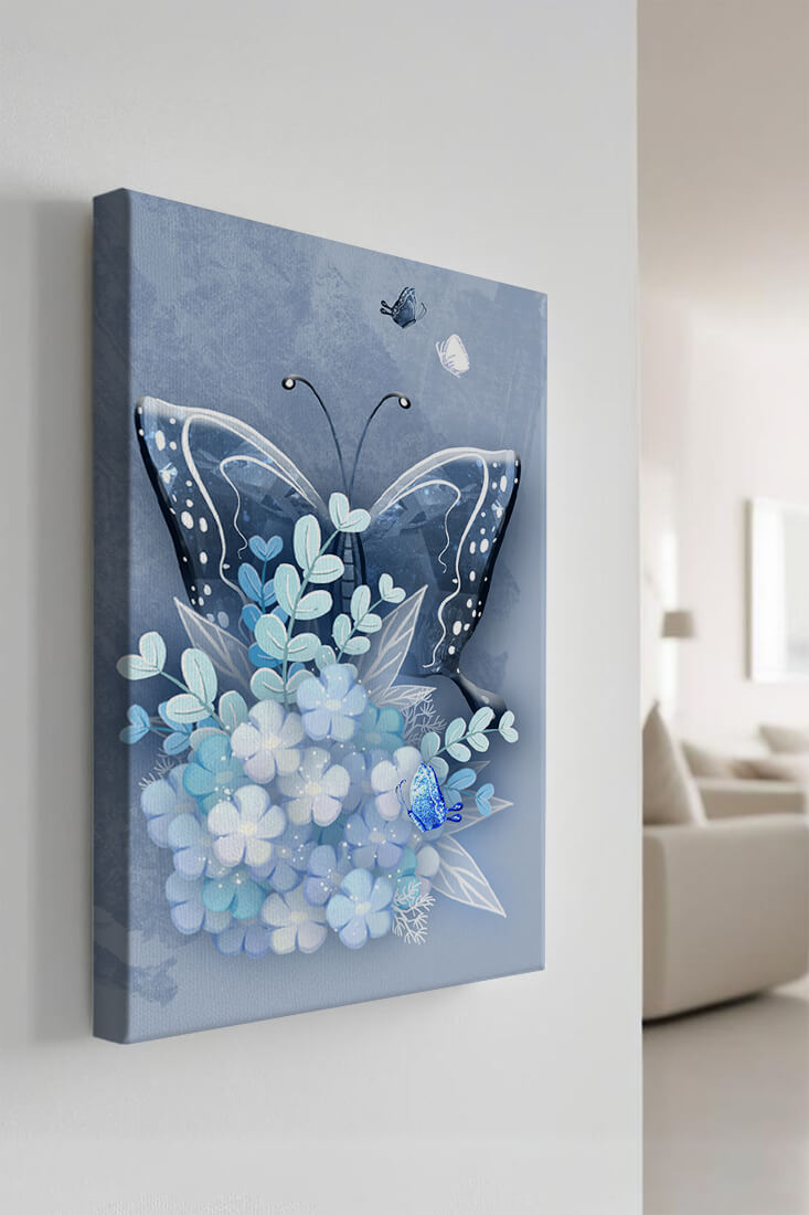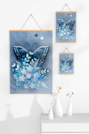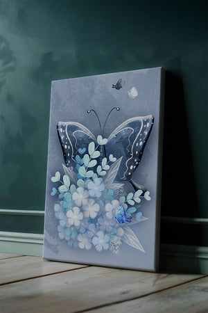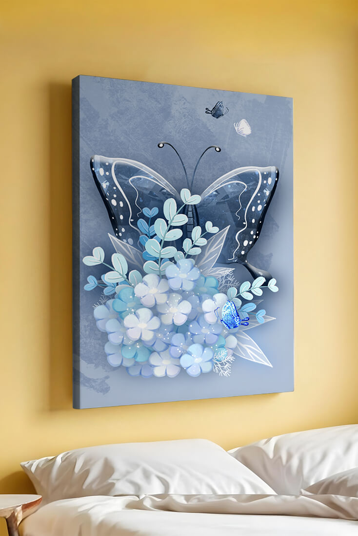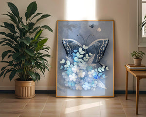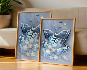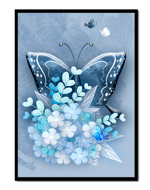The centerpiece of this image is the elegantly crafted butterfly, depicted in a harmonious blend of blue and white hues. Its wings are intricately detailed with white and blue patterns, evoking a sense of grace and fluidity. Surrounding the butterfly is a lush bouquet of soft blue flowers and foliage, enhancing the artworks gentle and calming aesthetic.This piece is perfect for adding a touch of nature and elegance to any room. Its soothing color palette and intricate details make it an ideal choice for wall art in a living room, bedroom, or any space where a touch of whimsy and beauty is desired. The artwork beautifully balances art and nature, inviting a sense of tranquility into your decor.| Type |