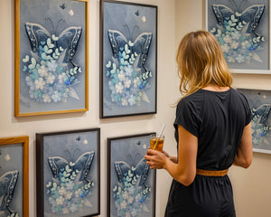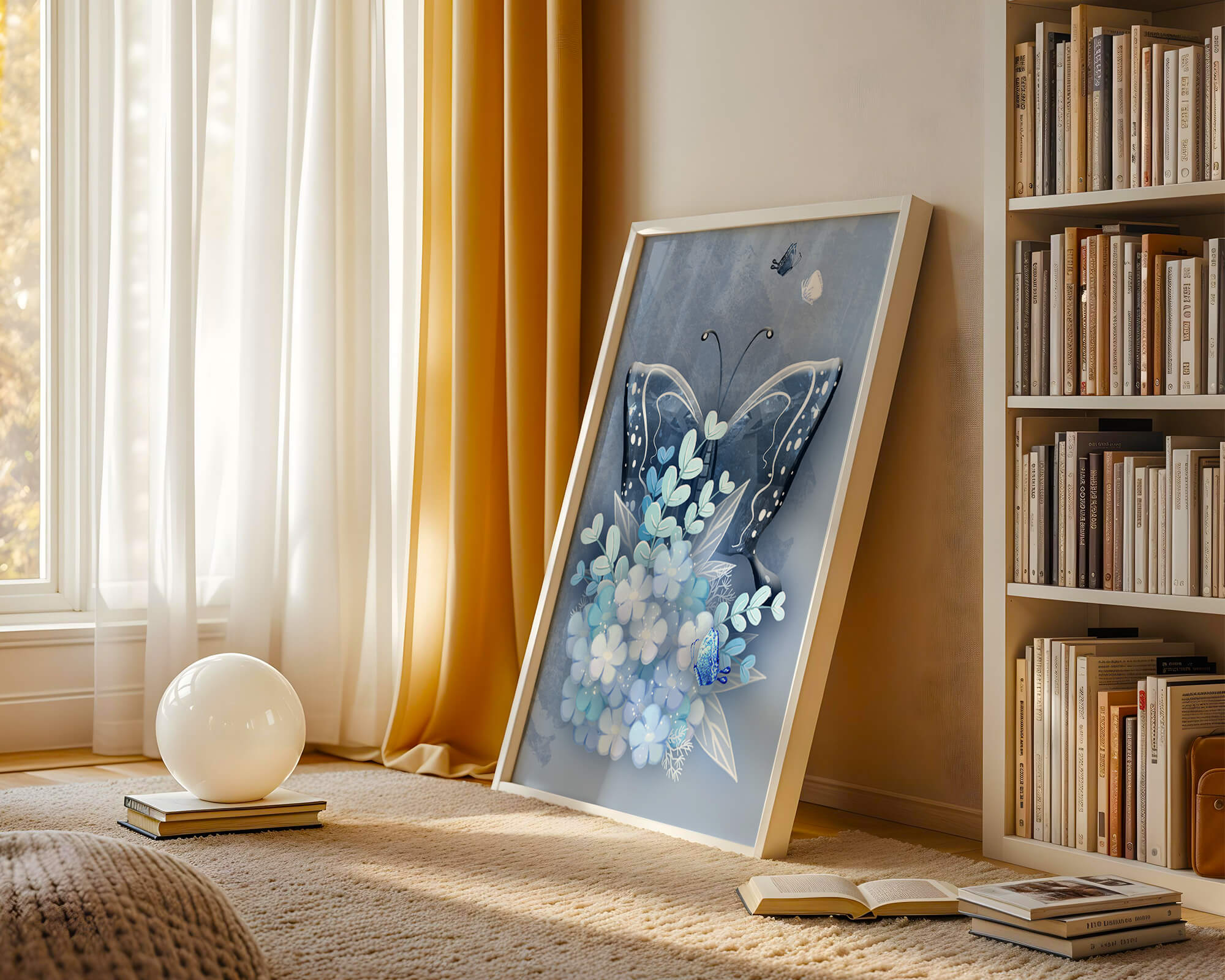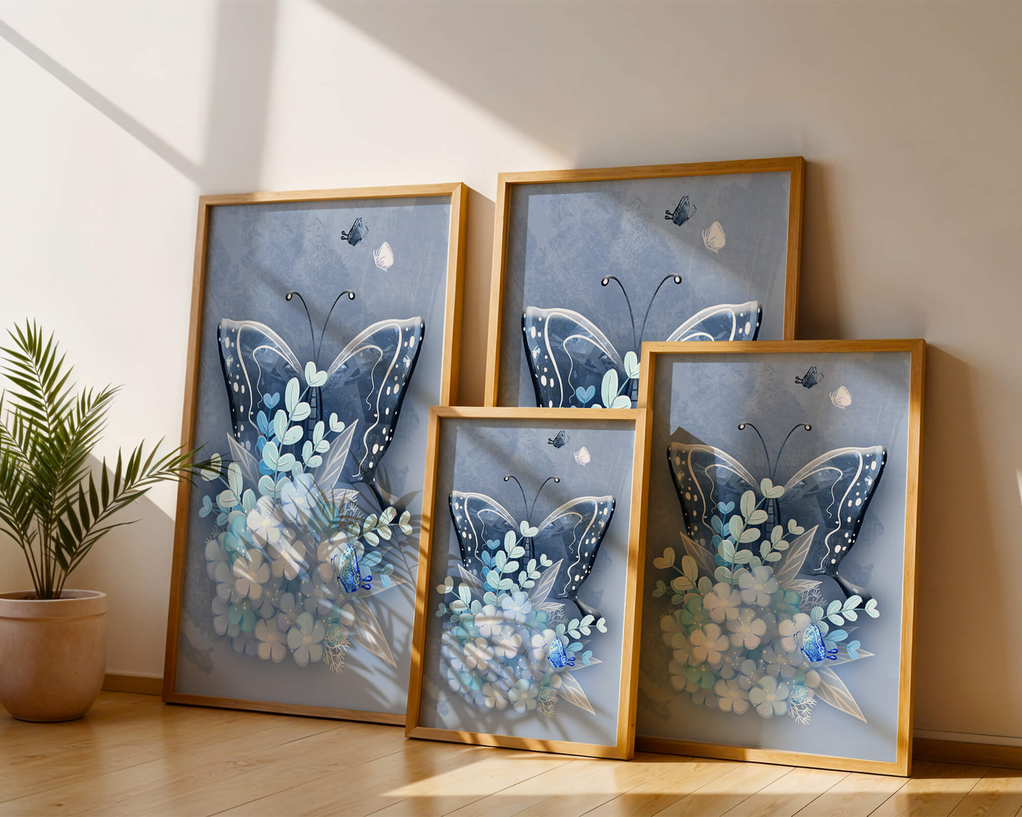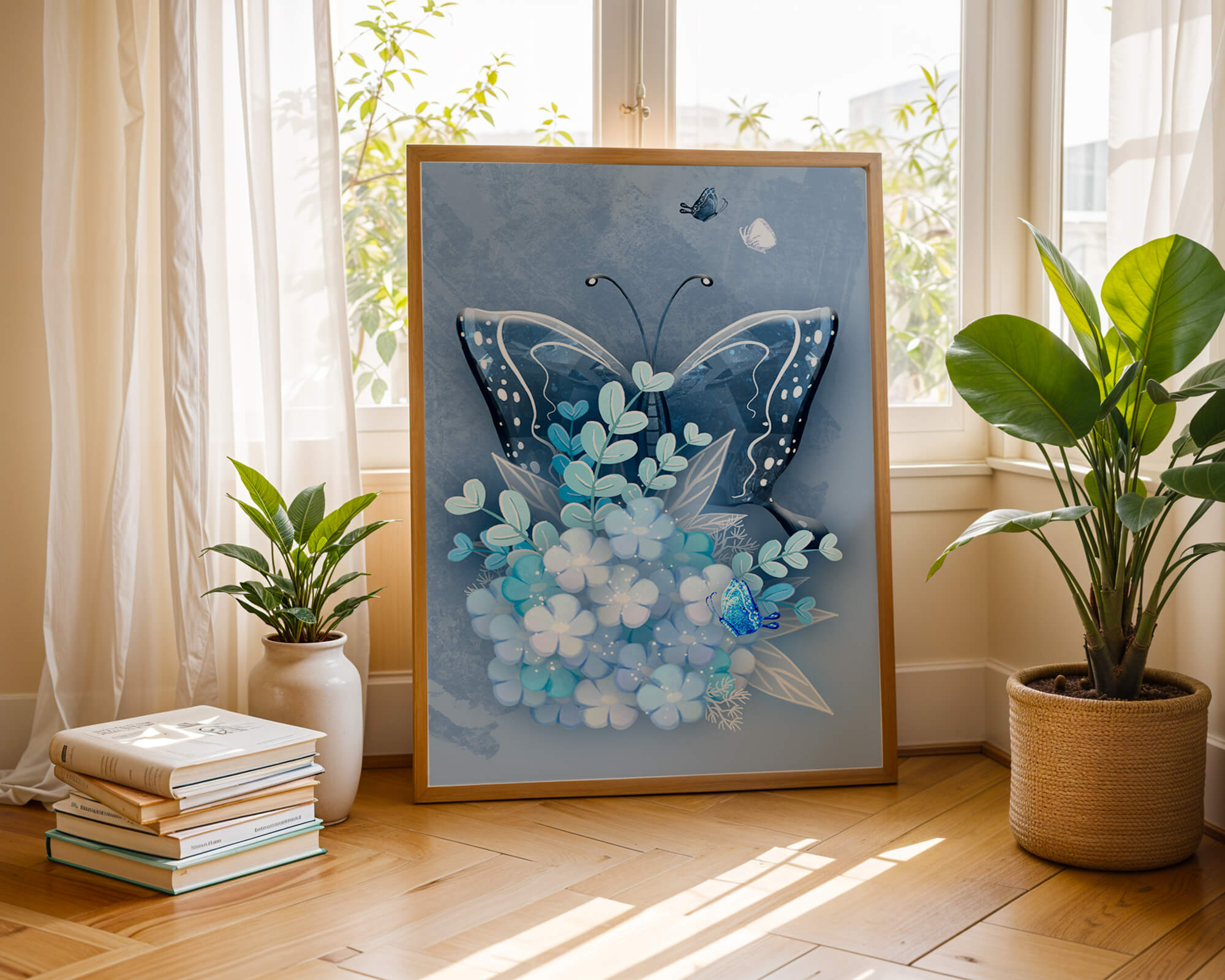 The centerpiece of this image is the elegantly crafted butterfly, depicted in a harmonious blend of blue and white hues. Its wings are intricately detailed with white and blue patterns, evoking a sense of grace and fluidity. Surrounding the butterfly is a lush bouquet of soft blue flowers and foliage, enhancing the artworks gentle and calming aesthetic.This piece is perfect for adding a touch of nature and elegance to any room. Its soothing color palette and intricate details make it an ideal choice for wall art in a living room, bedroom, or any space where a touch of whimsy and beauty is desired. The artwork beautifully balances art and nature, inviting a sense of tranquility into your decor.| Type |