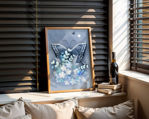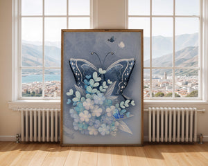 This captivating artwork features a beautiful butterfly set against a background of blue flowers and delicate leaves, creating a serene and enchanting visual.