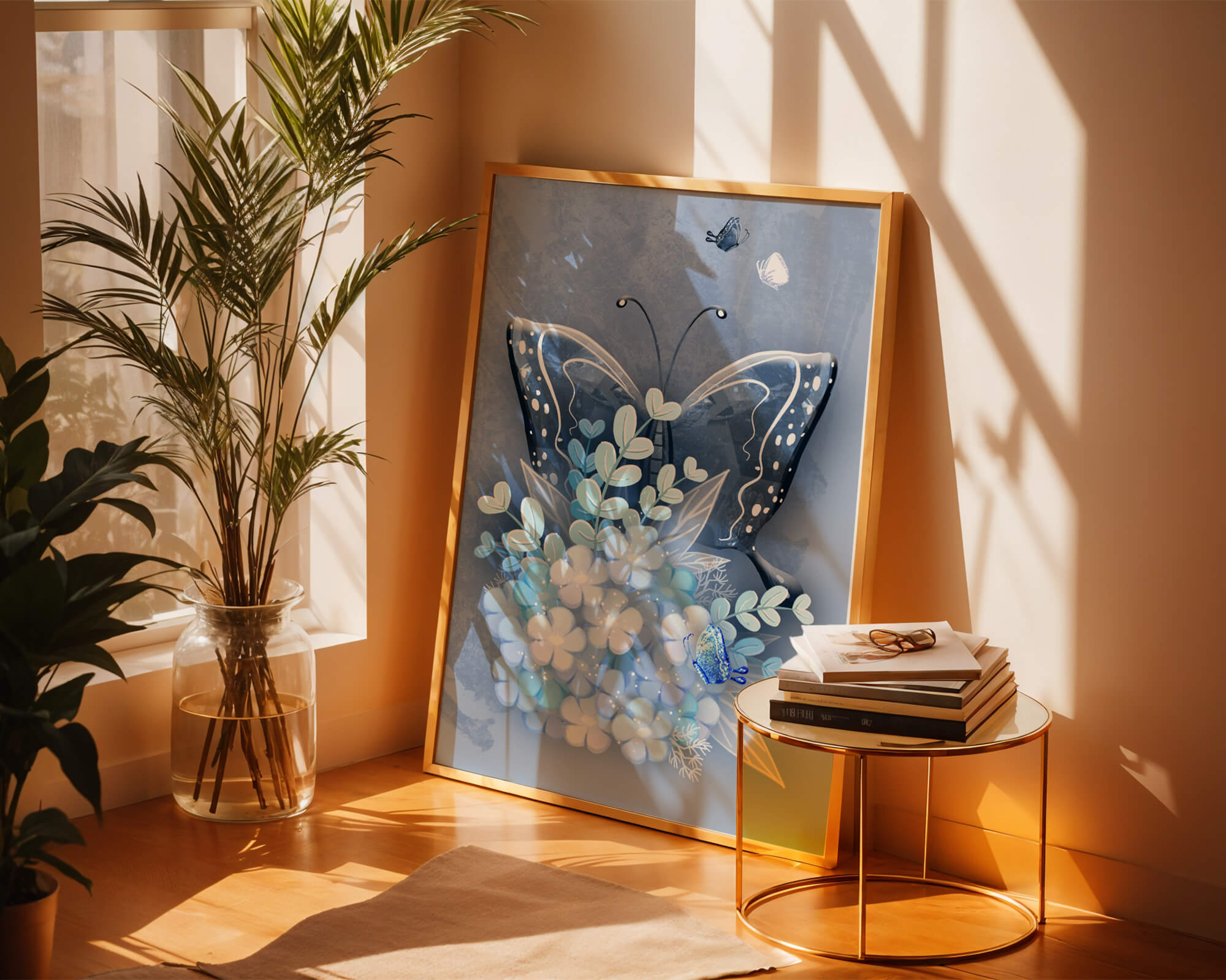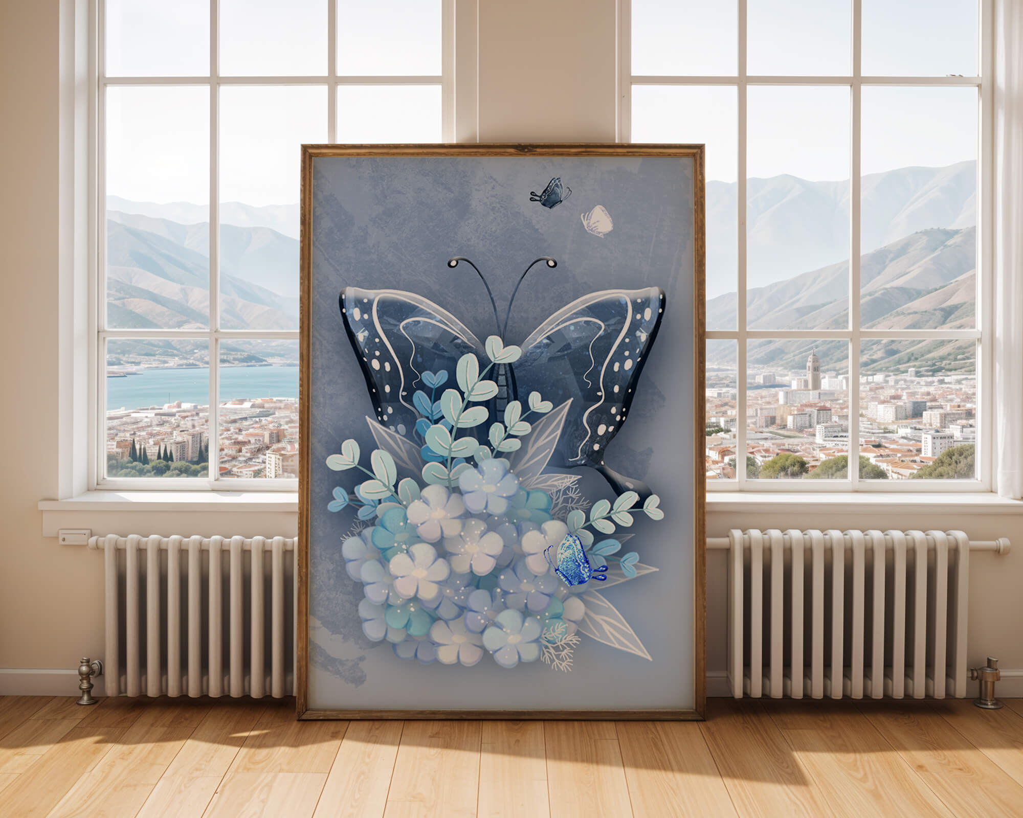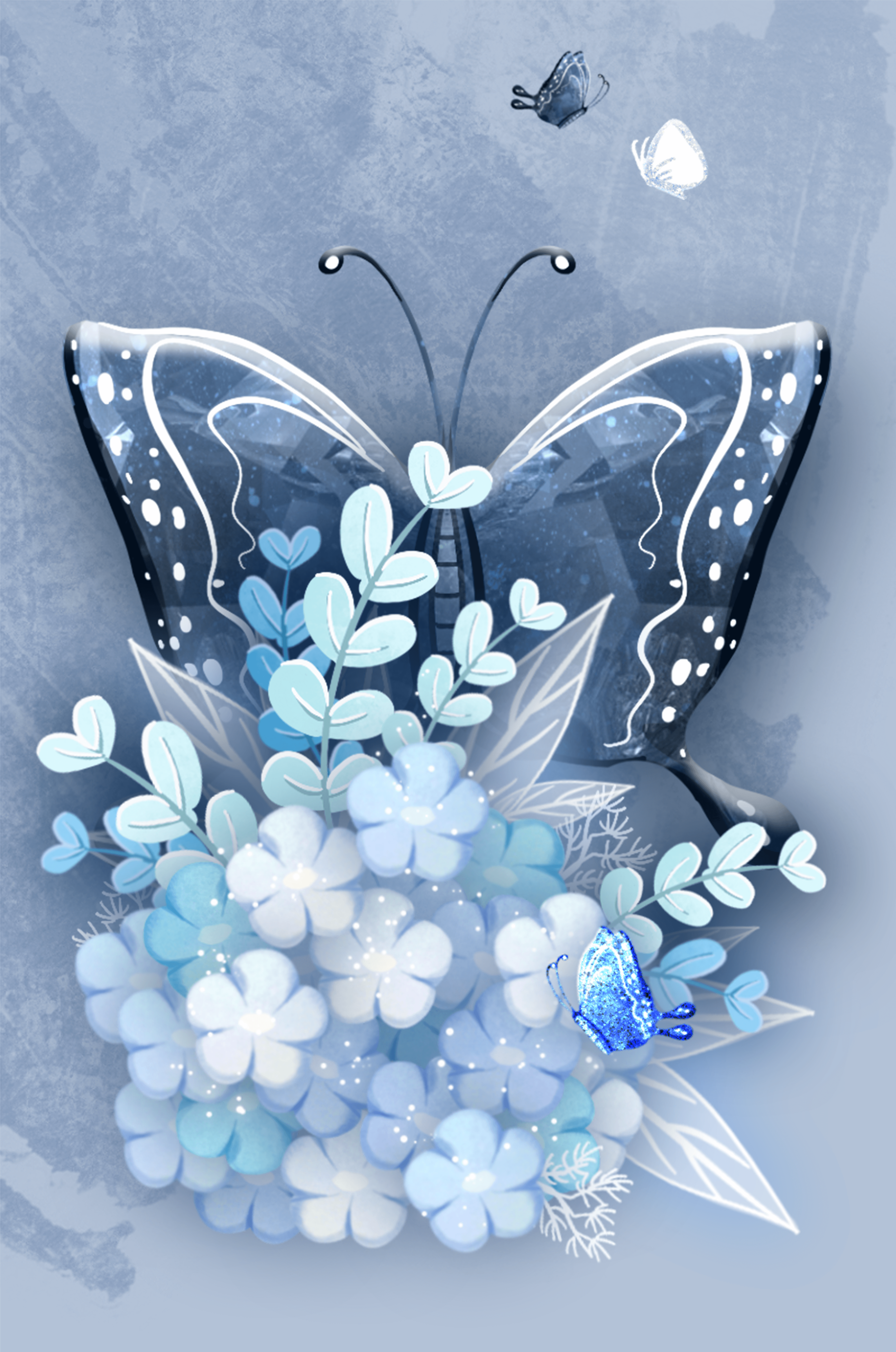 Elegant butterfly with blue floral arrangement artwork
