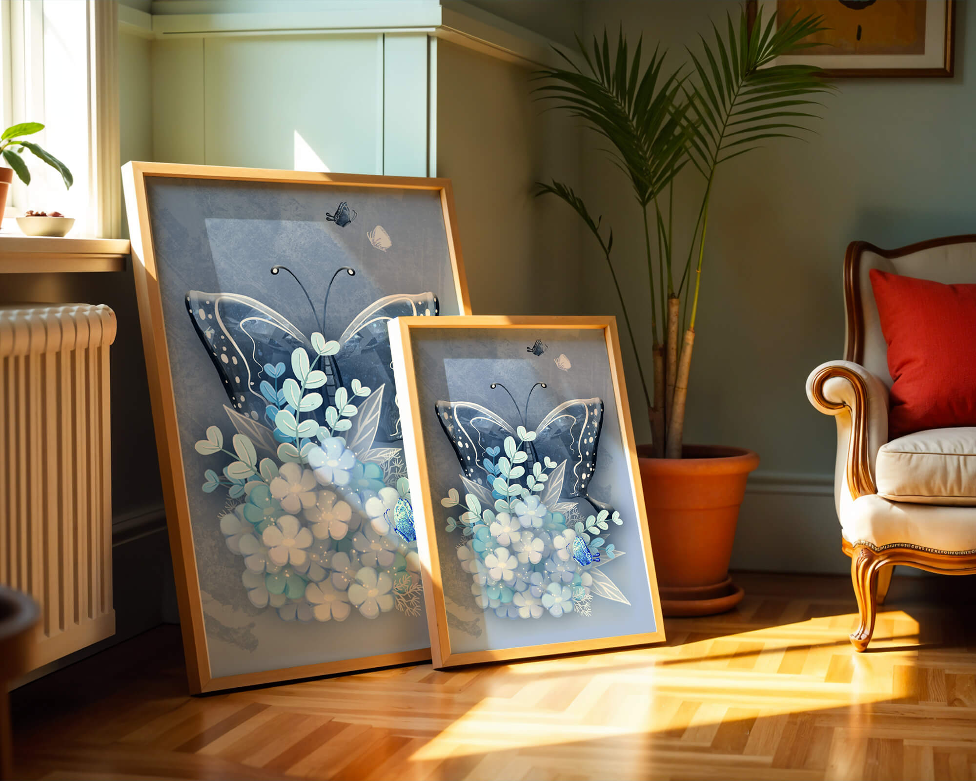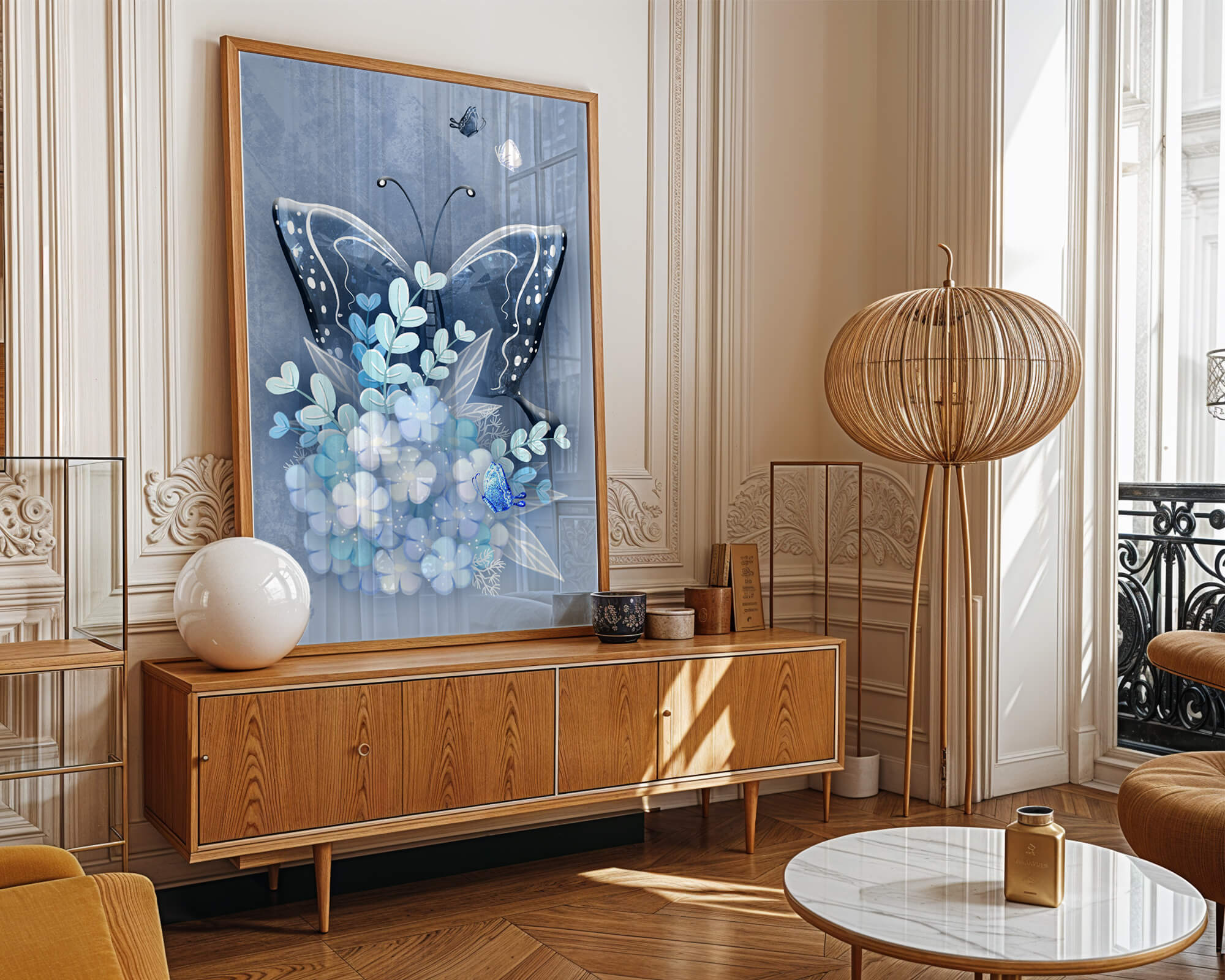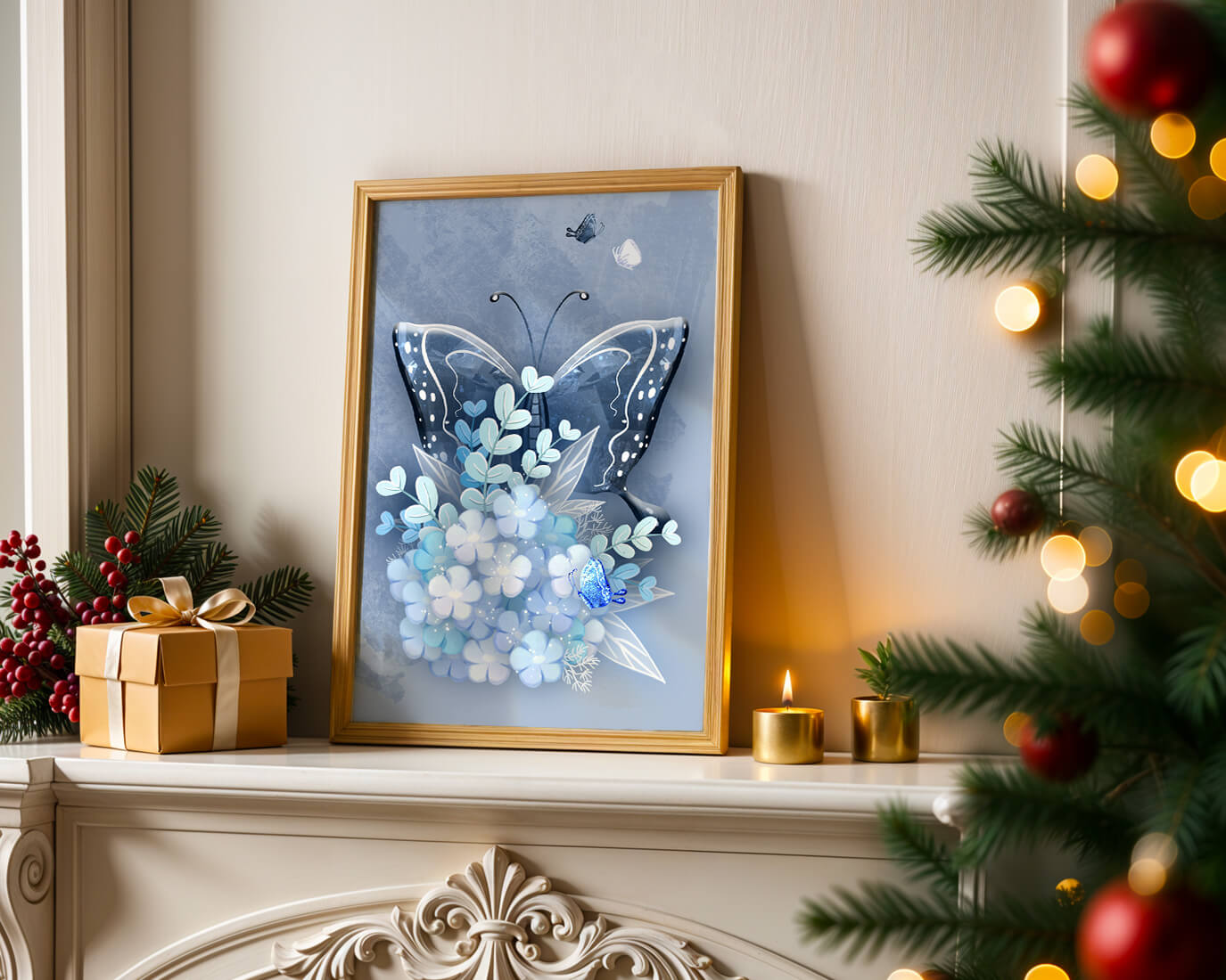 Elegant butterfly with blue floral arrangement artwork