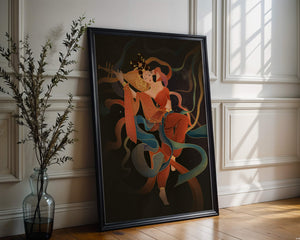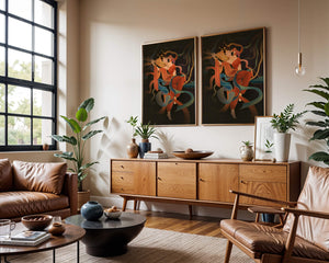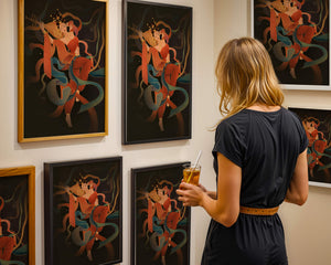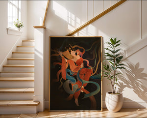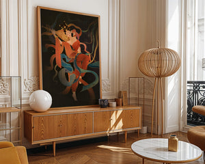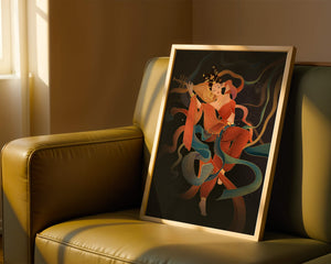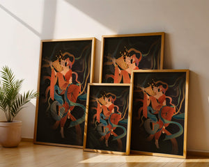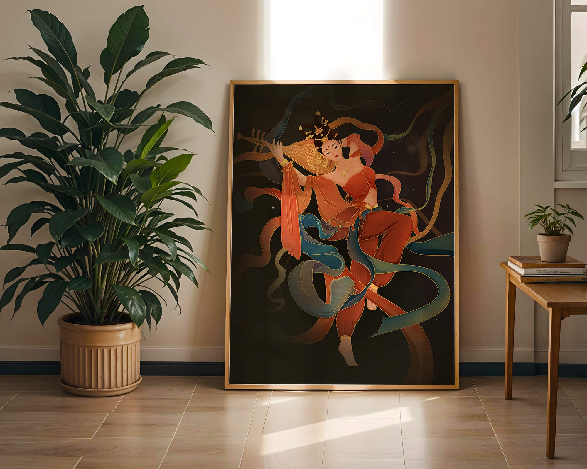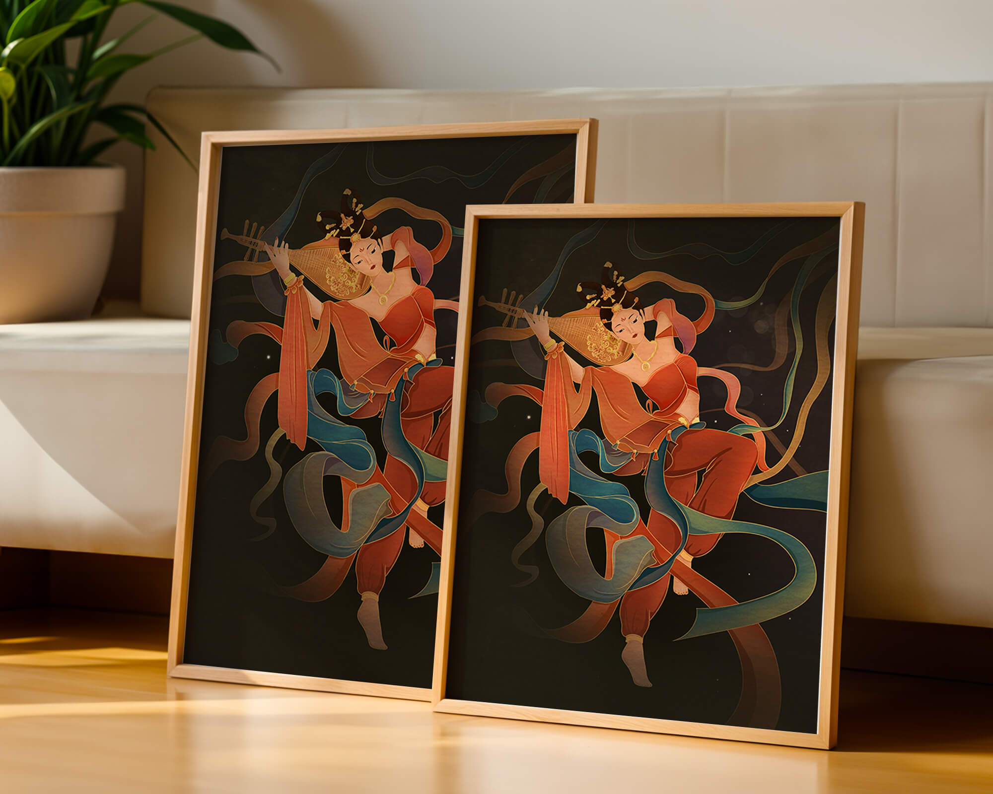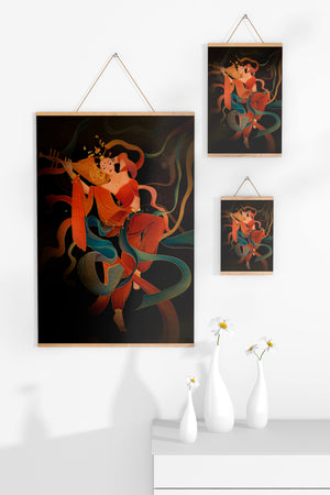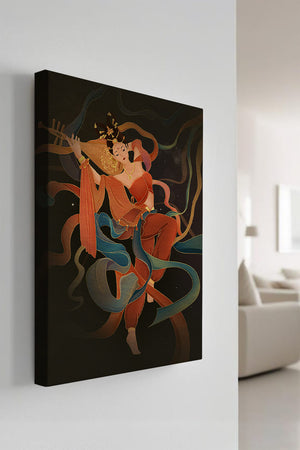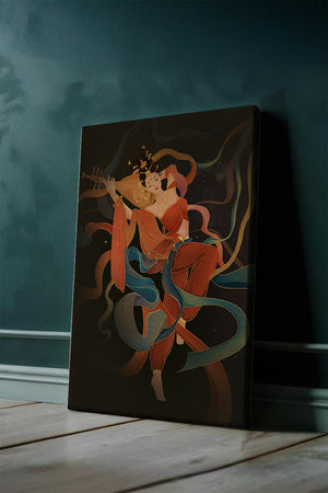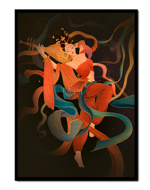 The artwork beautifully captures the essence of a goddess deeply absorbed in her musical expression. The lute, held gracefully in her hands, suggests a connection to traditional music, while her costume and jewelry reflect cultural richness. The swirling ribbons add a dynamic movement, symbolizing a dance that complements the enchanting sound of her instrument.The harmonious blend of colors, from the soft hues of her clothing to the shimmering gold accents, creates an atmosphere of serenity and charm. The detailed rendering of each element, from her intricate hairstyle to the delicate motifs on her attire, showcases the skilled artistry. This image serves as a captivating piece that brings a sense of tranquility a| Type |