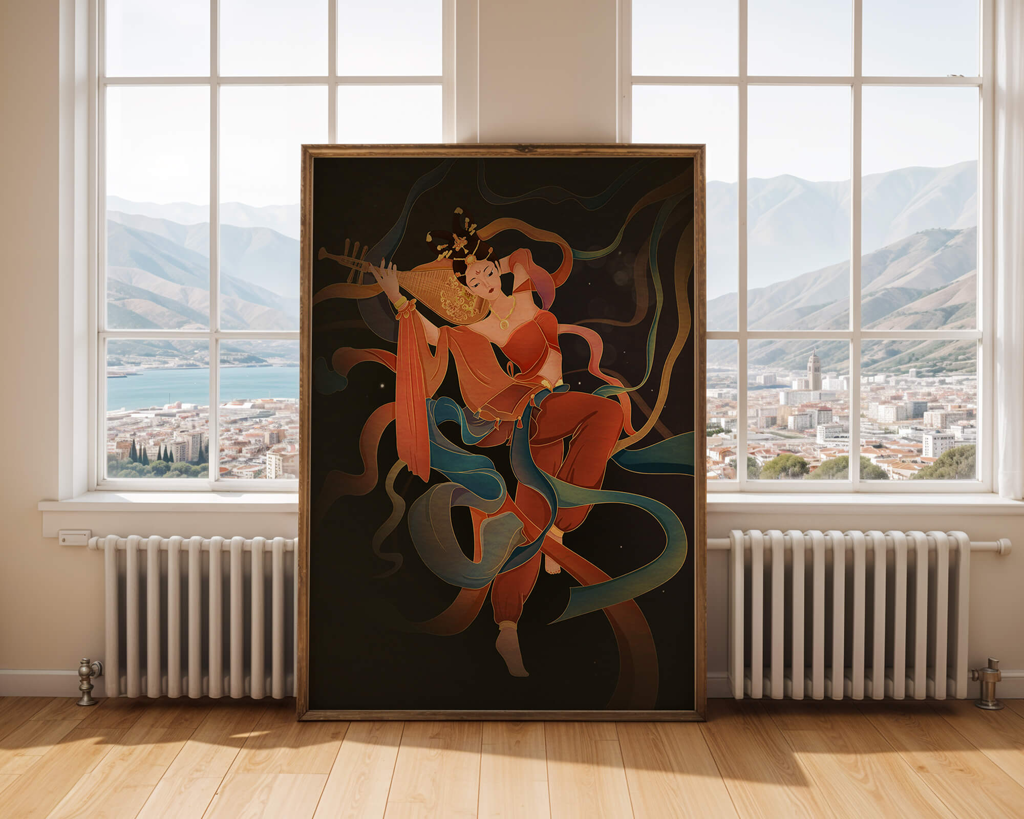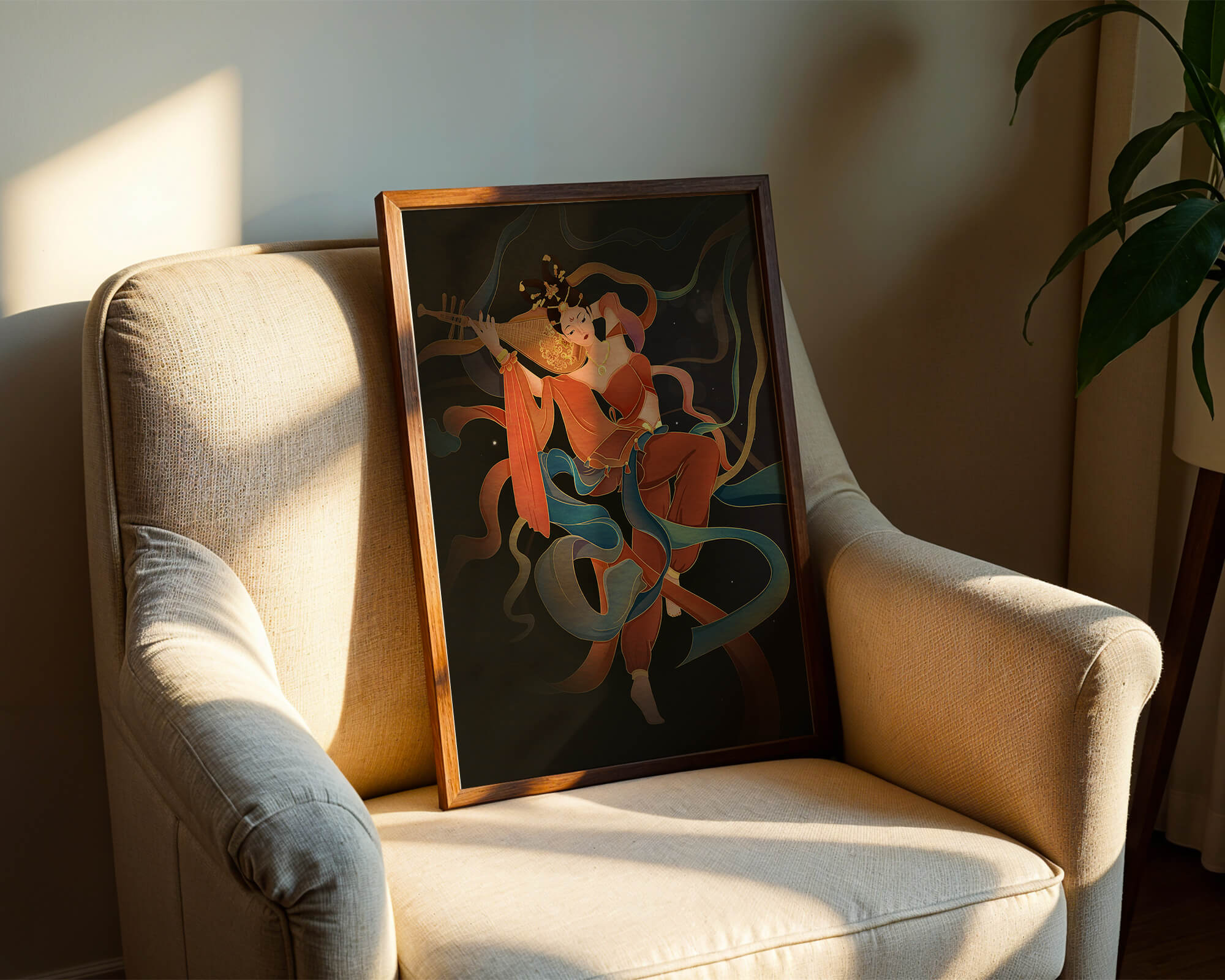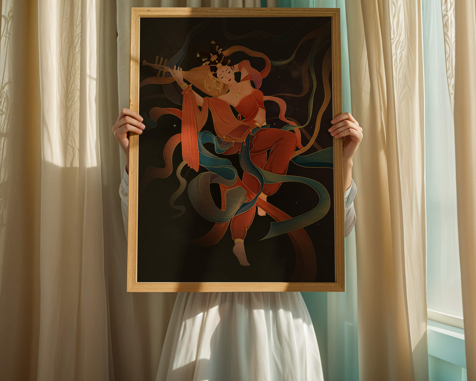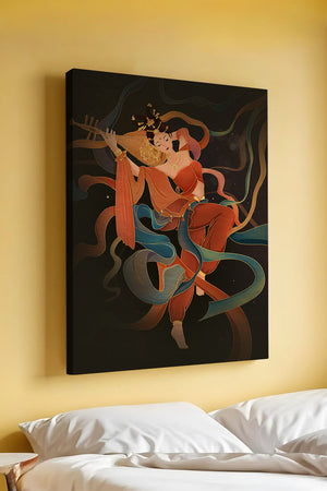 Elegant depiction of a goddess playing a lute with flowing ribbons