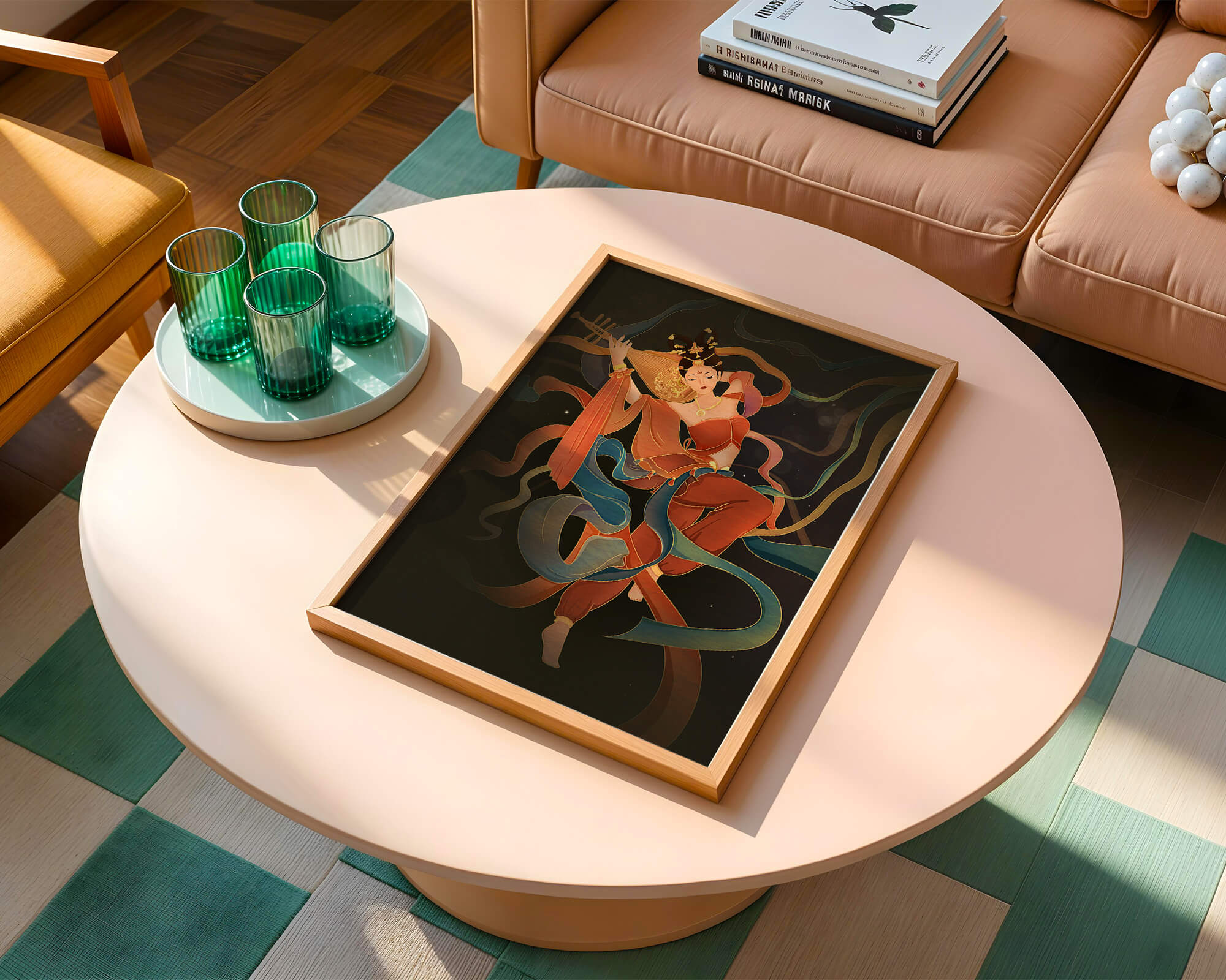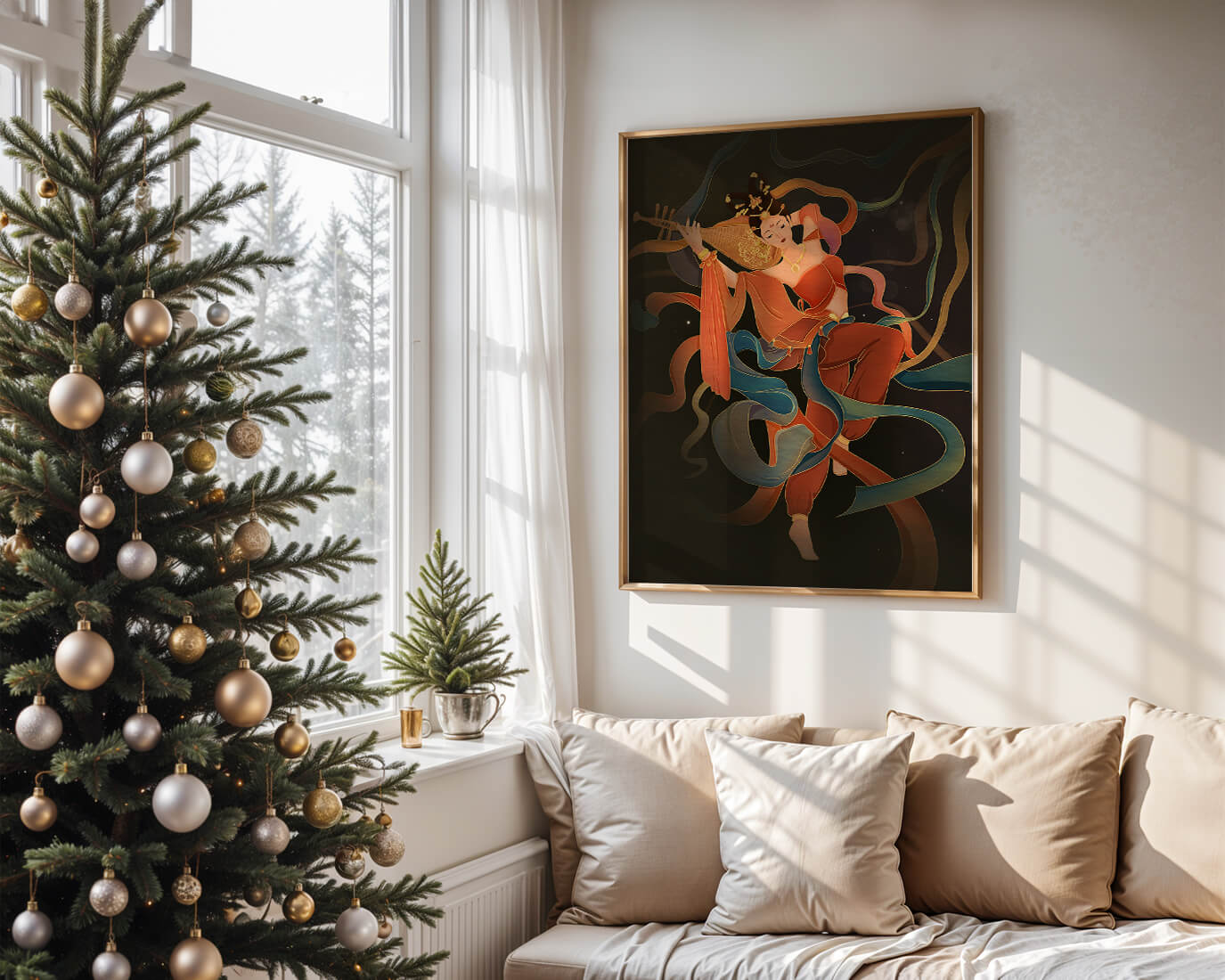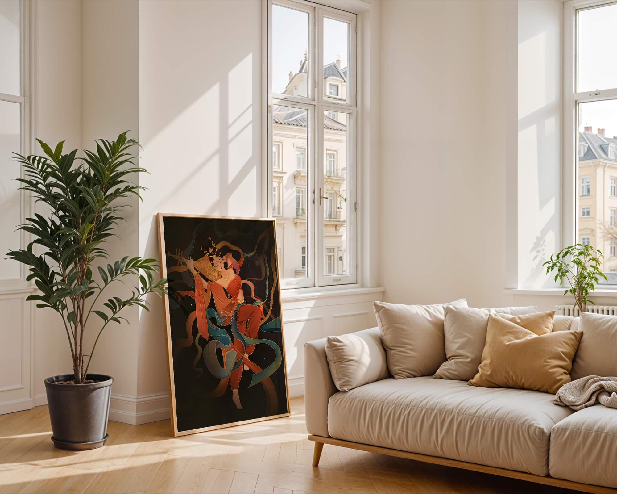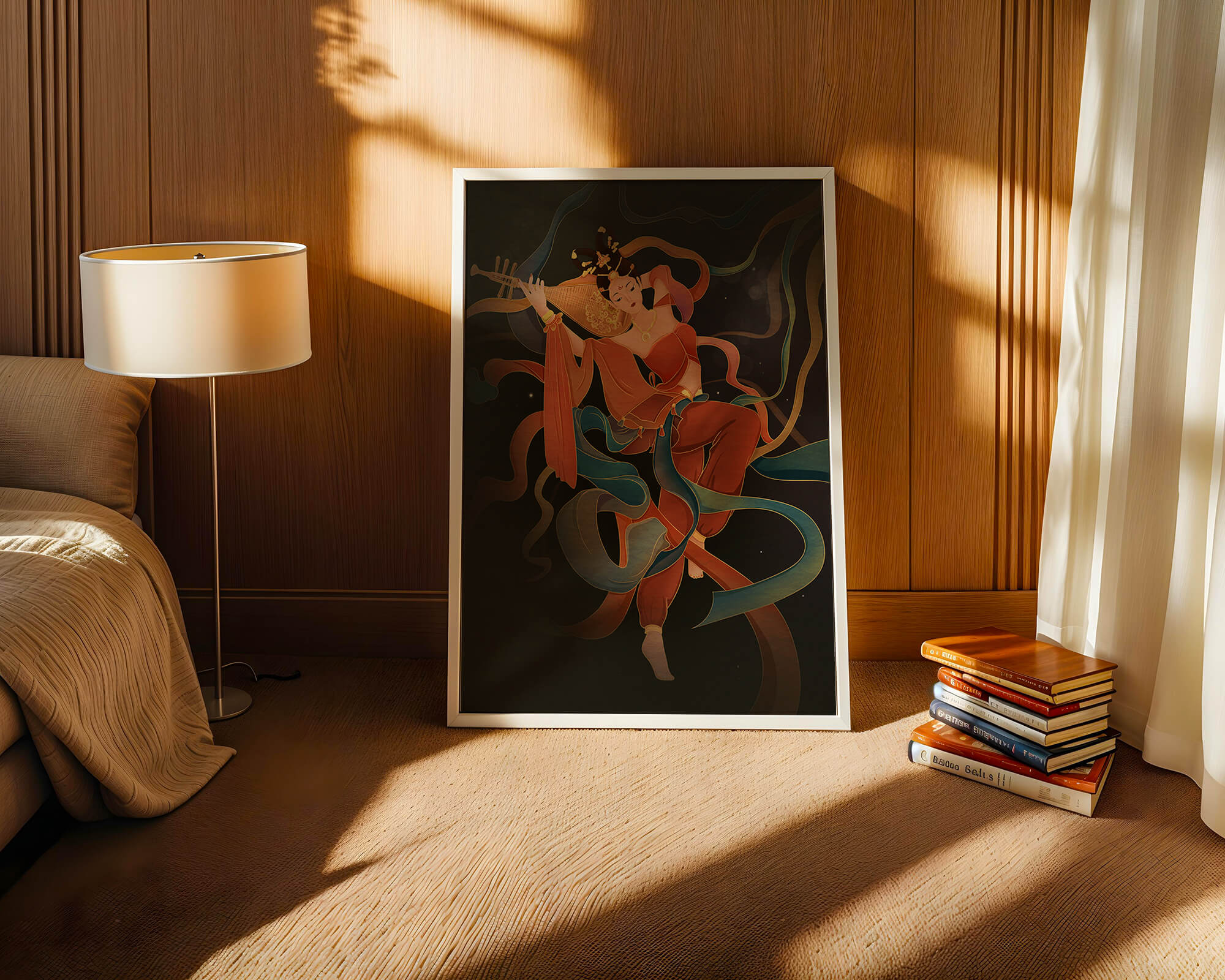 Elegant depiction of a goddess playing a lute with flowing ribbons