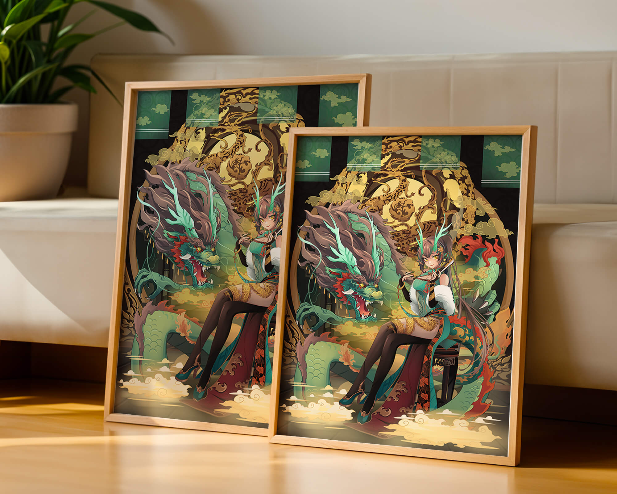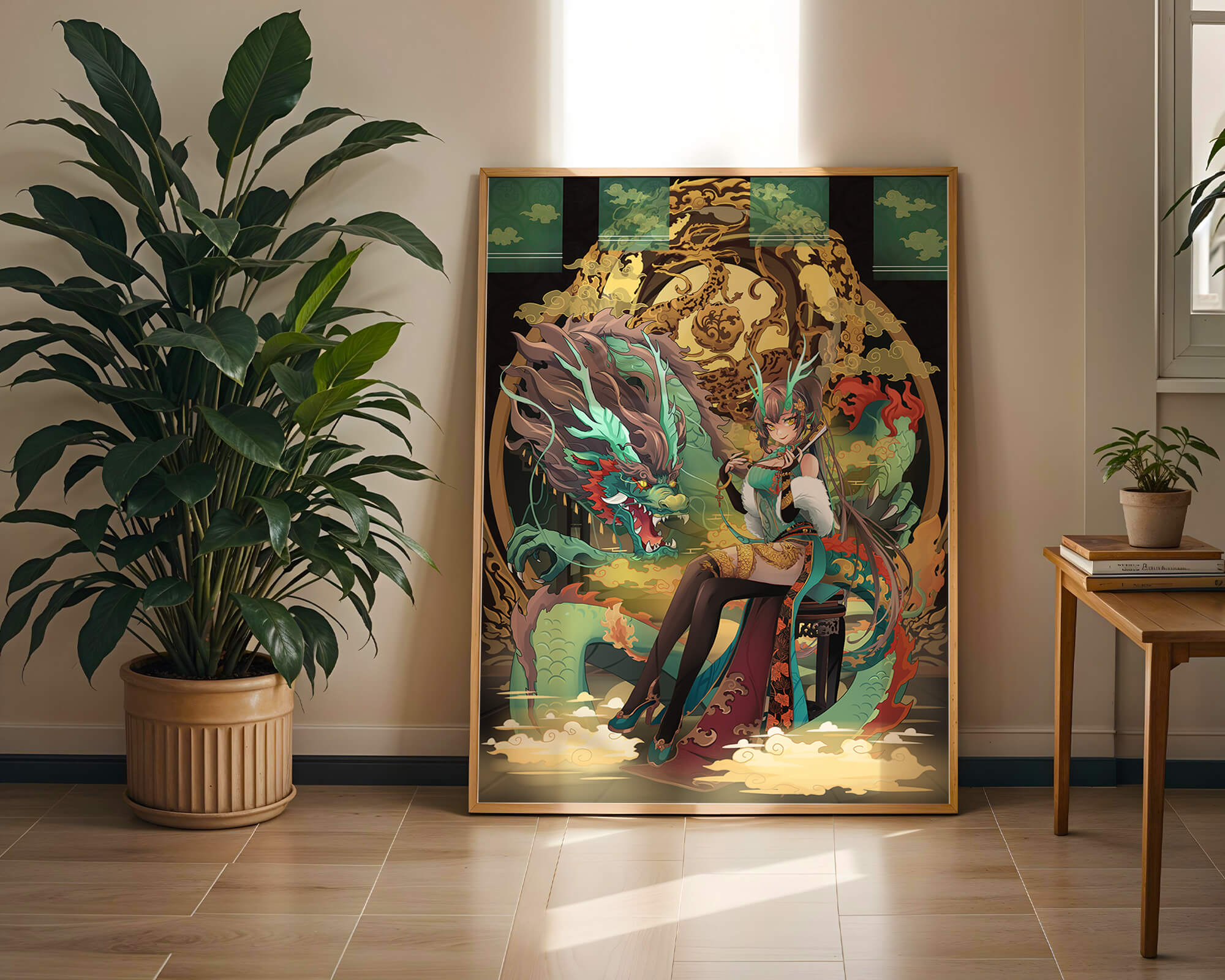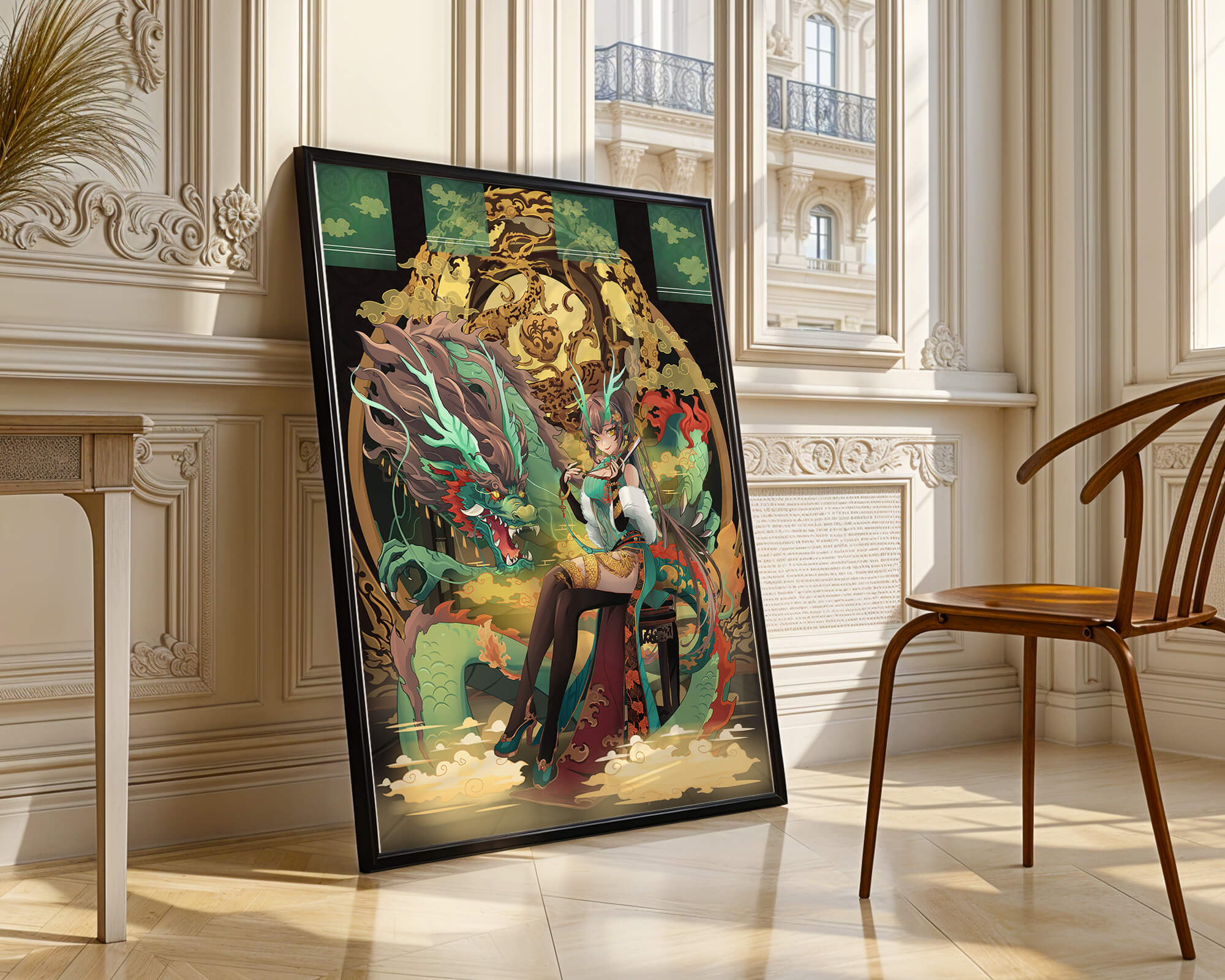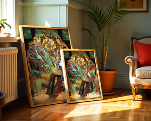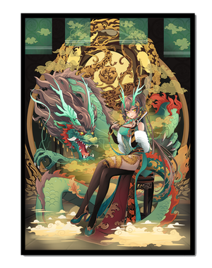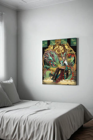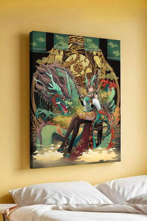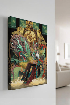 The image showcases a beautifully detailed dragon intertwined with a poised woman. The dragons vivid green scales and fierce expression add an element of majesty. Golden ornamentation highlights the background, complementing the woman’s elegant attire and complementing her confident pose. Decorating a space with such artwork can transform the room by infusing a sense of mysticism and culture. Ideal for living rooms, bedrooms, or studies, this artwork serves as a conversation starter and a focal point. The combination of ornamental details and the mystical theme brings a unique charm to any setting.| Type |