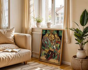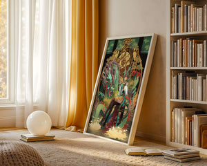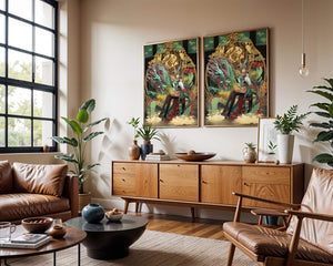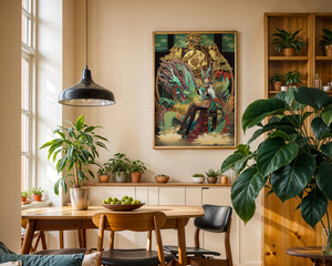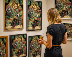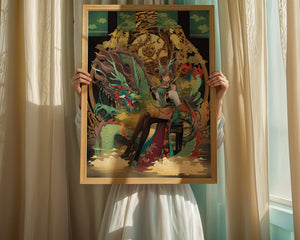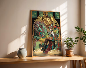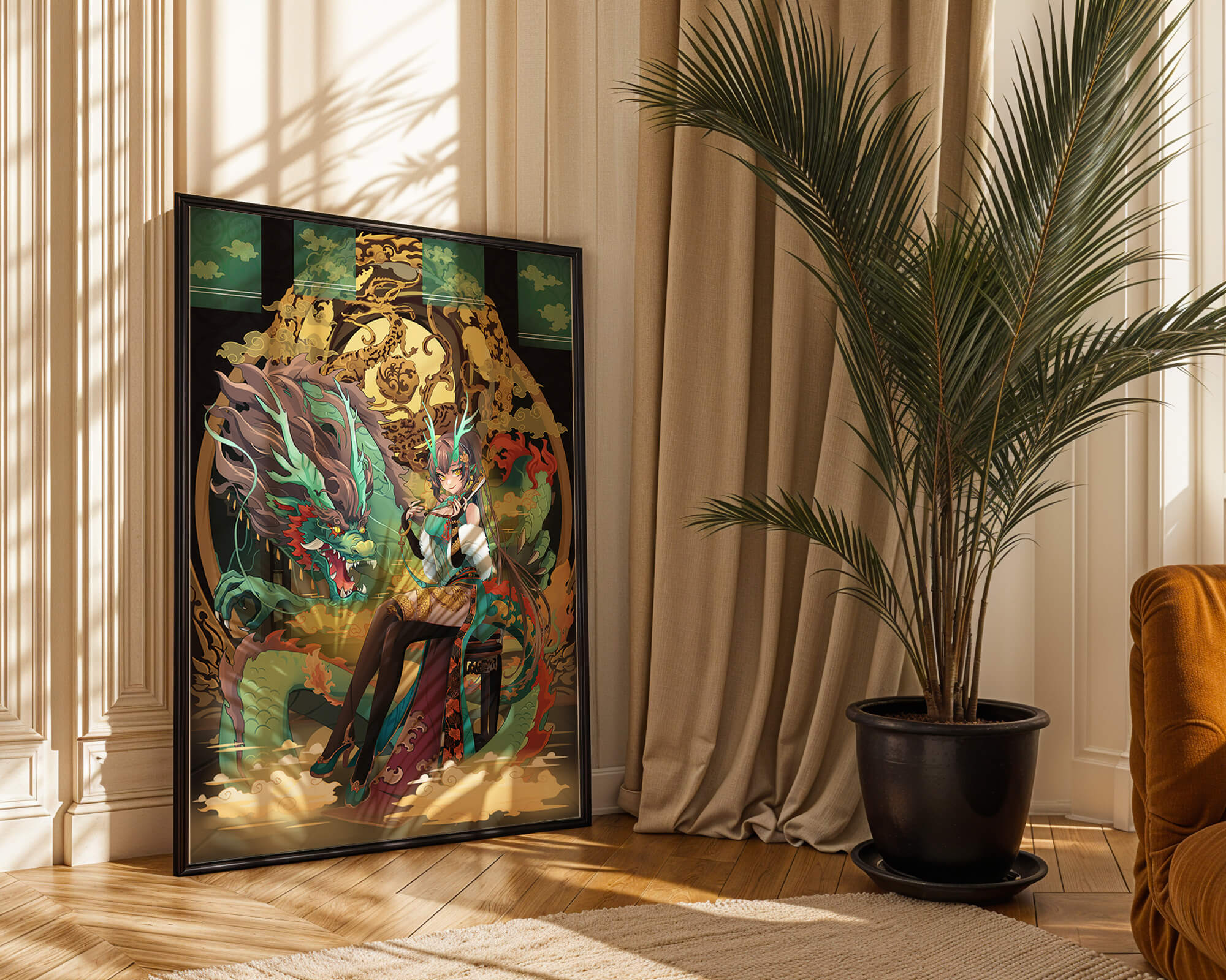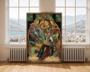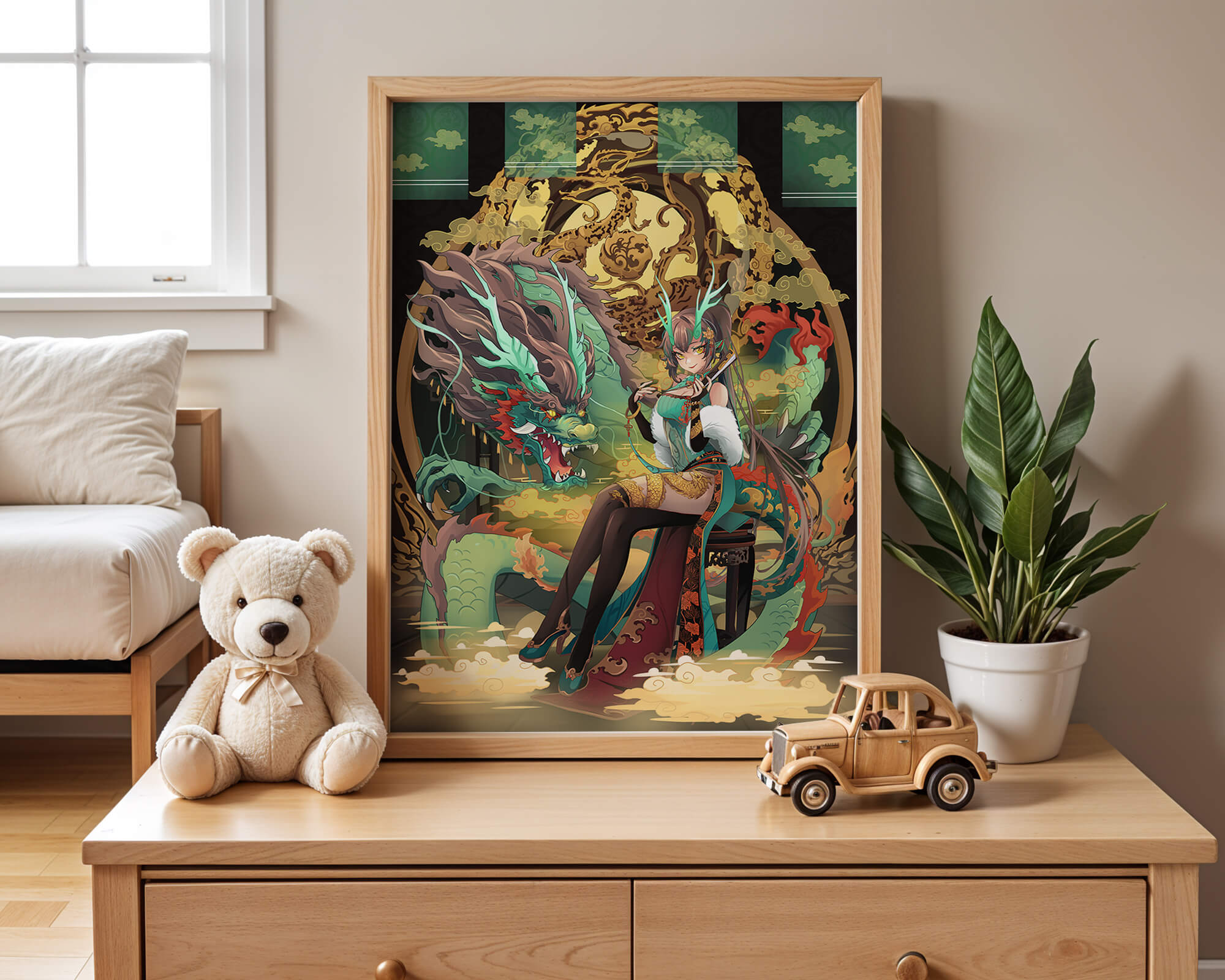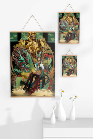 The image showcases a beautifully detailed dragon intertwined with a poised woman. The dragons vivid green scales and fierce expression add an element of majesty. Golden ornamentation highlights the background, complementing the woman’s elegant attire and complementing her confident pose. Decorating a space with such artwork can transform the room by infusing a sense of mysticism and culture. Ideal for living rooms, bedrooms, or studies, this artwork serves as a conversation starter and a focal point. The combination of ornamental details and the mystical theme brings a unique charm to any setting.| Type |