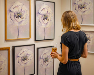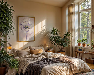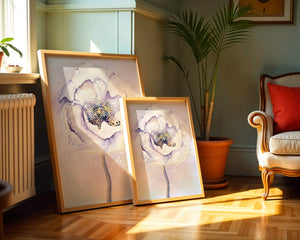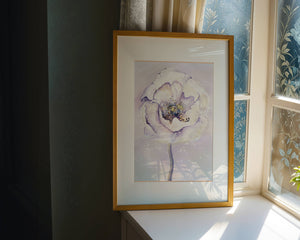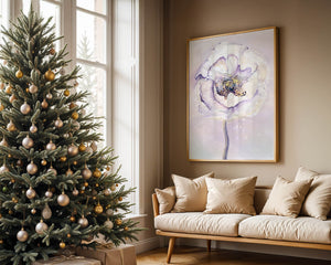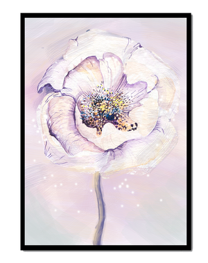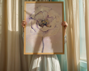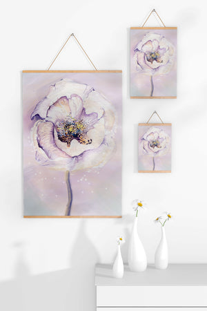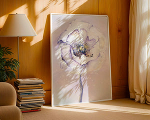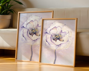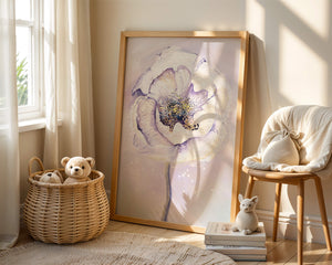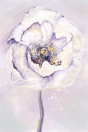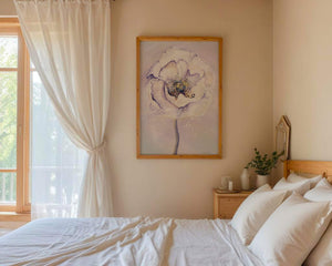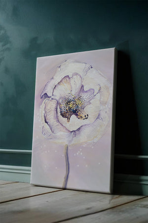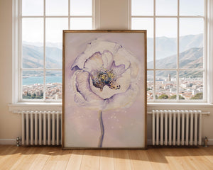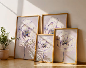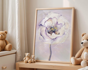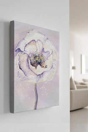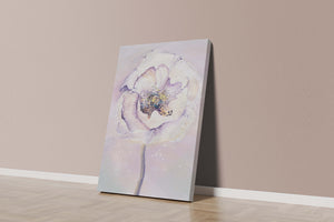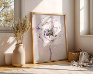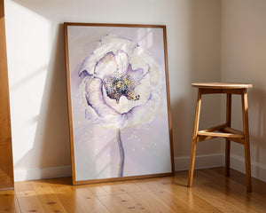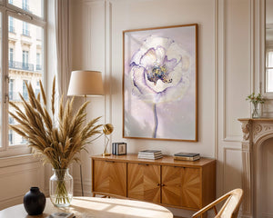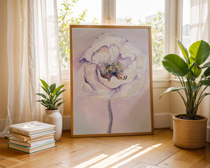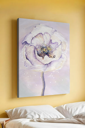 The illustration features a large, softly colored flower painted in watercolor, detailed with shades of purple, yellow, and off-white. Its petals are richly textured, giving a three-dimensional feel and a sense of depth. The center of the flower is detailed with delicate specks of color, adding complexity to the overall composition.The background is a soft blend of pastel hues, seamlessly blending with the flower and enhancing its gentle, soothing appeal. This art piece would be ideal for spaces that require a touch of natures tranquility, such as a living room or bedroom, offering a serene and modern aesthetic.| Type |