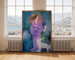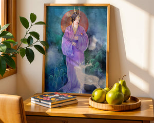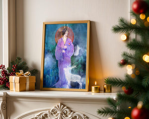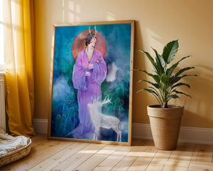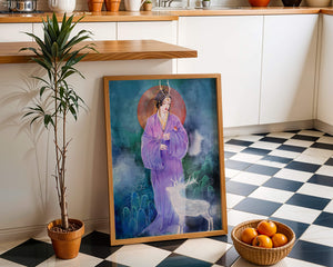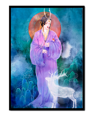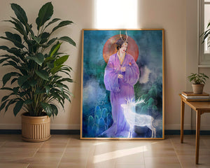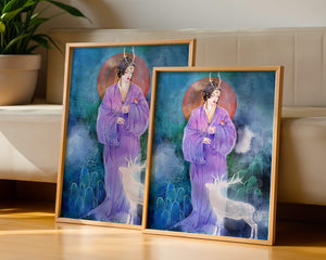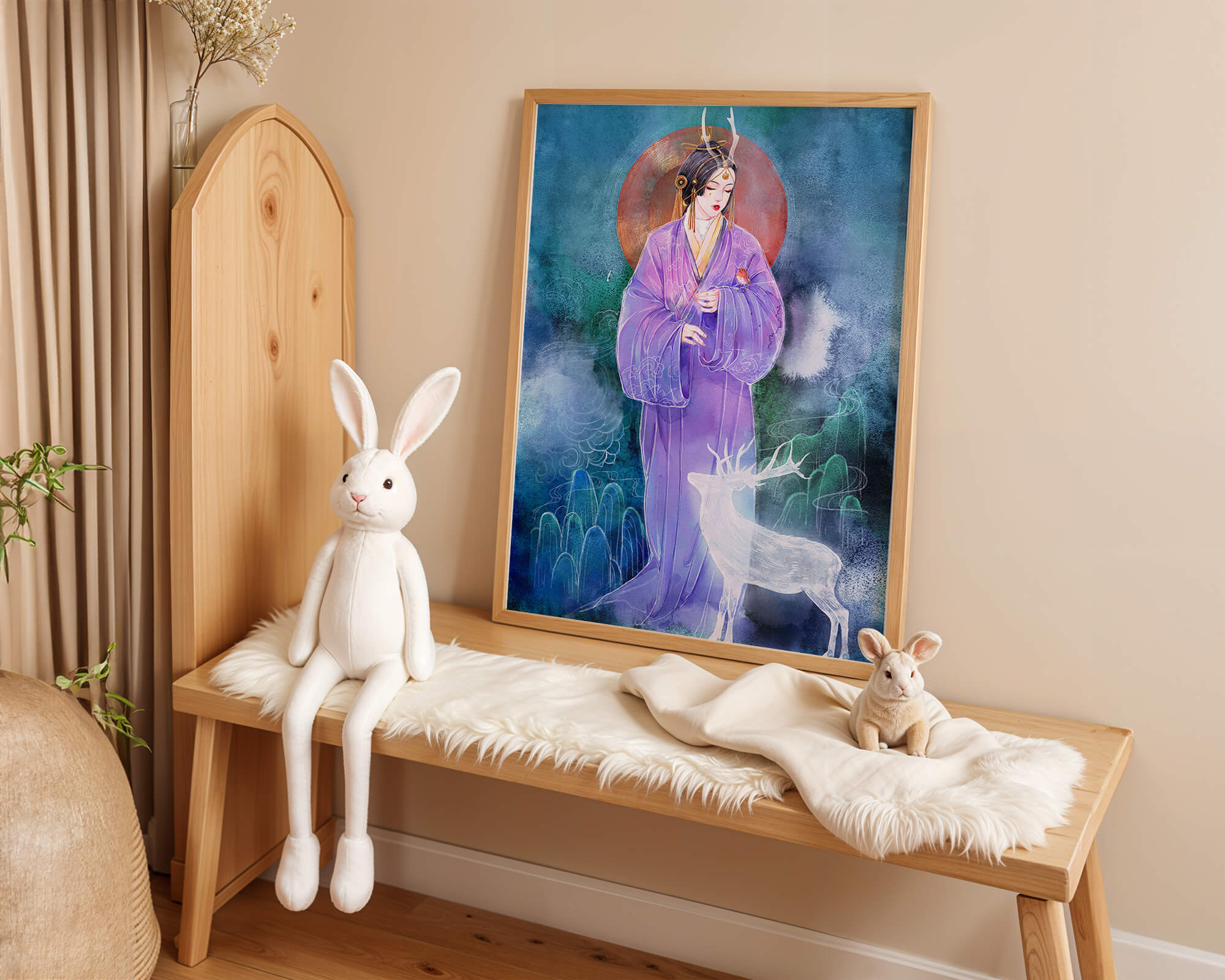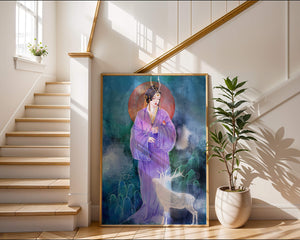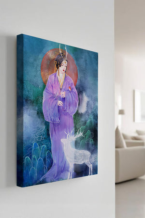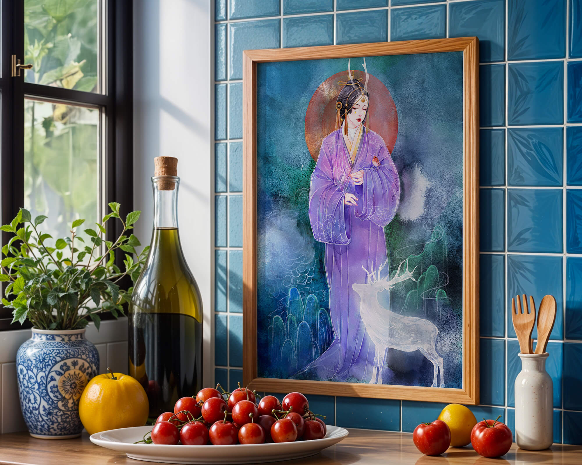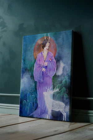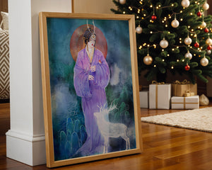 The artwork captures a mystical scene featuring an elegantly dressed woman in a traditional kimono, accompanied by a spectral deer. Both figures are set against a backdrop that blends serene blue and purple hues, with hints of gold.