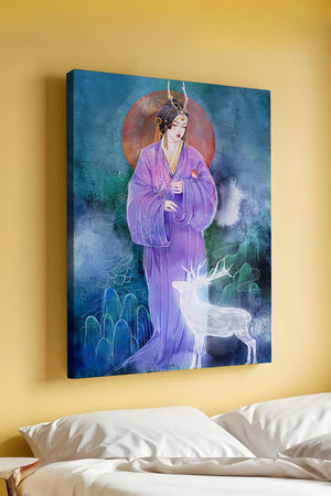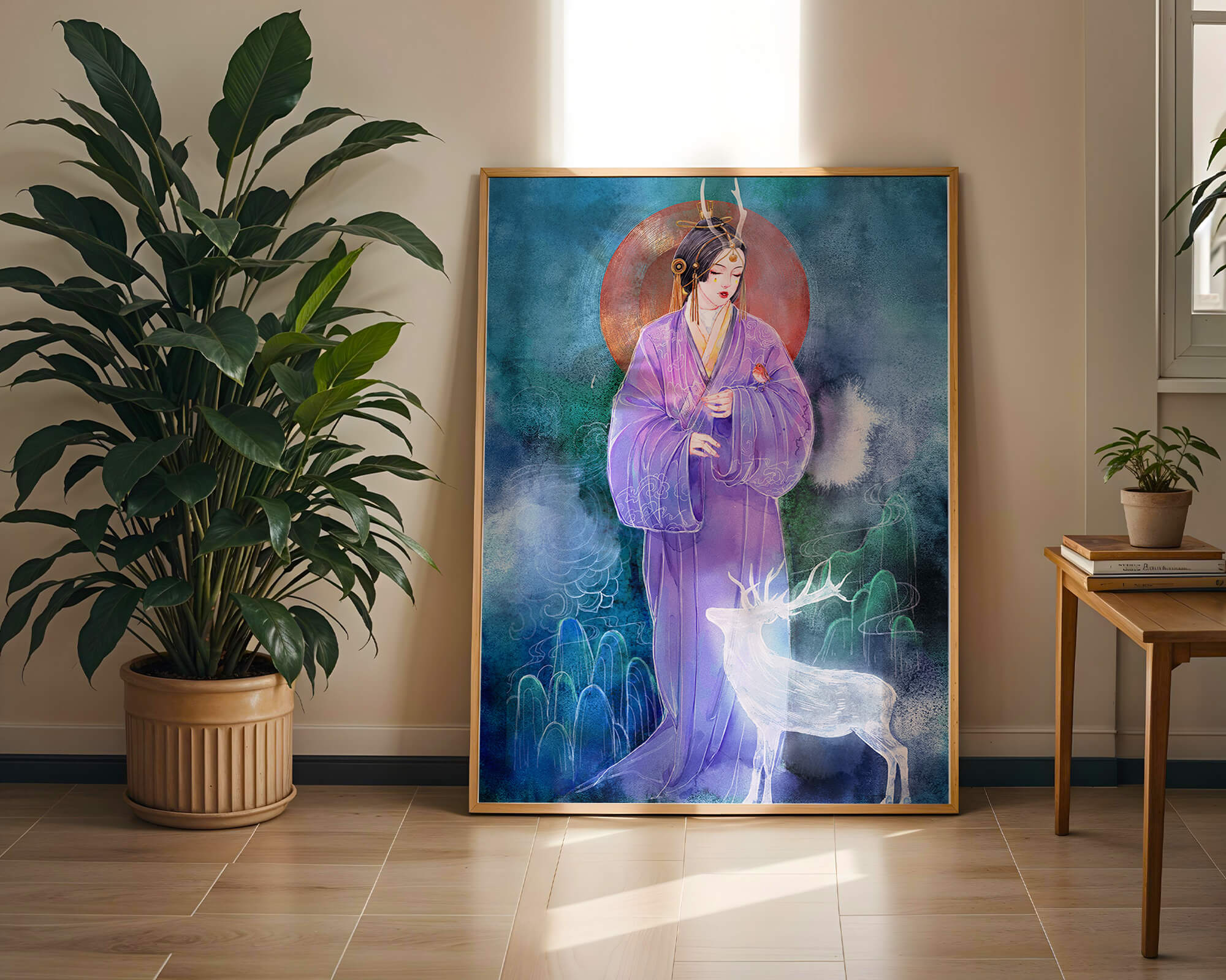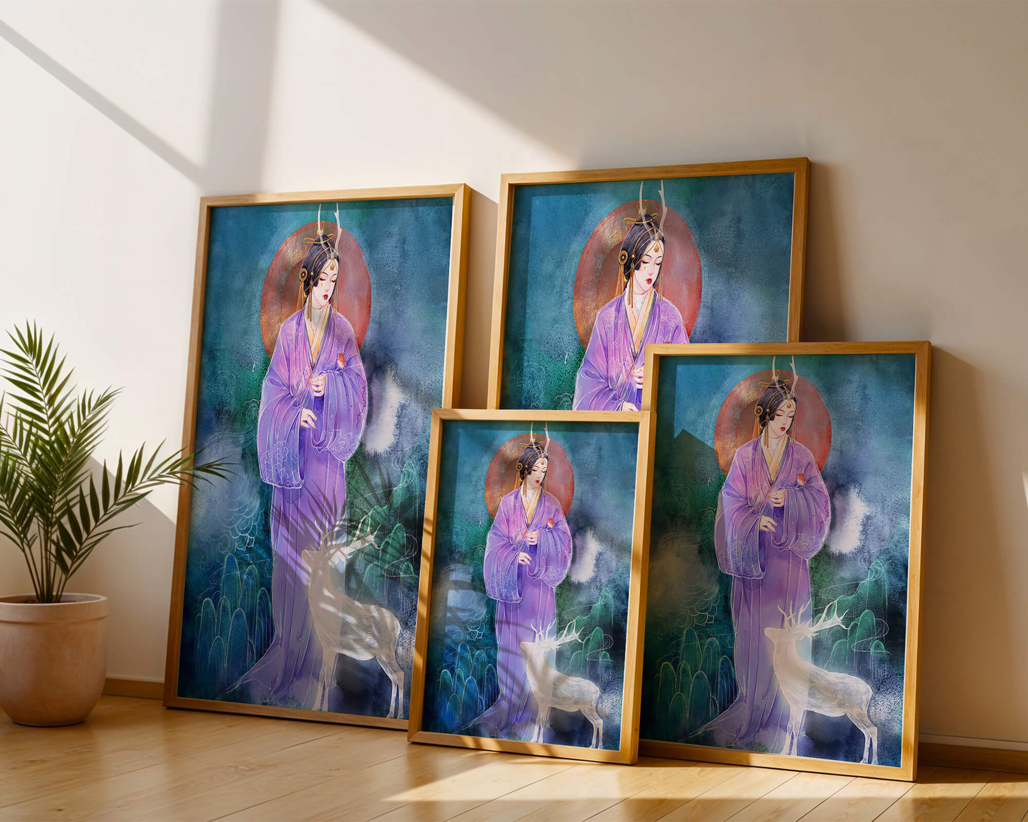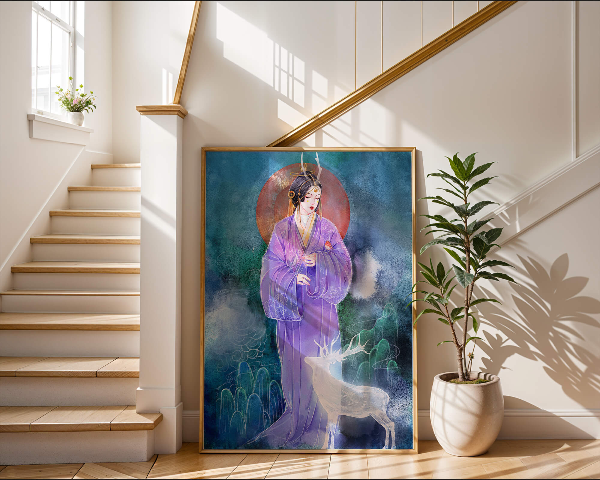 This visually captivating piece presents a harmonious blend of cultural elements and natural beauty. The woman, adorned in a detailed kimono with ethereal antlers, embodies a gentle grace. Her serene expression and poised demeanor suggest a deep connection with nature. Beside her, the translucent deer stands as a symbol of purity and mysticism, introducing a whisper of fantasy into the composition.The background complements the figures with its subtle blend of blues and purples, evoking a sense of tranquility and depth. Soft patterns resembling misty landscapes enhance the enchanting mood. Hints of gold add a touch of elegance, drawing the viewers eye to the intricate details and elevating the paintings sophisticate| Type |