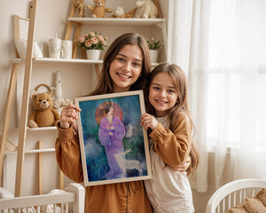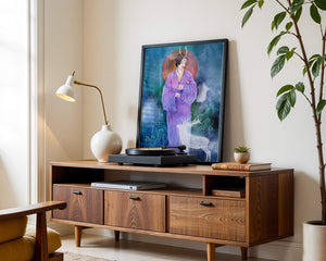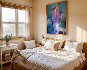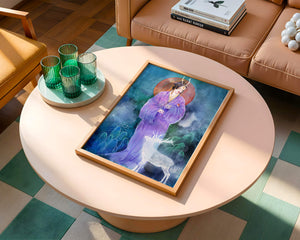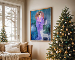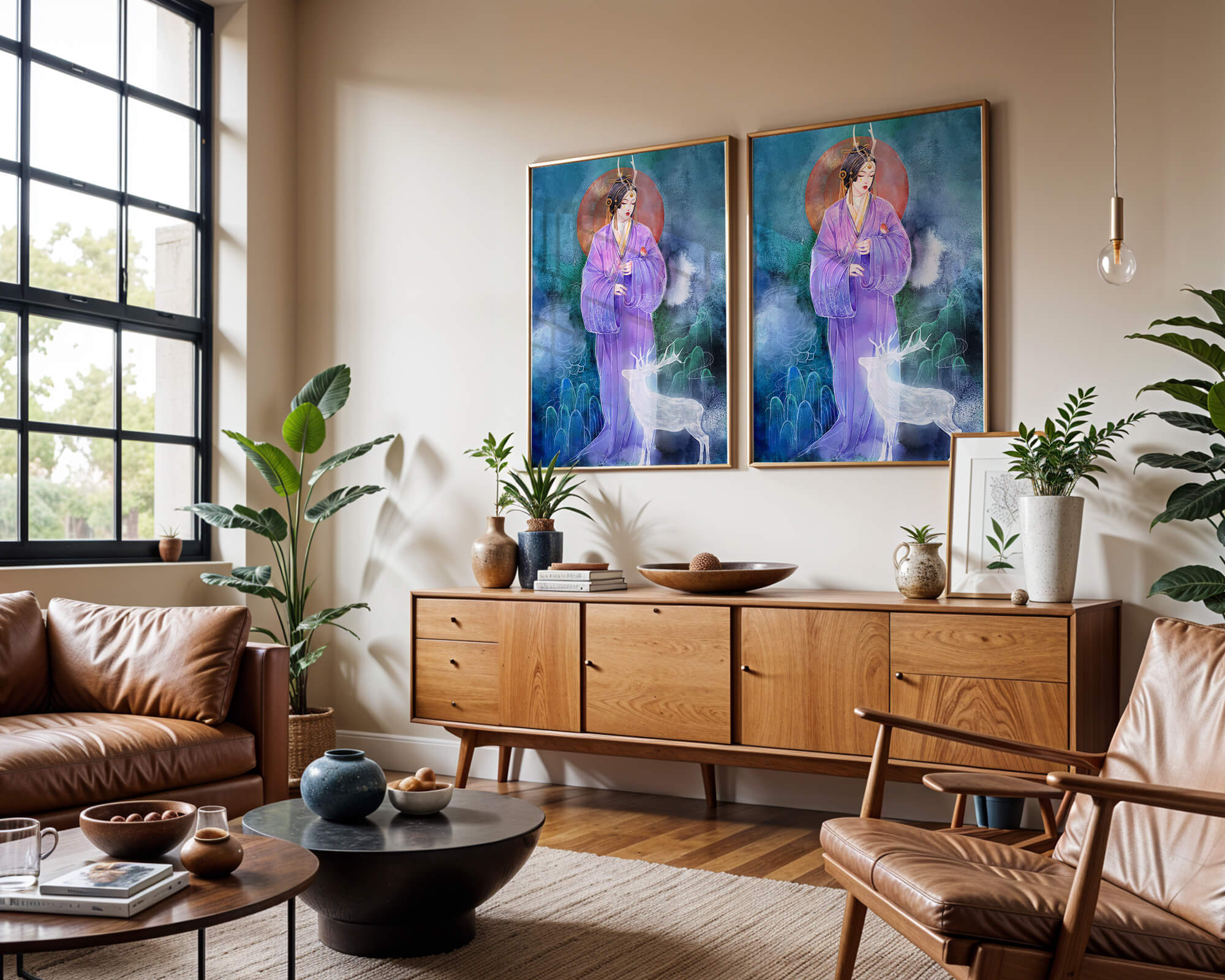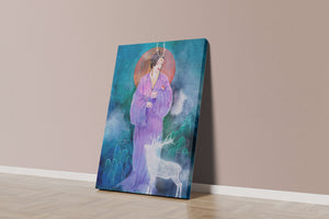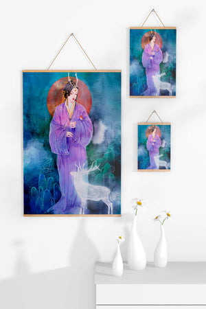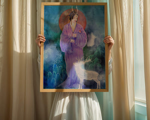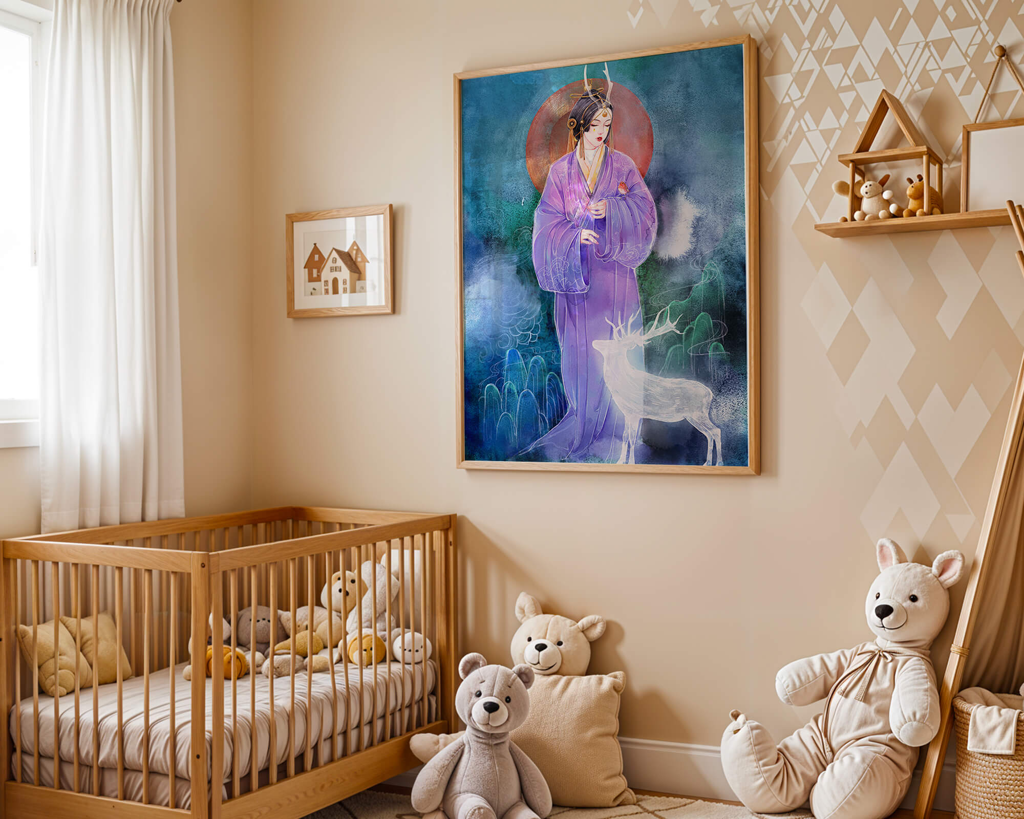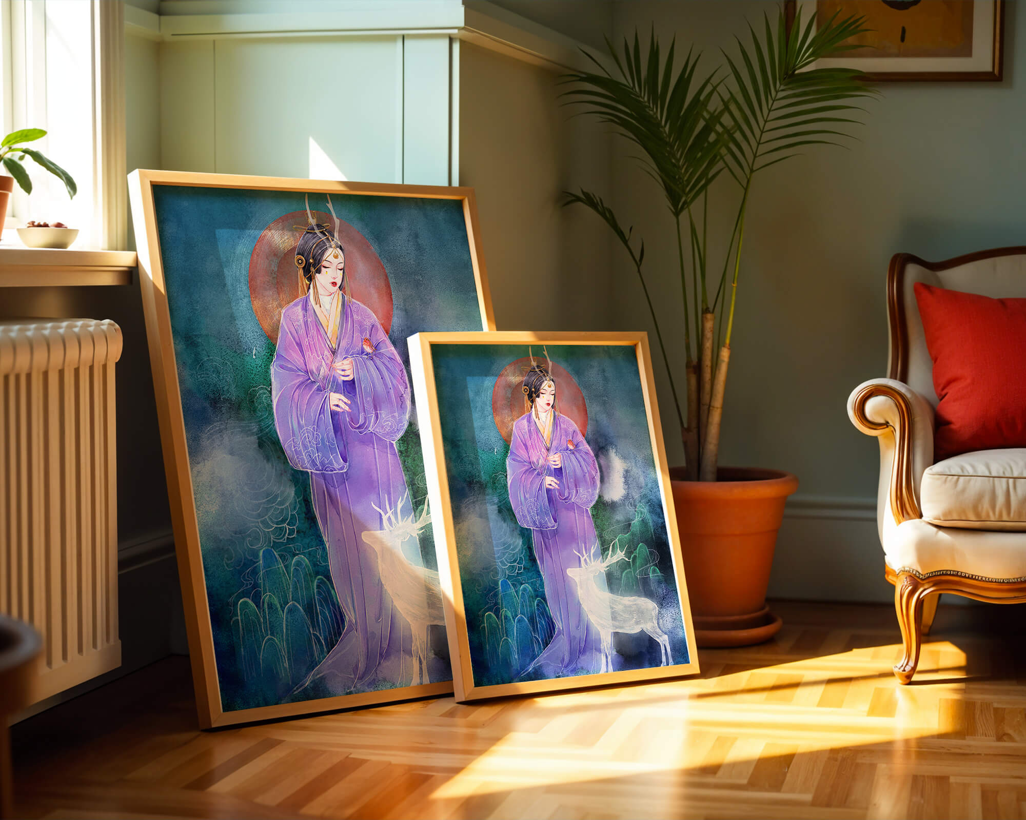 This visually captivating piece presents a harmonious blend of cultural elements and natural beauty. The woman, adorned in a detailed kimono with ethereal antlers, embodies a gentle grace. Her serene expression and poised demeanor suggest a deep connection with nature. Beside her, the translucent deer stands as a symbol of purity and mysticism, introducing a whisper of fantasy into the composition.The background complements the figures with its subtle blend of blues and purples, evoking a sense of tranquility and depth. Soft patterns resembling misty landscapes enhance the enchanting mood. Hints of gold add a touch of elegance, drawing the viewers eye to the intricate details and elevating the paintings sophisticate| Type |