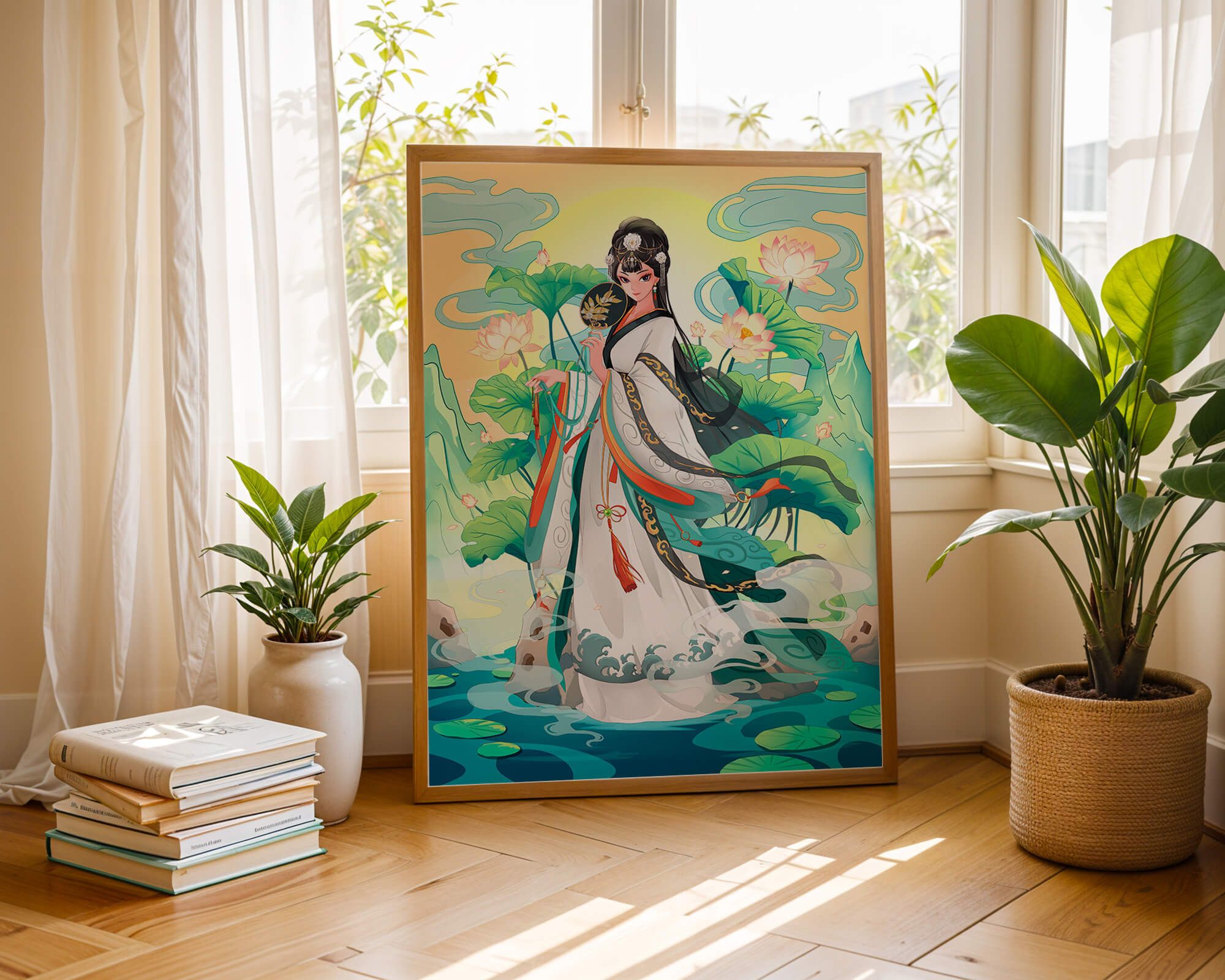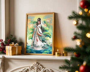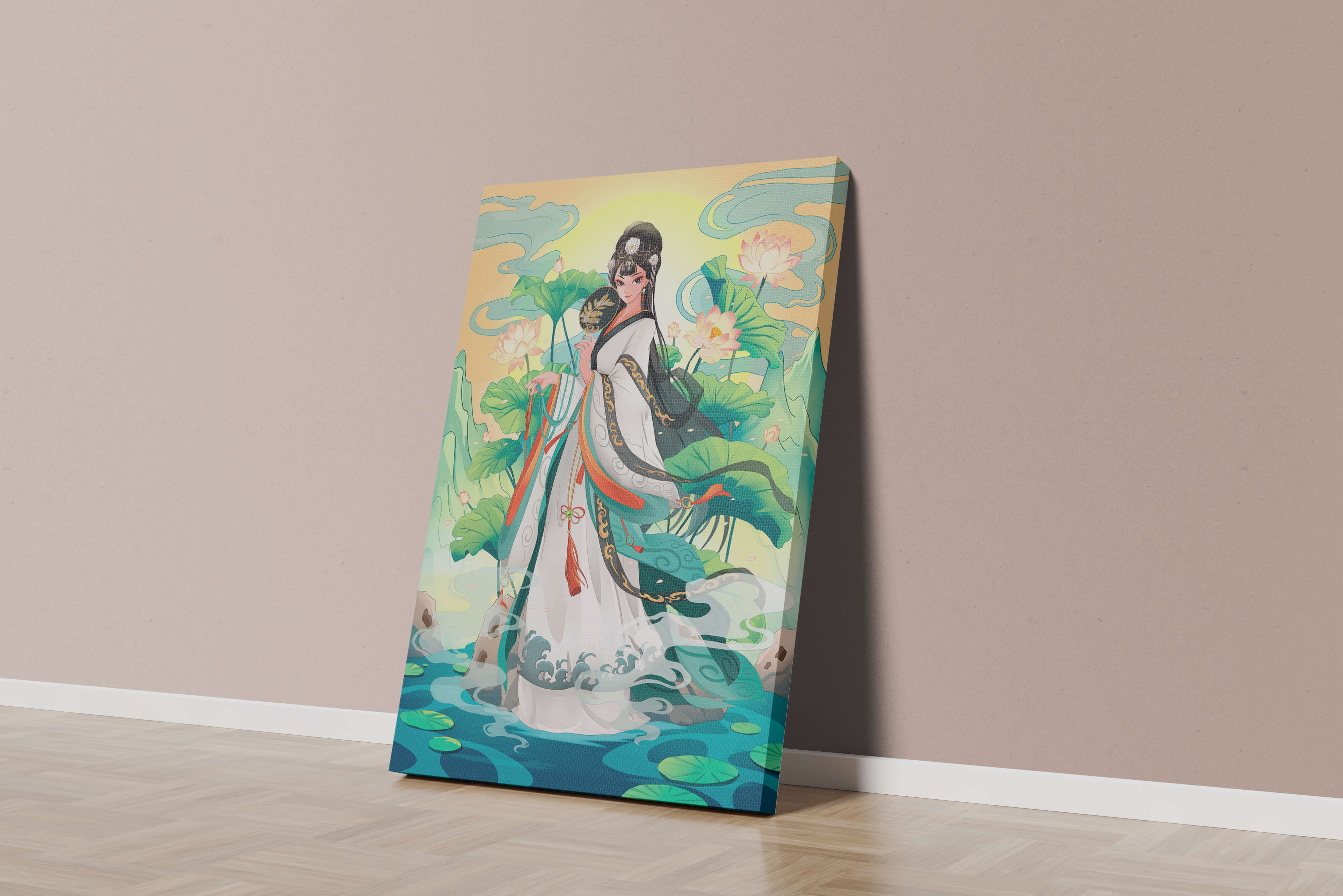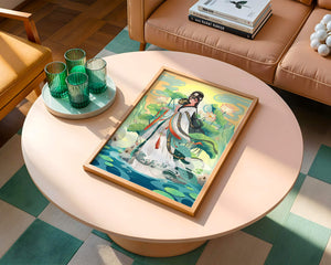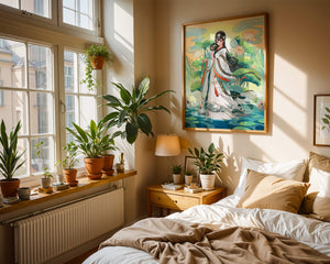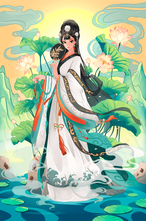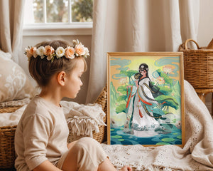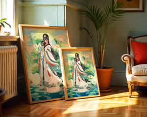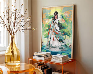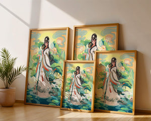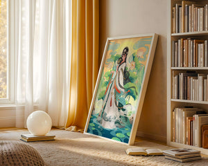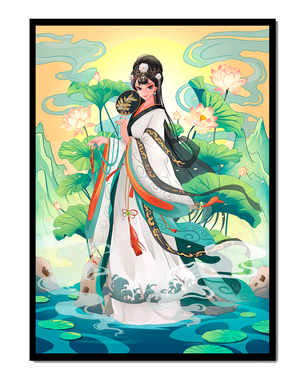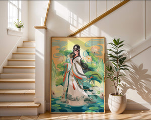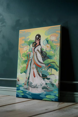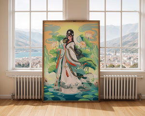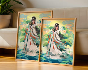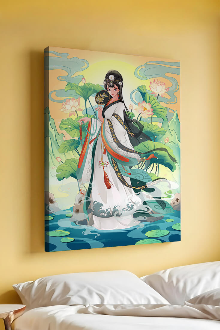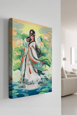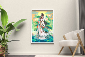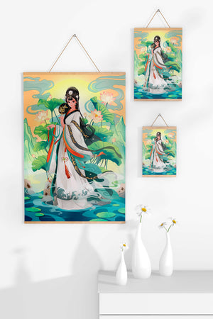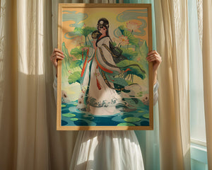 The illustration showcases a harmonious blend of cultural artistry and the tranquil essence of nature. The subject is adorned in a flowing garment adorned with intricate patterns, creating a sense of movement and grace. Her pose is poised and dignified, capturing the essence of traditional beauty.The backdrop features lush lotus flowers that add a touch of serenity, enhancing the overall aesthetic appeal. The color palette combines calming greens and soft pastels, contributing to the peaceful ambiance. This piece is perfect for those who appreciate a fusion of traditional art with a modern twist, making it suitable for various decorative settings.| Type |