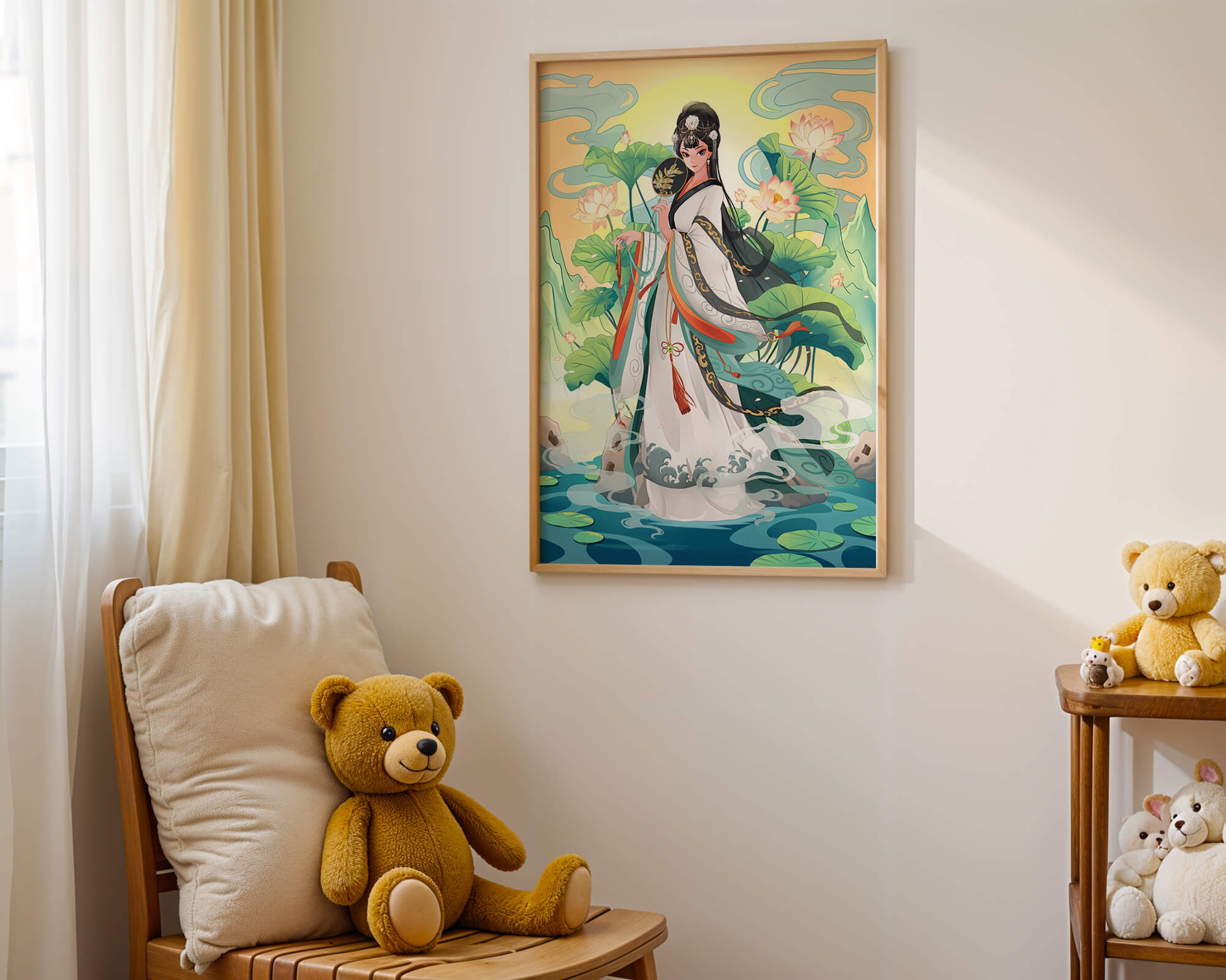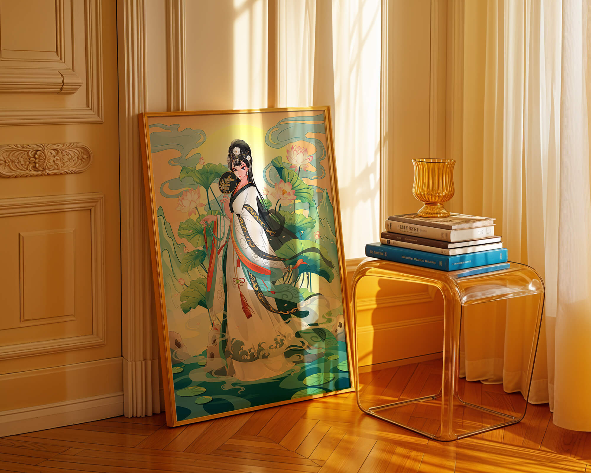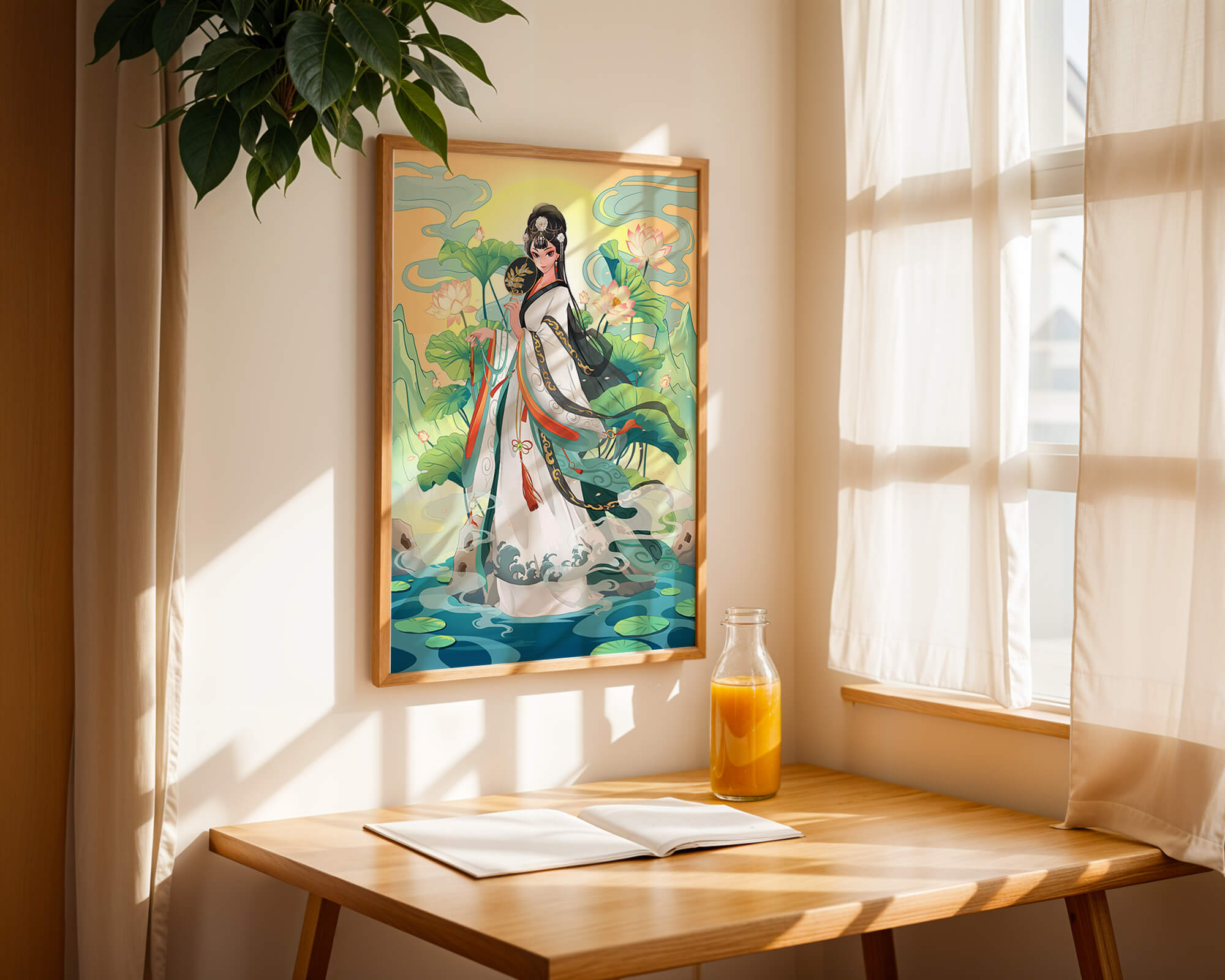 The illustration showcases a harmonious blend of cultural artistry and the tranquil essence of nature. The subject is adorned in a flowing garment adorned with intricate patterns, creating a sense of movement and grace. Her pose is poised and dignified, capturing the essence of traditional beauty.The backdrop features lush lotus flowers that add a touch of serenity, enhancing the overall aesthetic appeal. The color palette combines calming greens and soft pastels, contributing to the peaceful ambiance. This piece is perfect for those who appreciate a fusion of traditional art with a modern twist, making it suitable for various decorative settings.| Type |