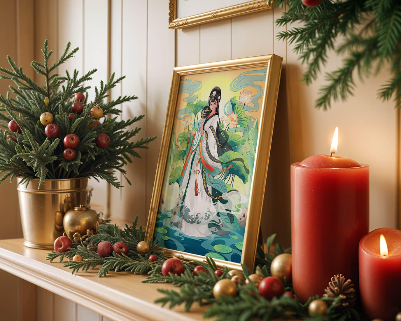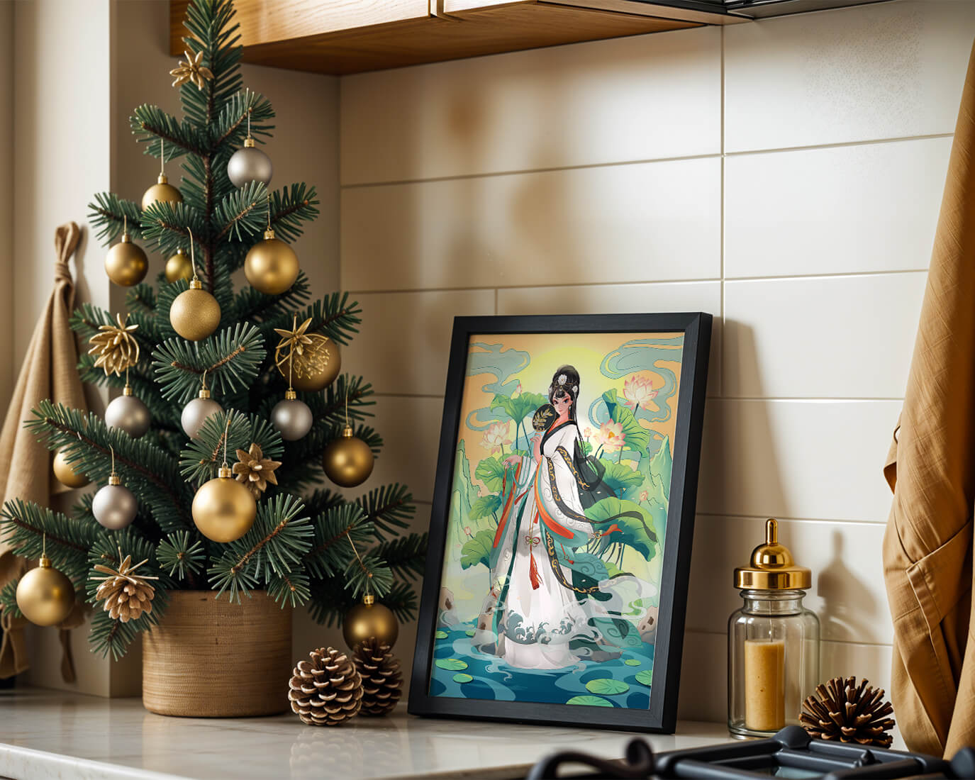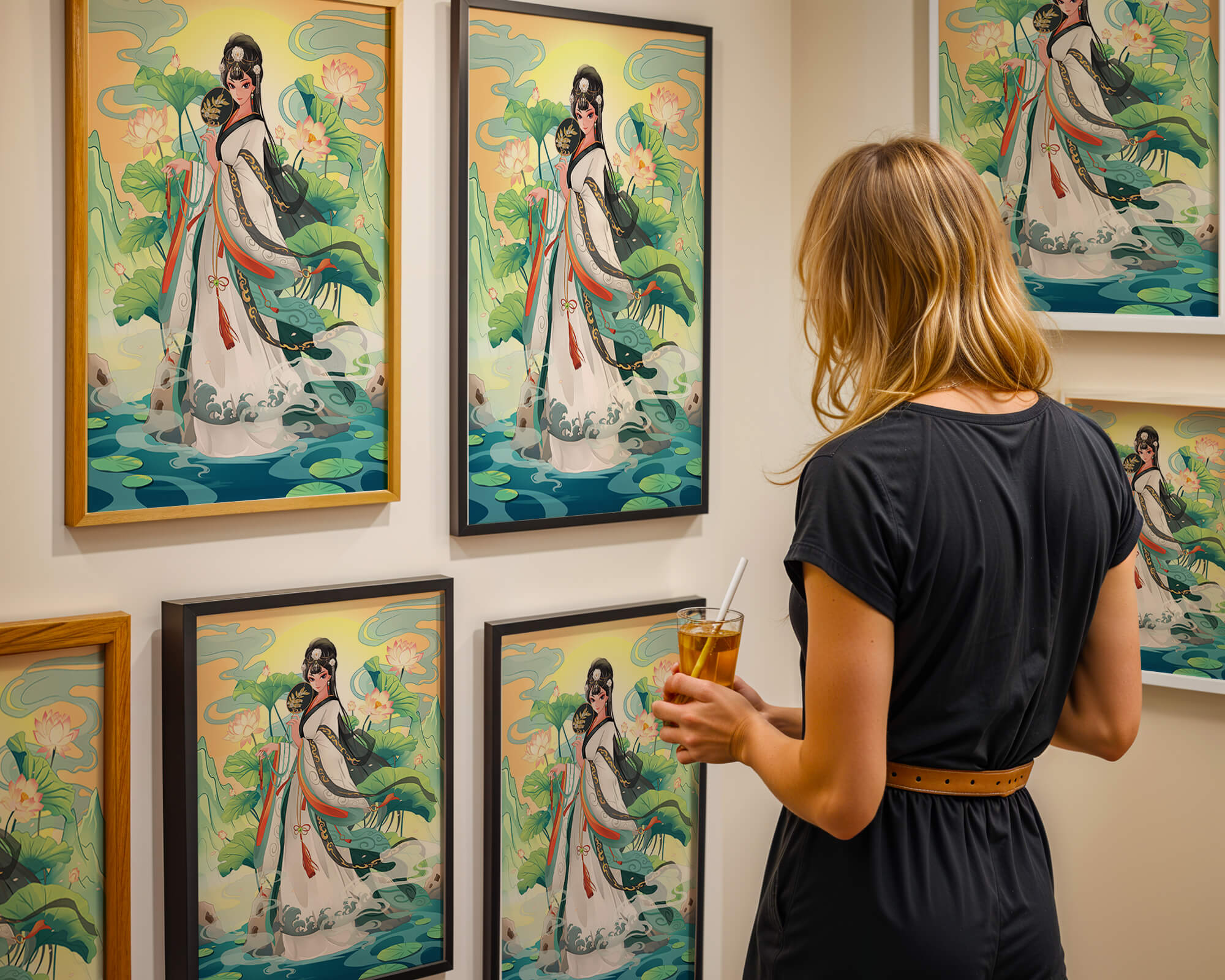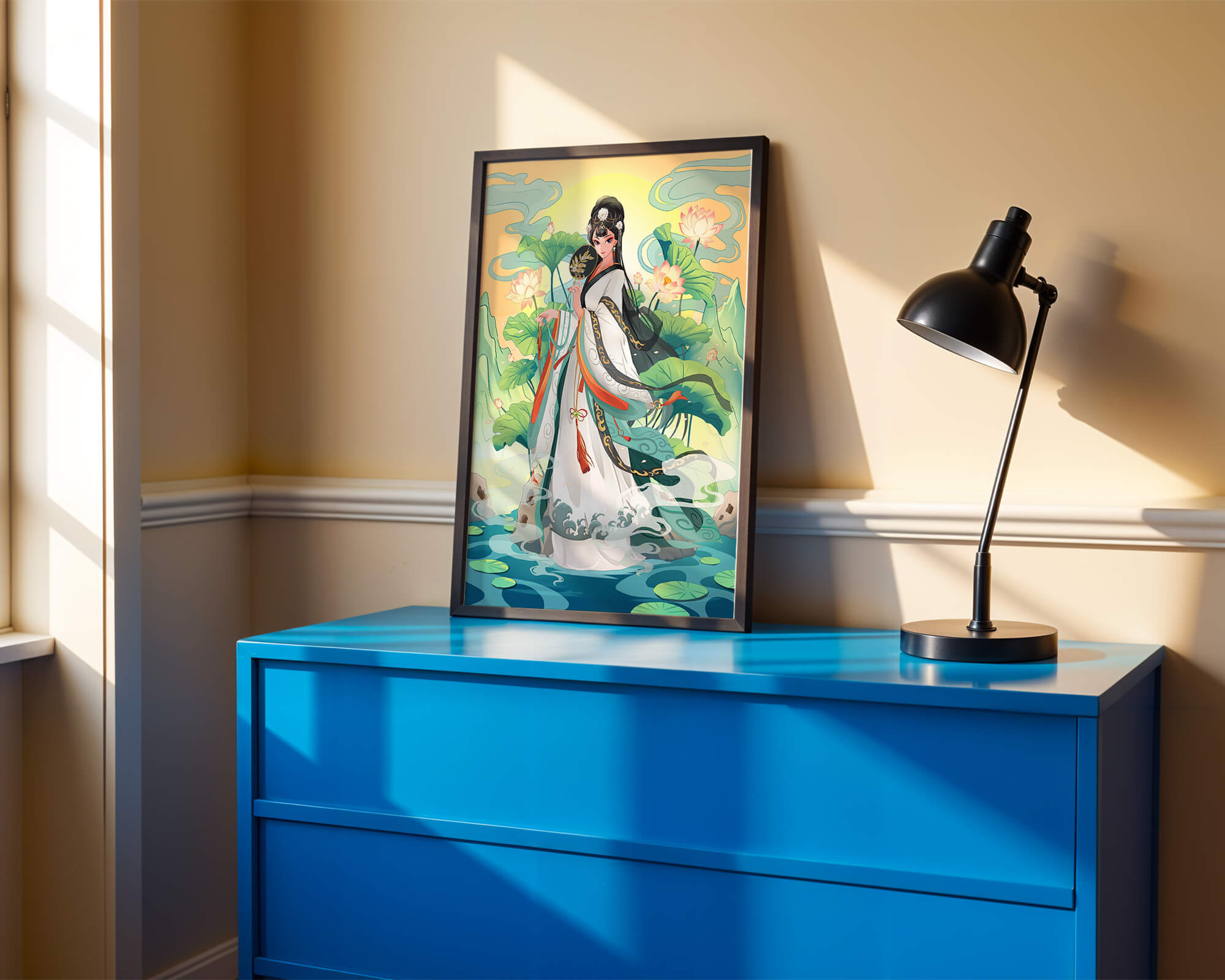 The illustration showcases a harmonious blend of cultural artistry and the tranquil essence of nature. The subject is adorned in a flowing garment adorned with intricate patterns, creating a sense of movement and grace. Her pose is poised and dignified, capturing the essence of traditional beauty.The backdrop features lush lotus flowers that add a touch of serenity, enhancing the overall aesthetic appeal. The color palette combines calming greens and soft pastels, contributing to the peaceful ambiance. This piece is perfect for those who appreciate a fusion of traditional art with a modern twist, making it suitable for various decorative settings.| Type |