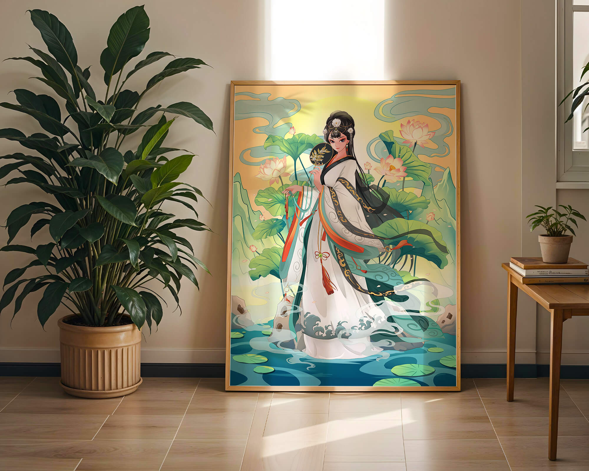This enchanting image captures the elegance of a woman in traditional attire, surrounded by a serene backdrop filled with lotus flowers and natural beauty. The artwork is rich in details, with the woman holding a delicate fan as she stands gracefully among vibrant greens and soft pinks.