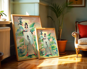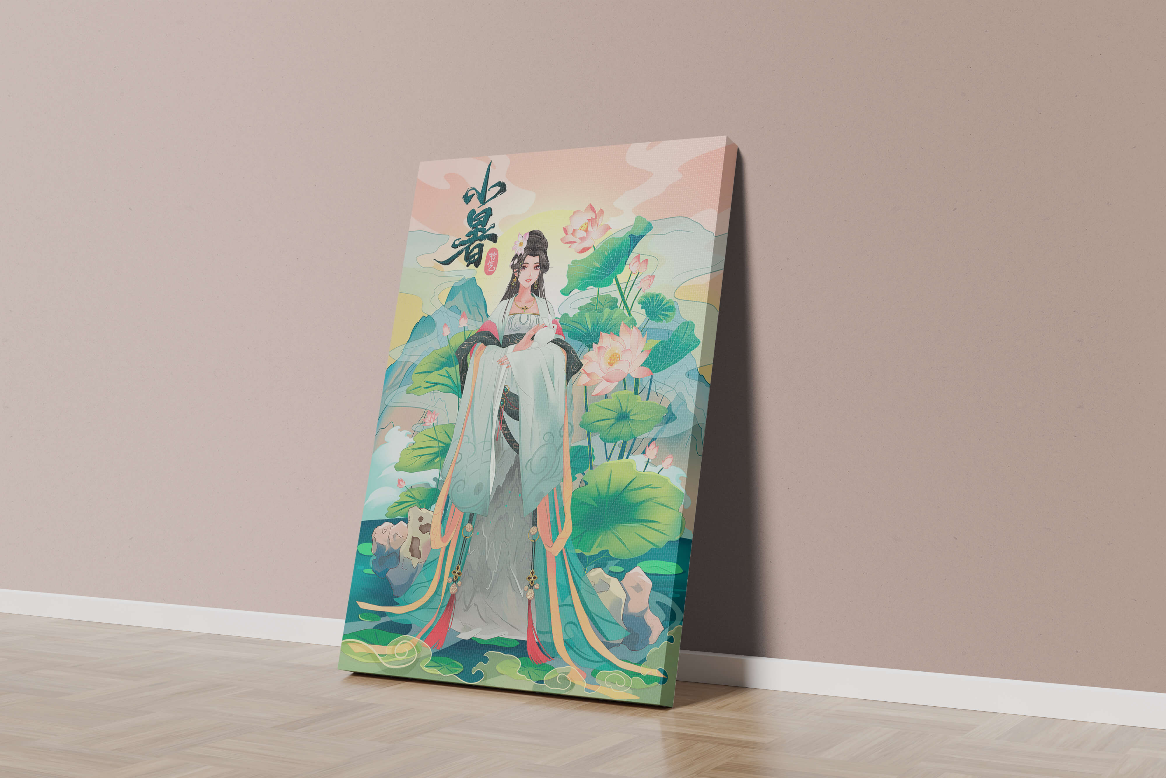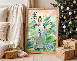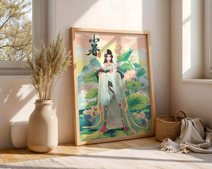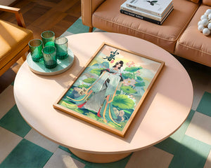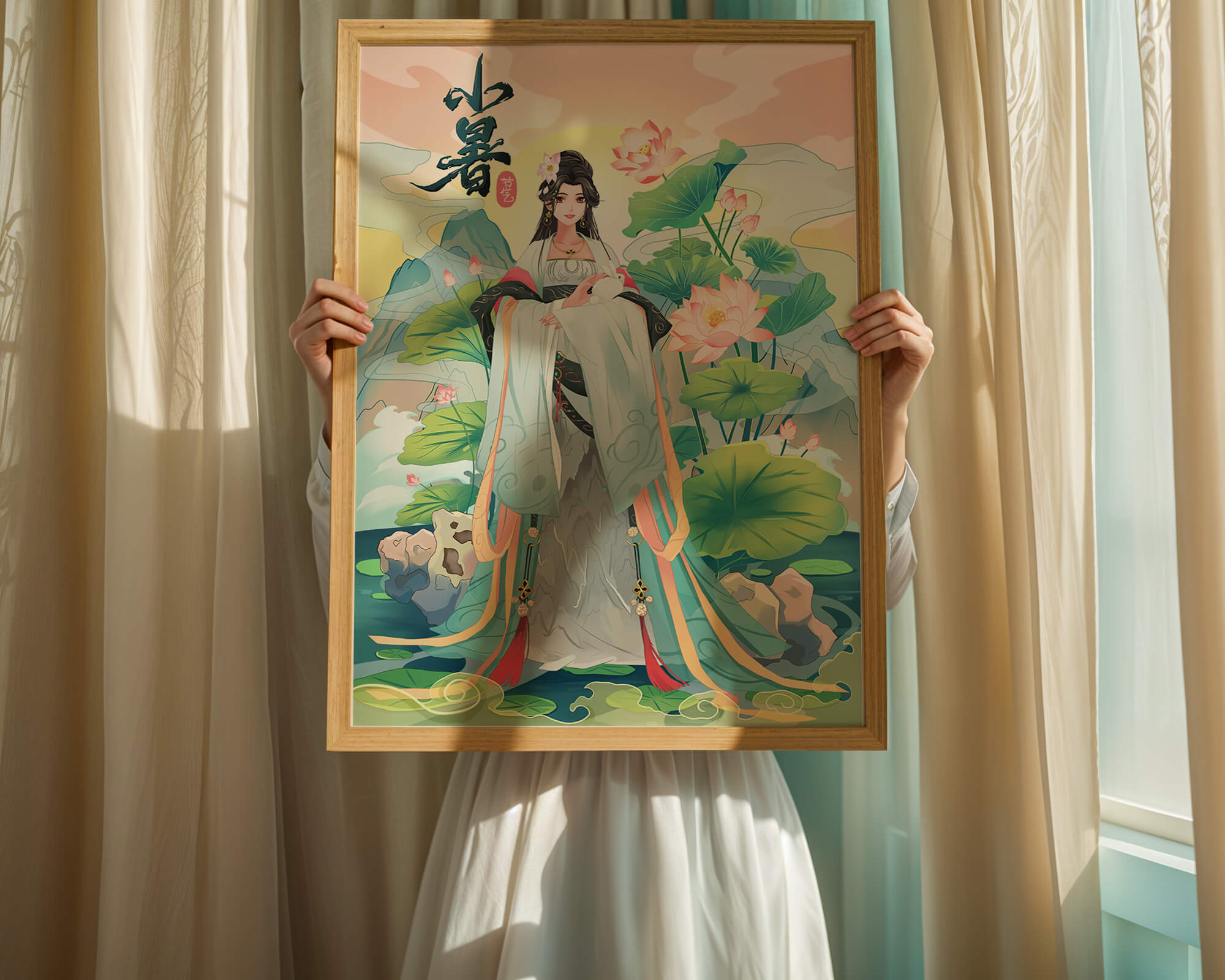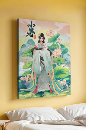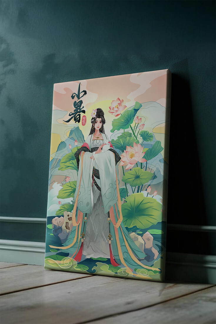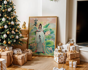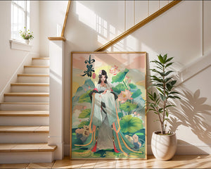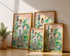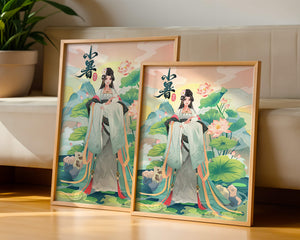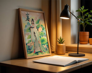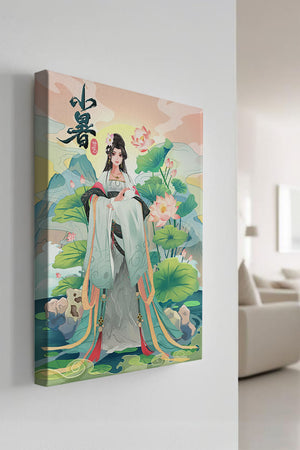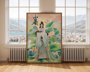 This captivating image showcases an elegant woman dressed in flowing traditional garments, exuding beauty and grace. Her attire is adorned with intricate patterns and subtle hues, enhancing her serene demeanor as she stands poised amidst a field of lotus flowers. The background features majestic mountains and a calm sky, adding depth and a sense of tranquility to the scene. The lotus flowers, known for their symbolism of purity and enlightenment, complement the overall composition, creating a harmonious blend of nature and art. This image evokes a sense of peace and cultural richness, perfect for enhancing any living space with its timeless beauty.| Type |