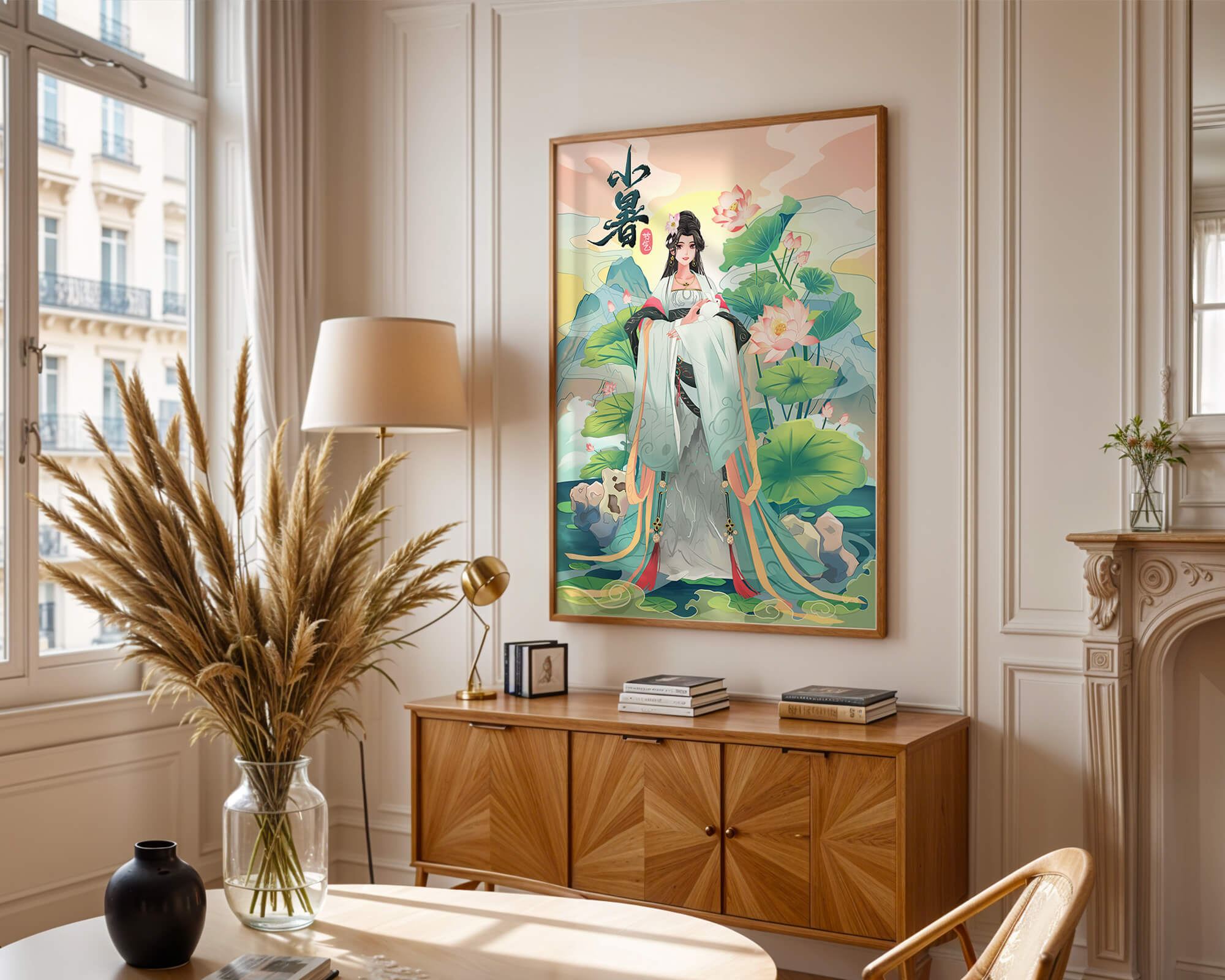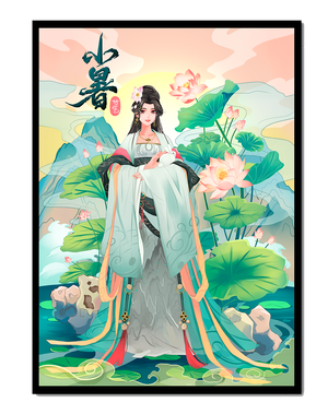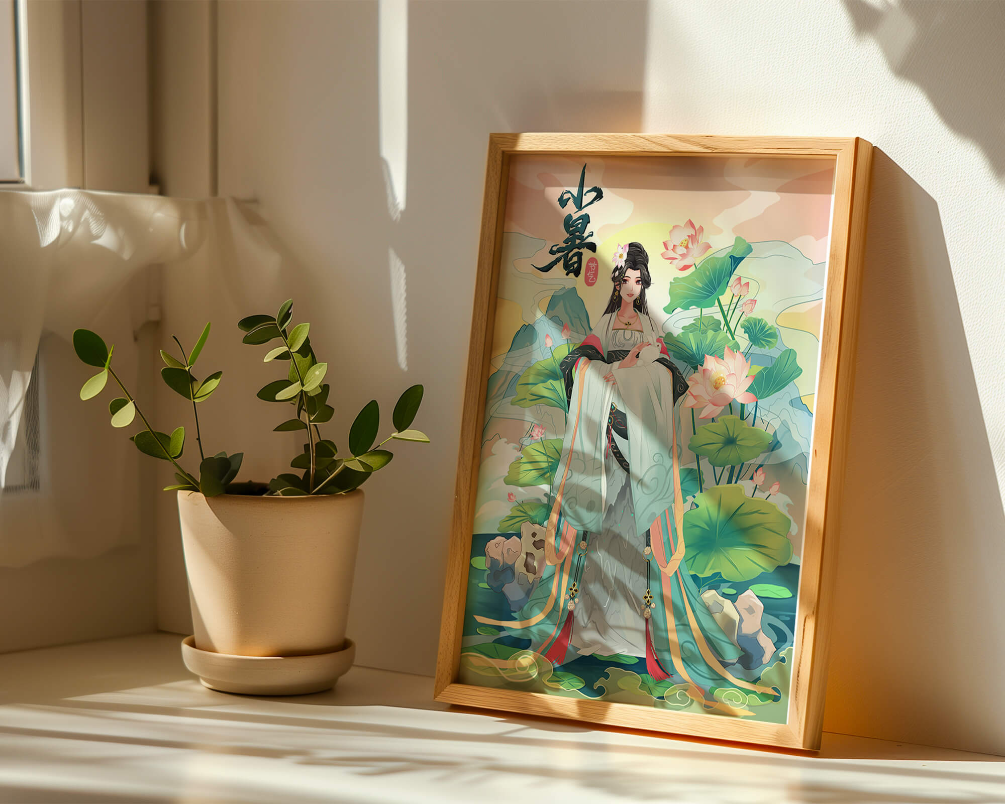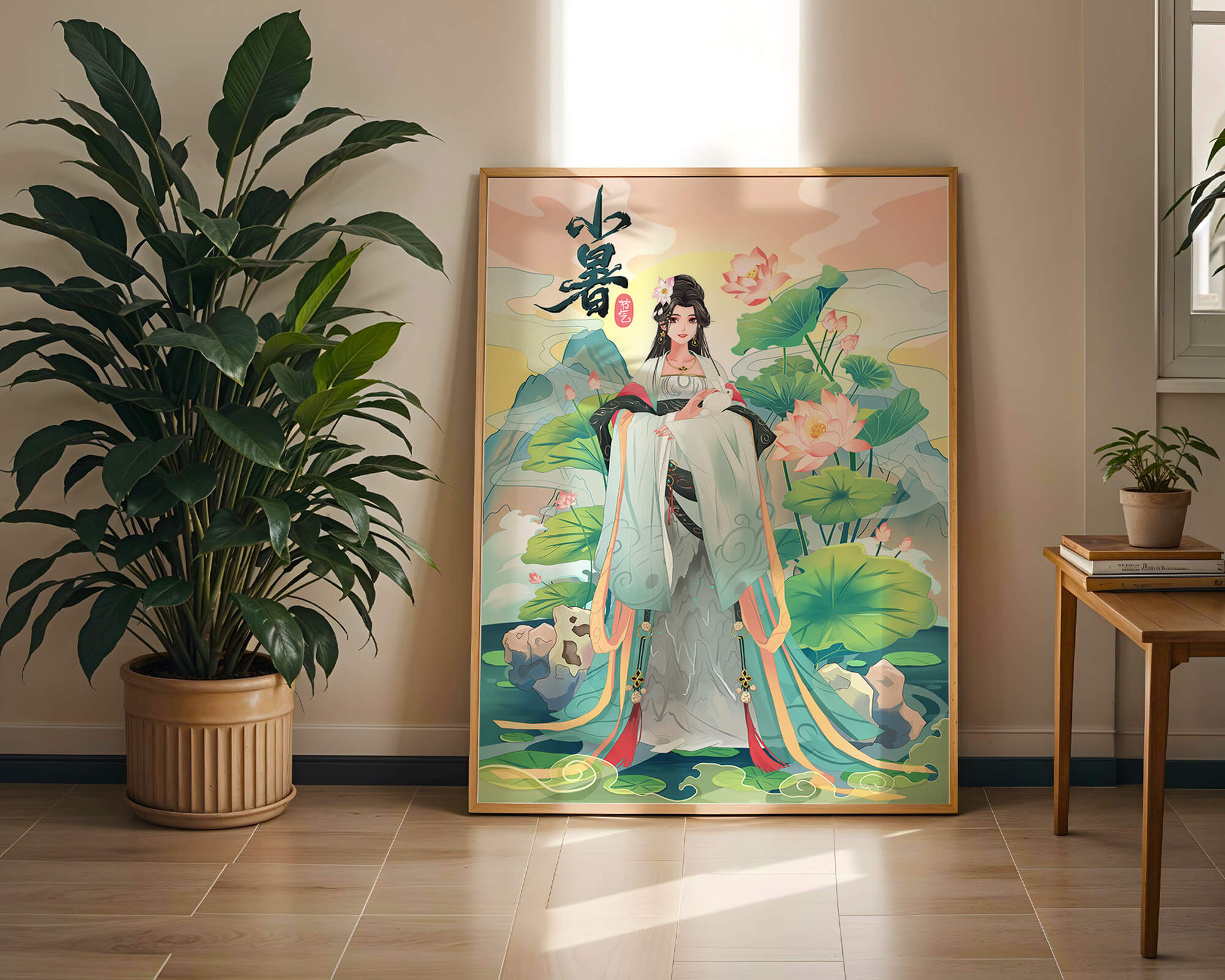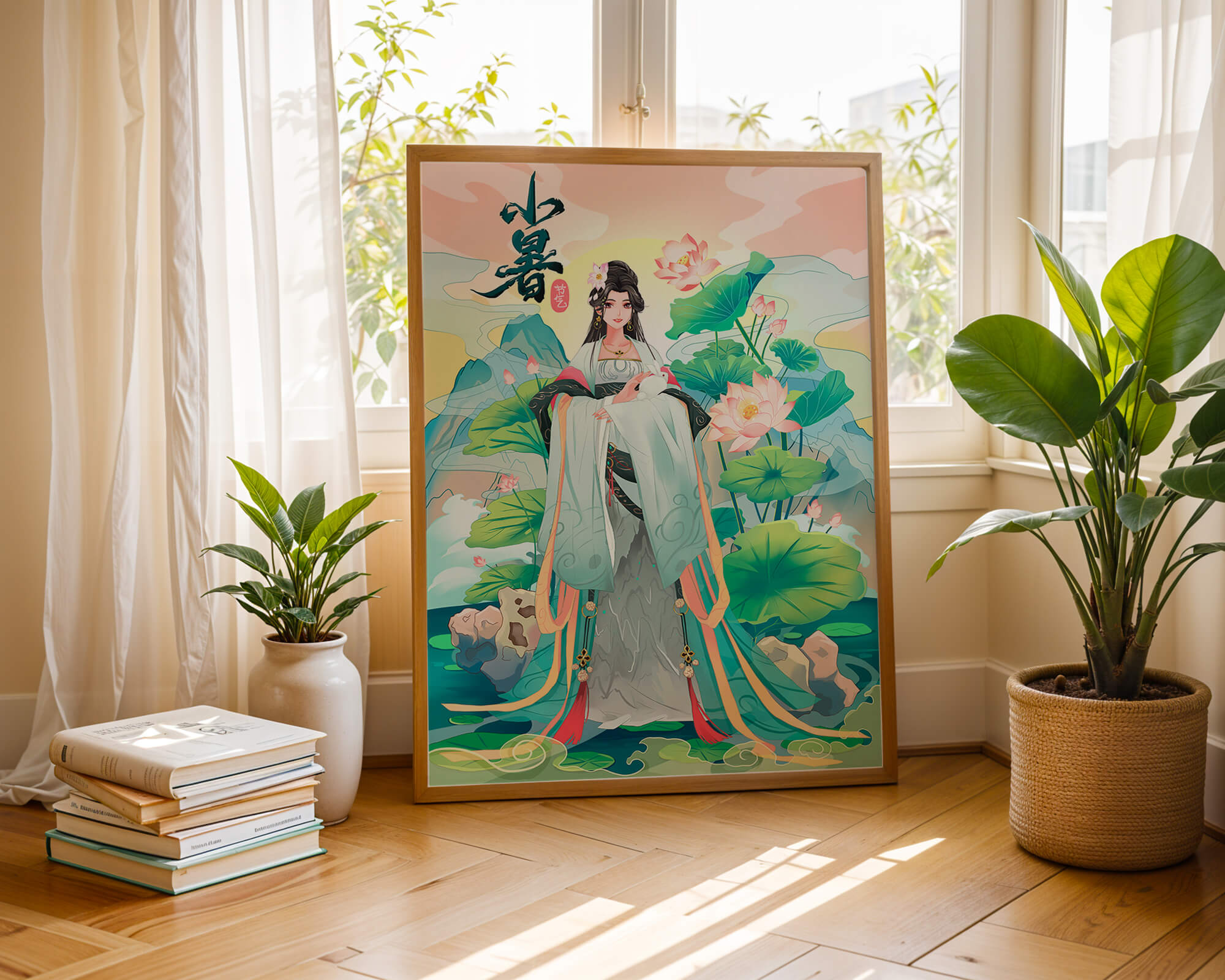 This captivating image showcases an elegant woman dressed in flowing traditional garments, exuding beauty and grace. Her attire is adorned with intricate patterns and subtle hues, enhancing her serene demeanor as she stands poised amidst a field of lotus flowers. The background features majestic mountains and a calm sky, adding depth and a sense of tranquility to the scene. The lotus flowers, known for their symbolism of purity and enlightenment, complement the overall composition, creating a harmonious blend of nature and art. This image evokes a sense of peace and cultural richness, perfect for enhancing any living space with its timeless beauty.| Type |