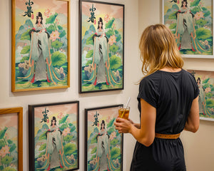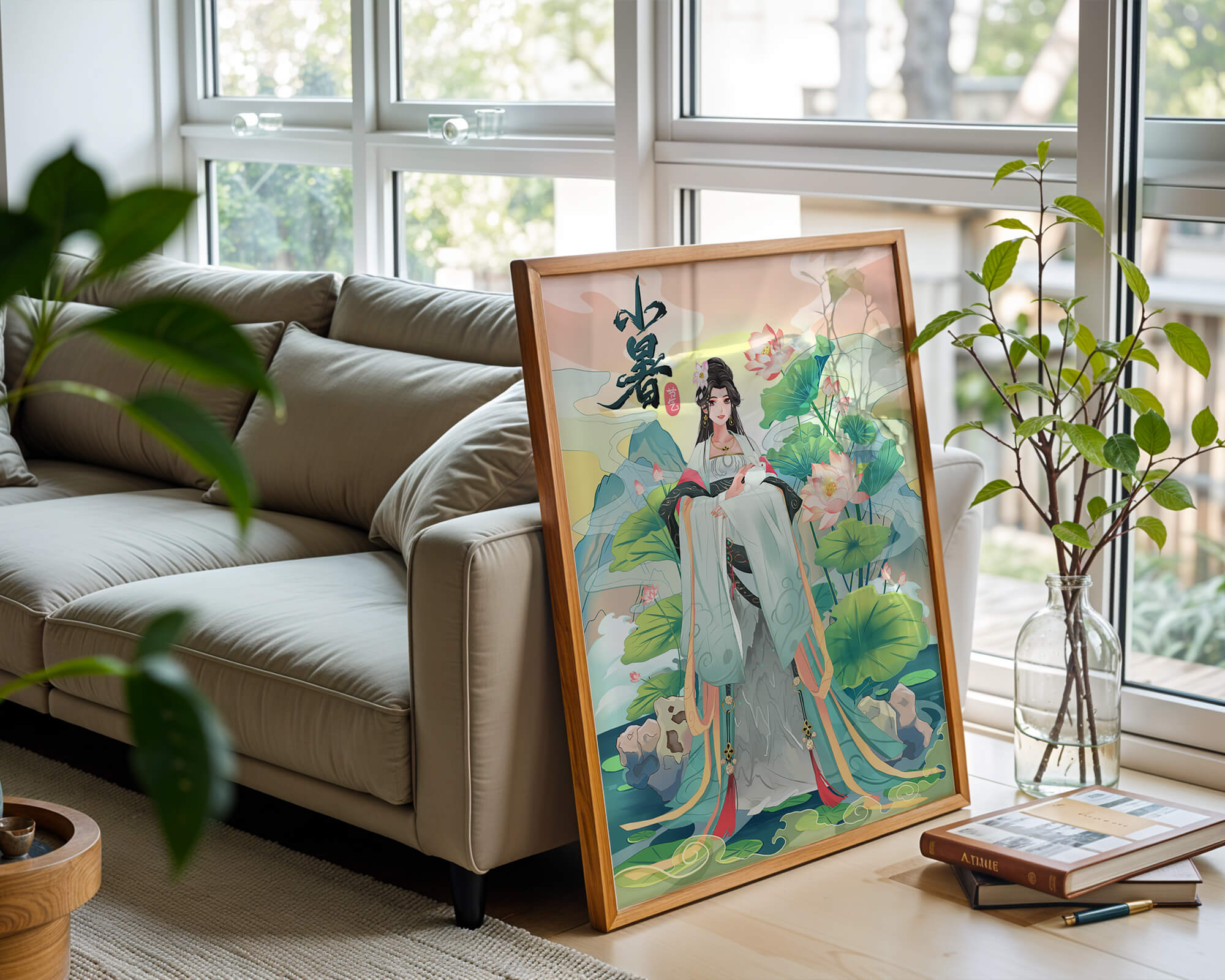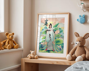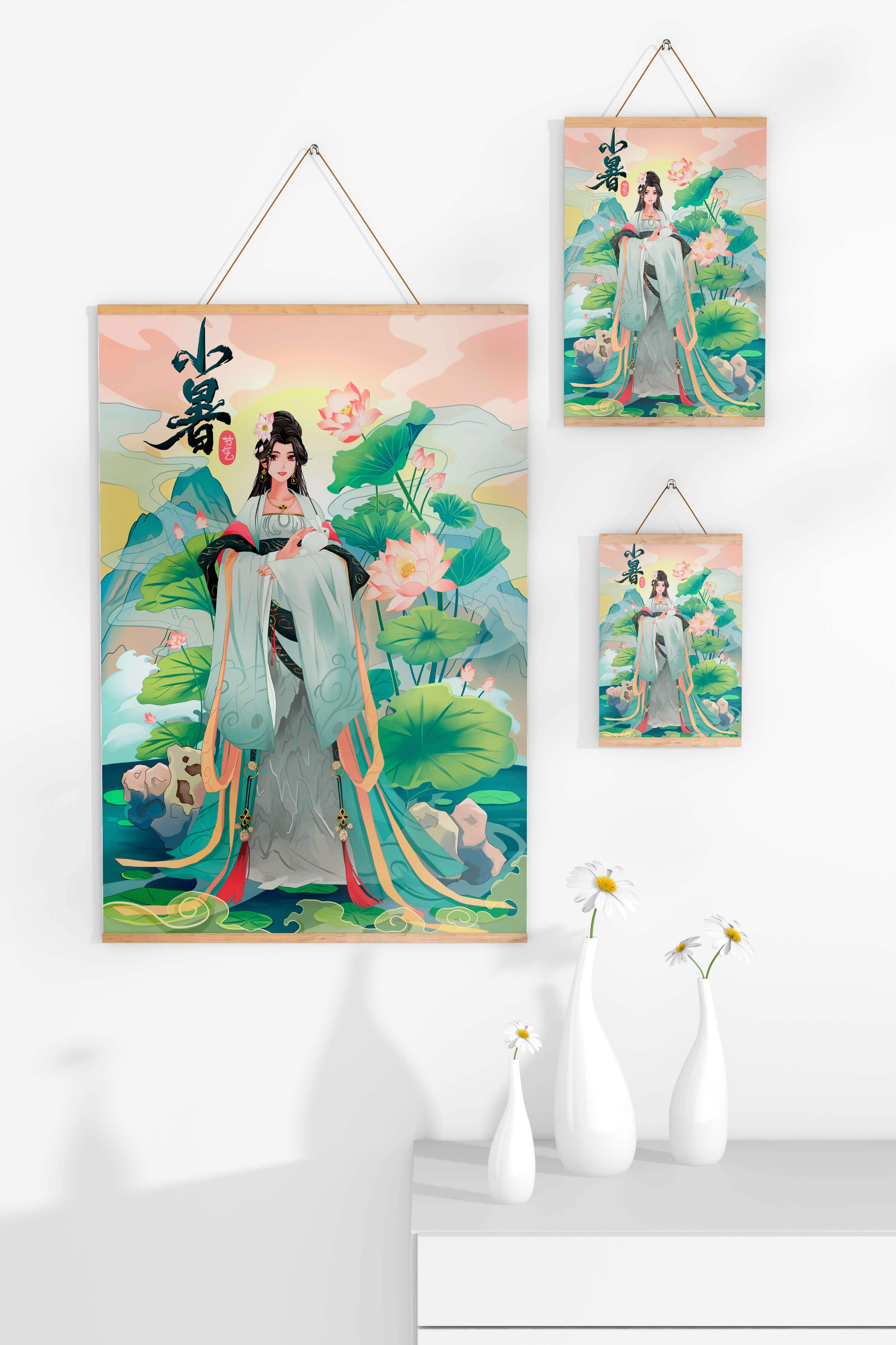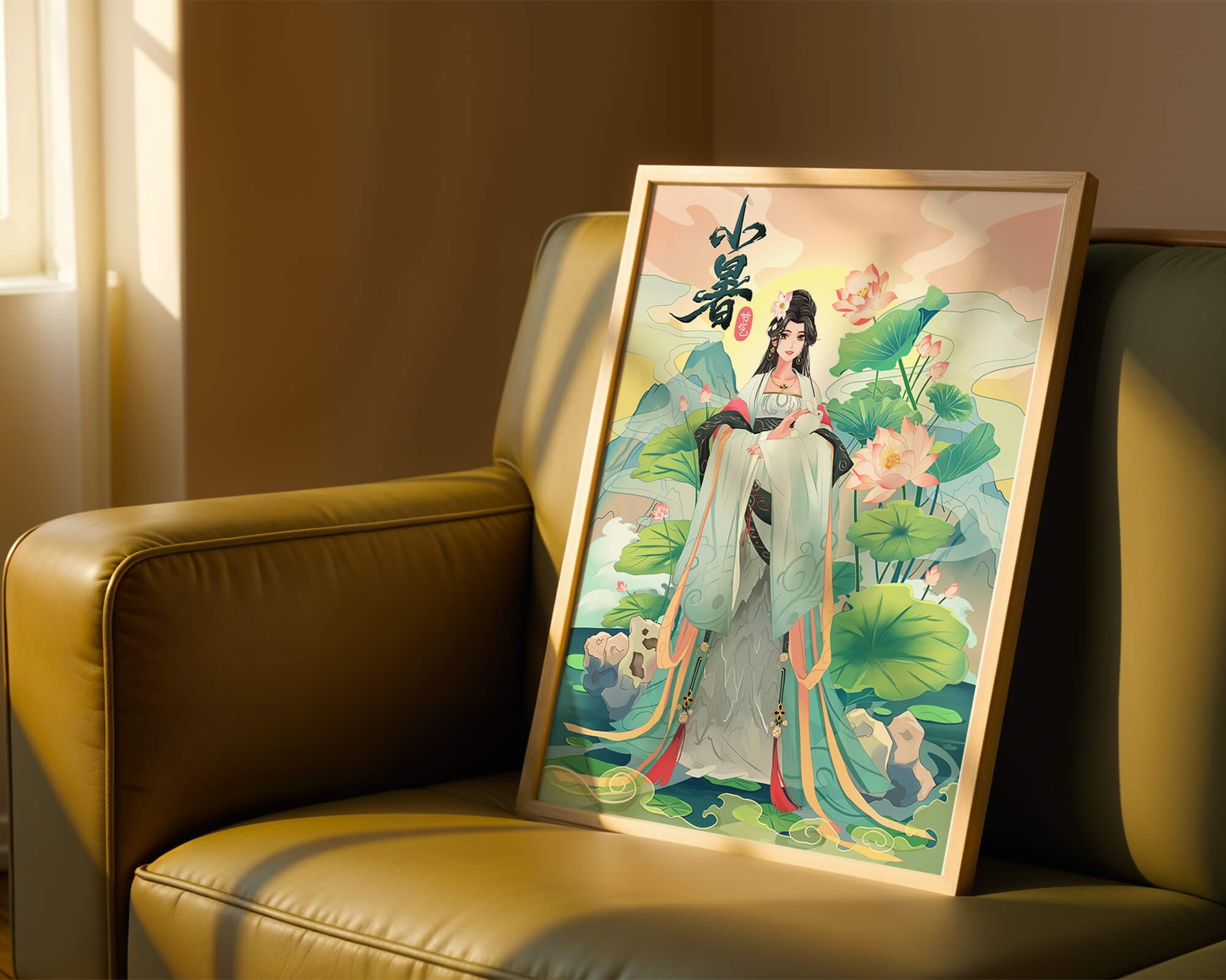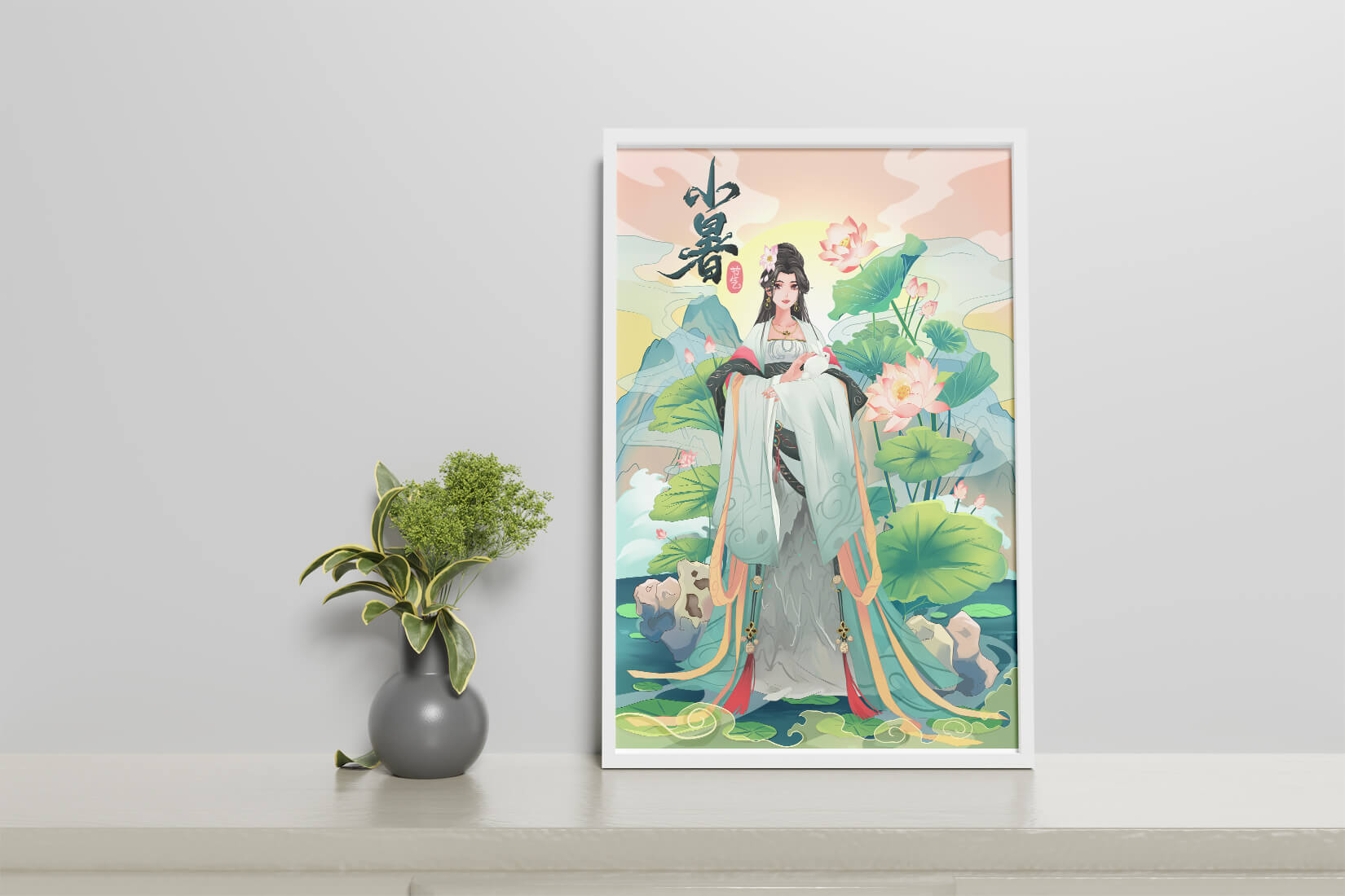 This captivating image showcases an elegant woman dressed in flowing traditional garments, exuding beauty and grace. Her attire is adorned with intricate patterns and subtle hues, enhancing her serene demeanor as she stands poised amidst a field of lotus flowers. The background features majestic mountains and a calm sky, adding depth and a sense of tranquility to the scene. The lotus flowers, known for their symbolism of purity and enlightenment, complement the overall composition, creating a harmonious blend of nature and art. This image evokes a sense of peace and cultural richness, perfect for enhancing any living space with its timeless beauty.| Type |