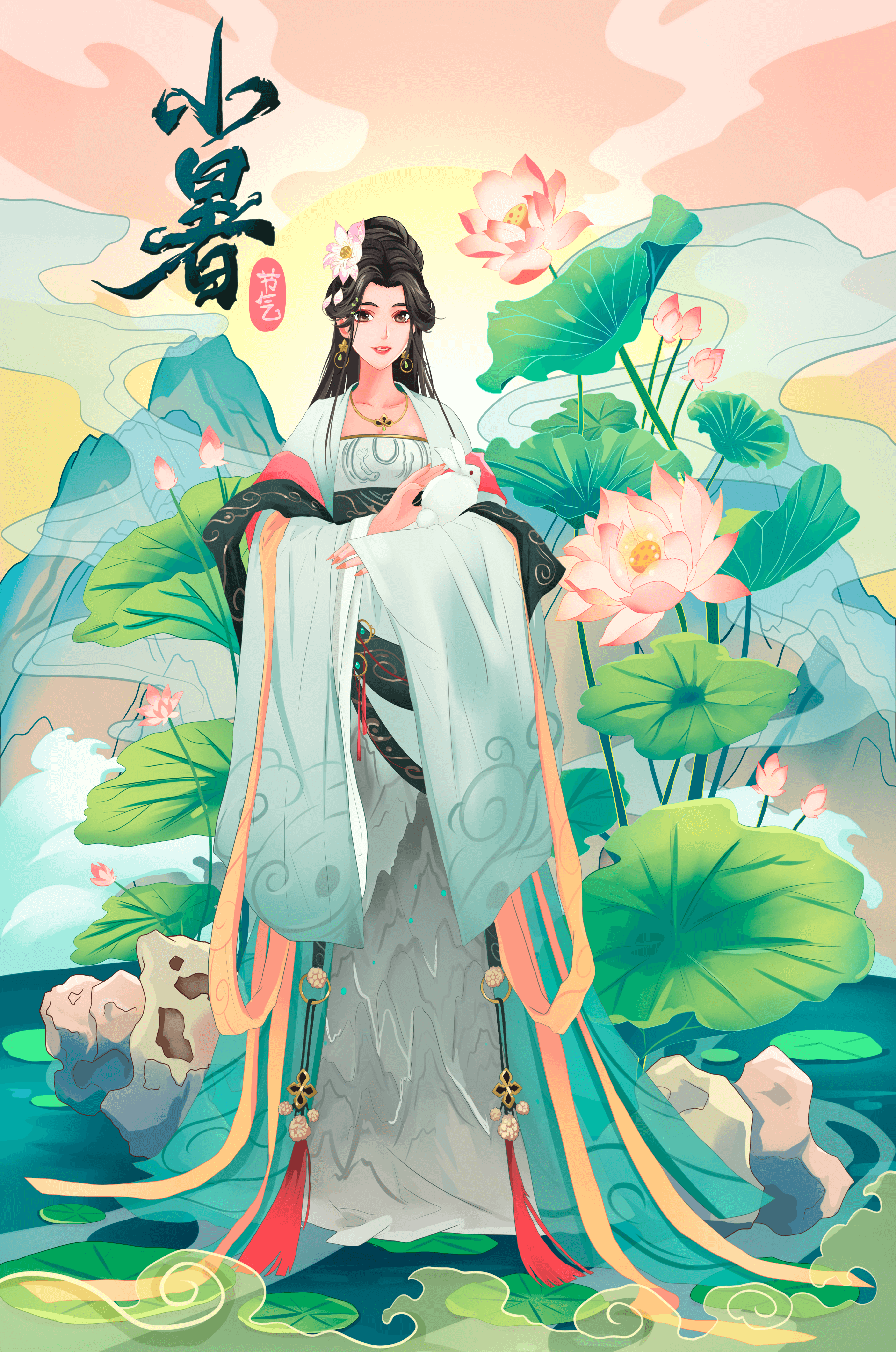 A graceful depiction of a woman in traditional attire amidst a tranquil landscape, surrounded by lotus flowers and serene mountains. The soft pastel colors create a calm and ethereal atmosphere.