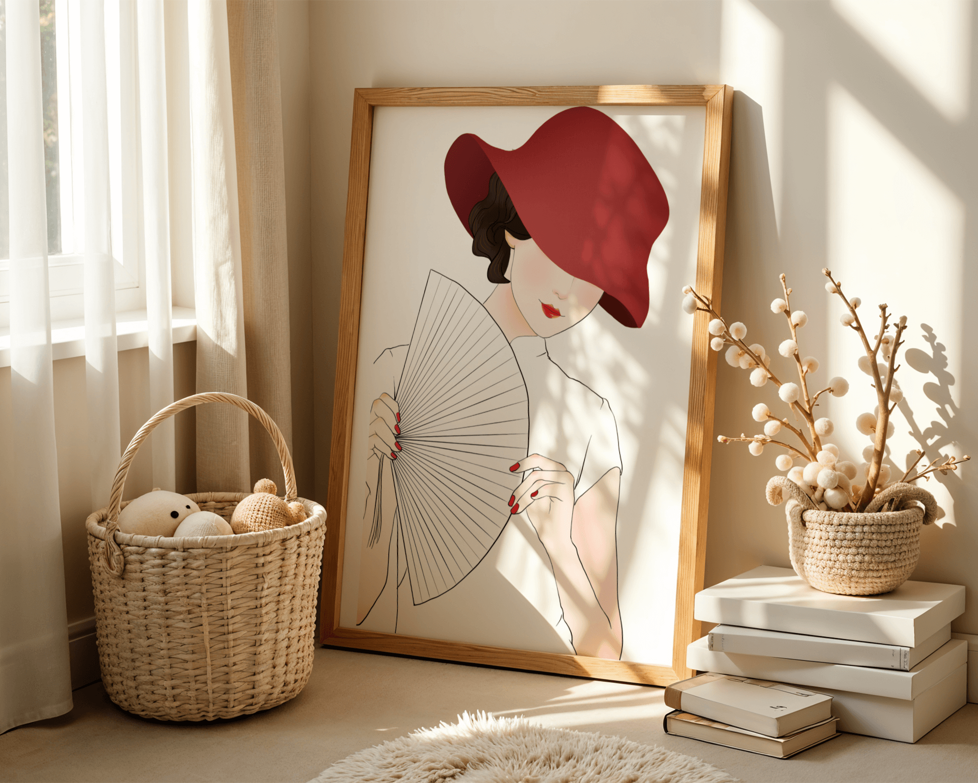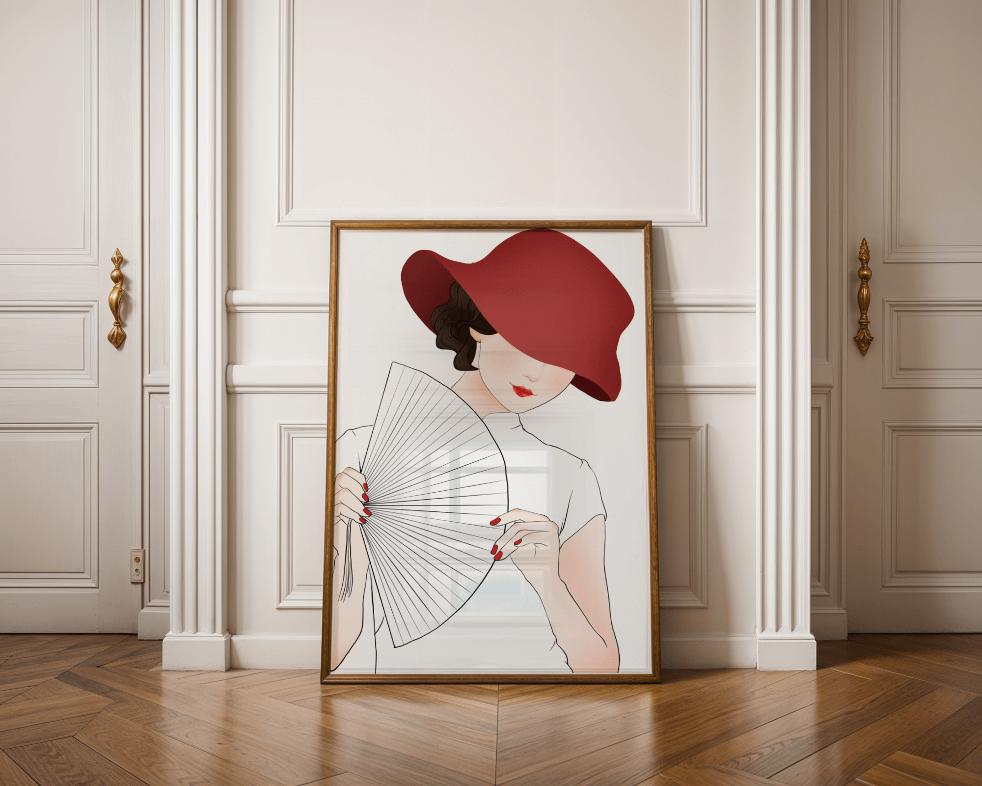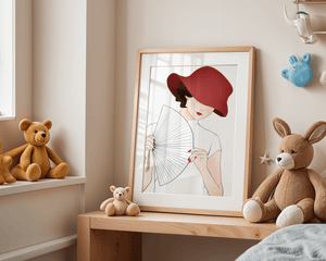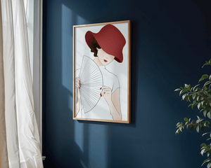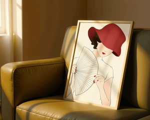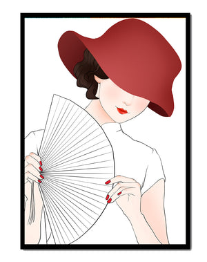 A refined and elegant illustration featuring a mysterious woman wearing a bold red hat and holding a delicate fan. The minimalist style and soft color palette emphasize her timeless beauty and sophistication.