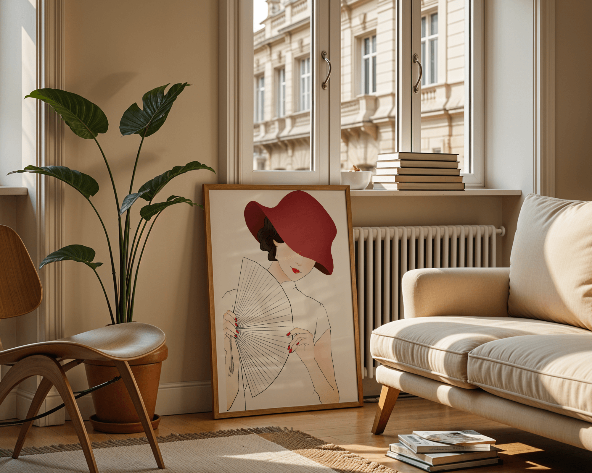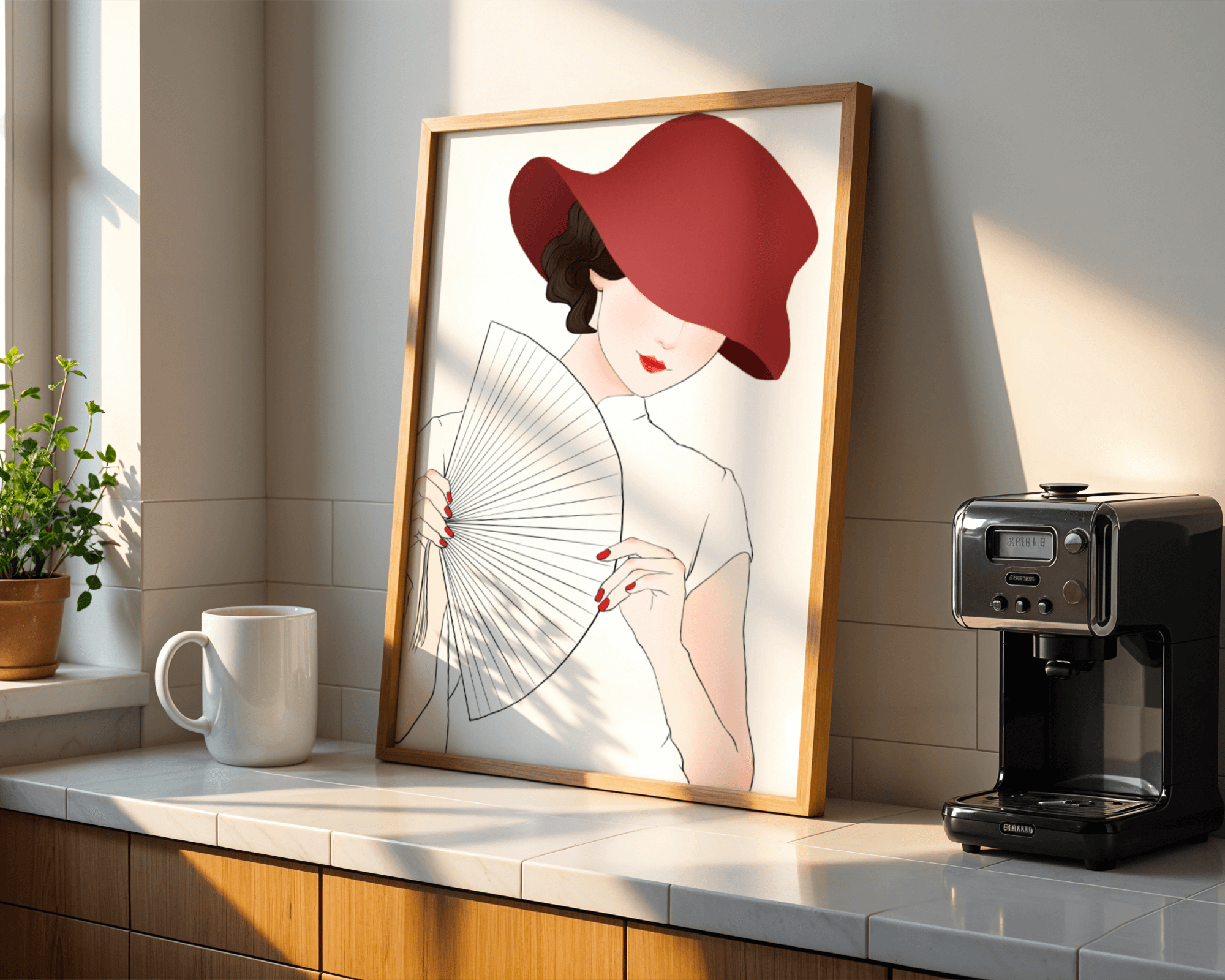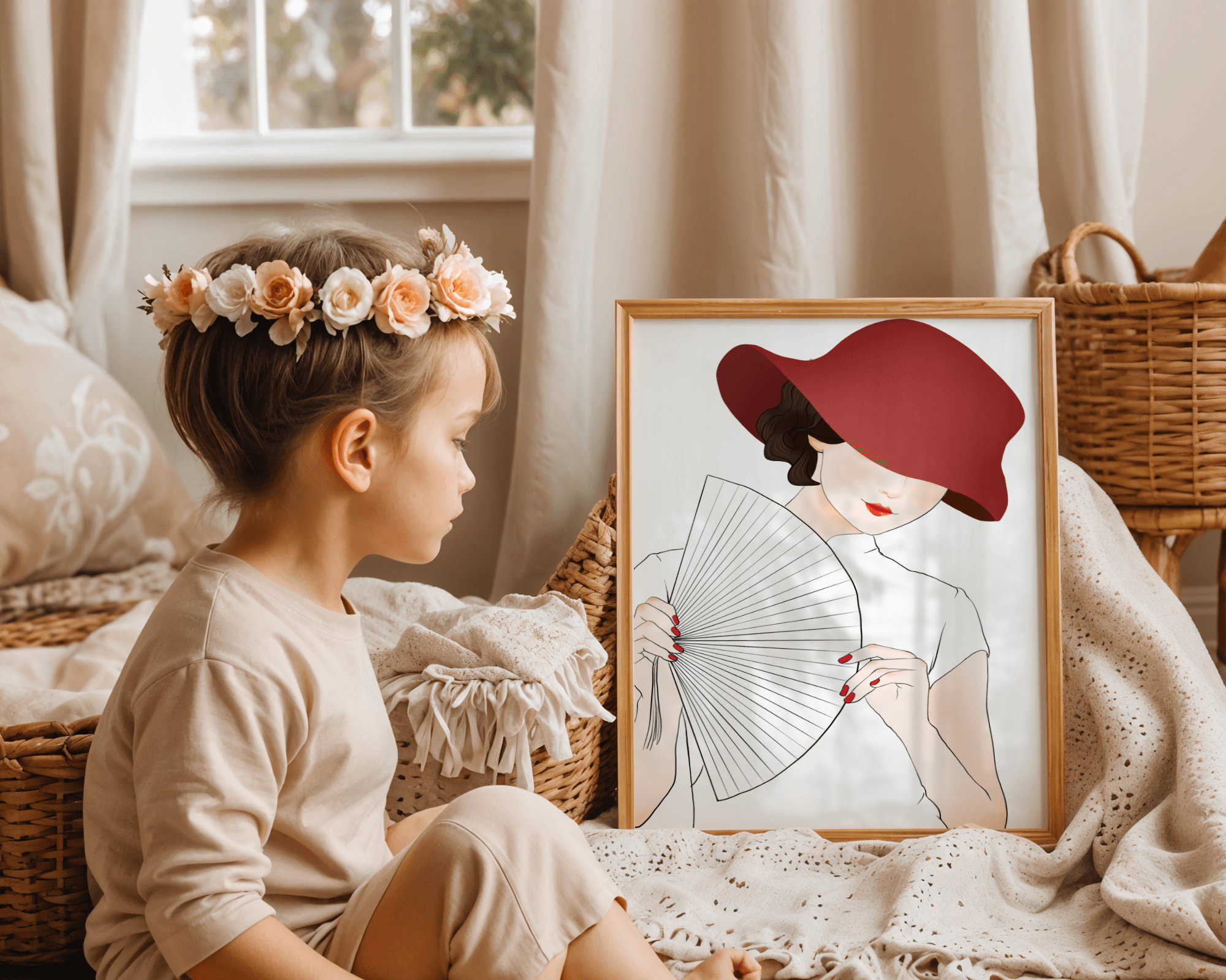 A refined and elegant illustration featuring a mysterious woman wearing a bold red hat and holding a delicate fan. The minimalist style and soft color palette emphasize her timeless beauty and sophistication.