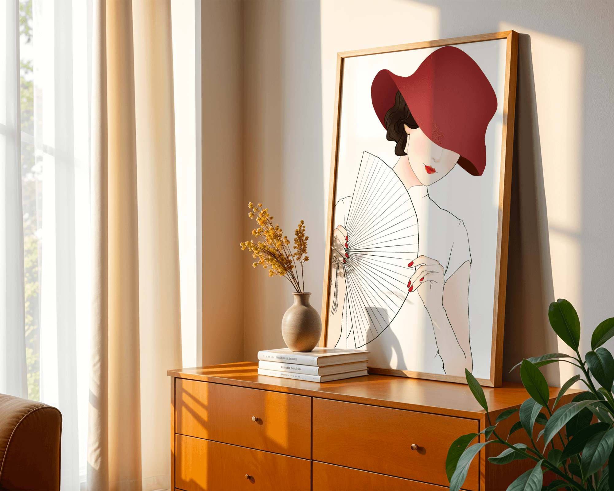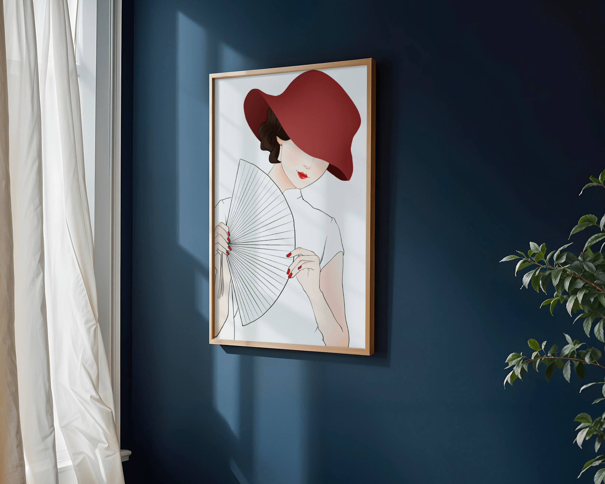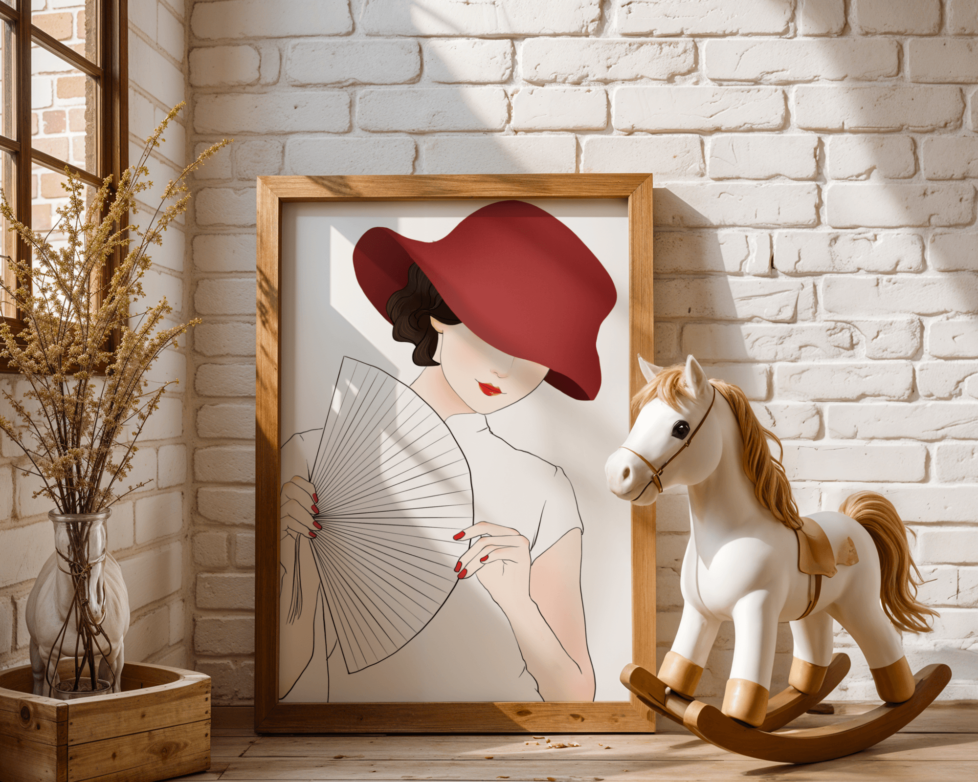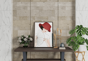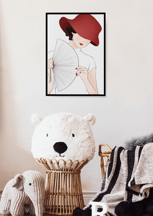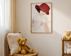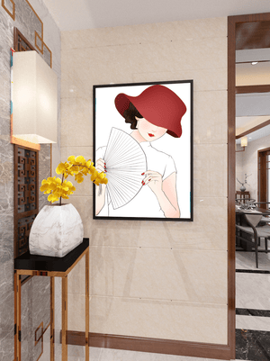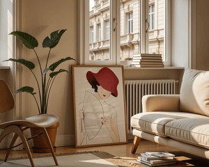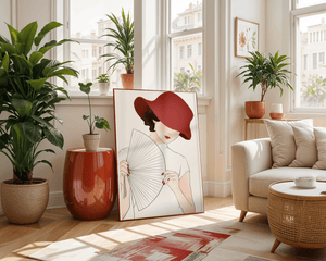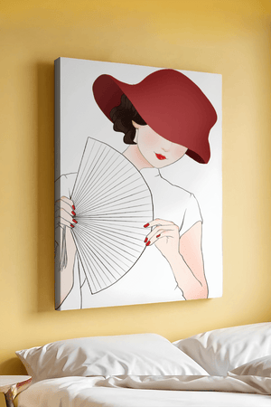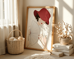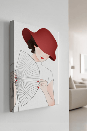 This artwork captures the essence of feminine elegance and mystery, making it a perfect addition to fashion-inspired interiors. The contrast of the deep red hat against the soft background adds a striking yet harmonious balance to the composition.