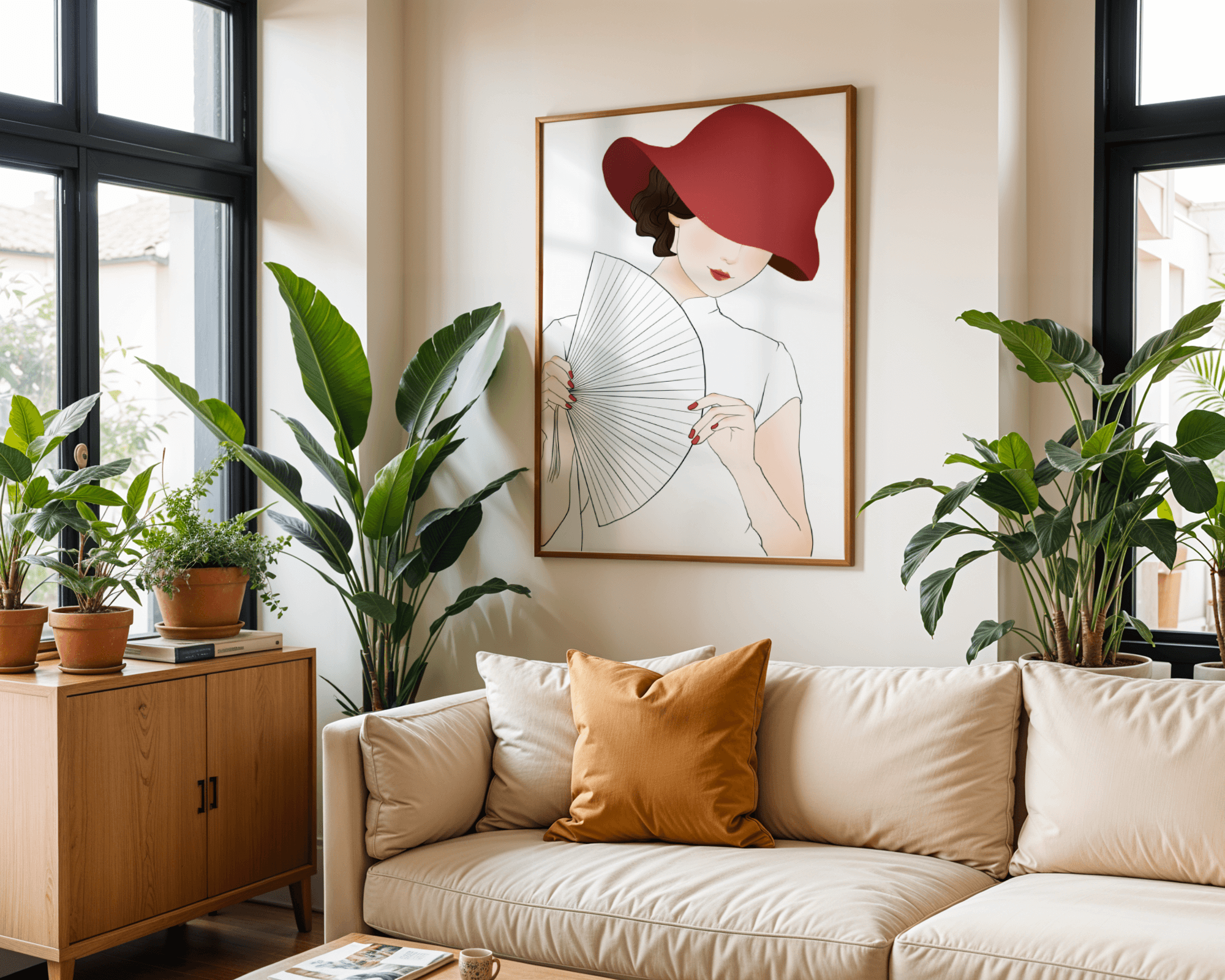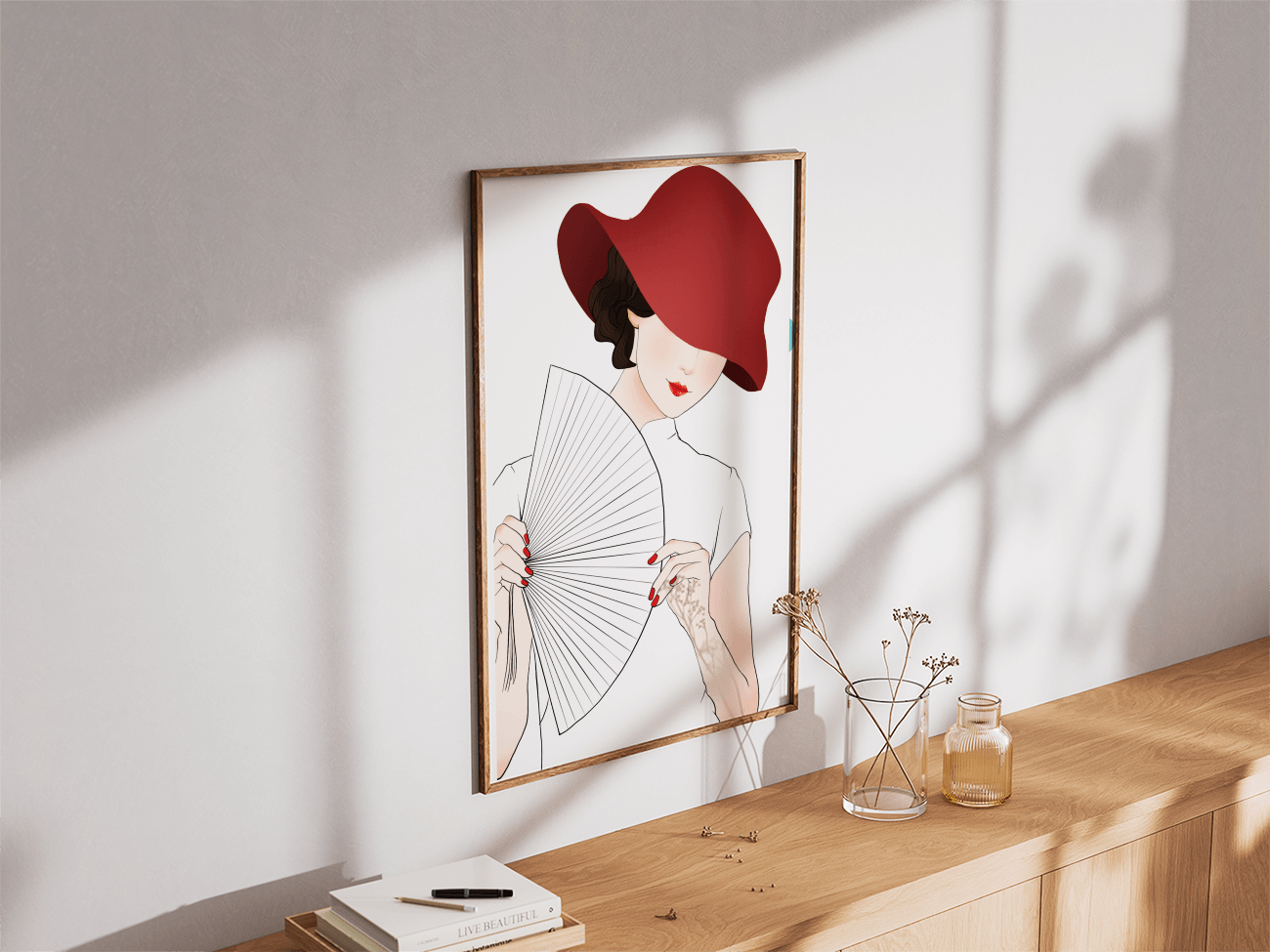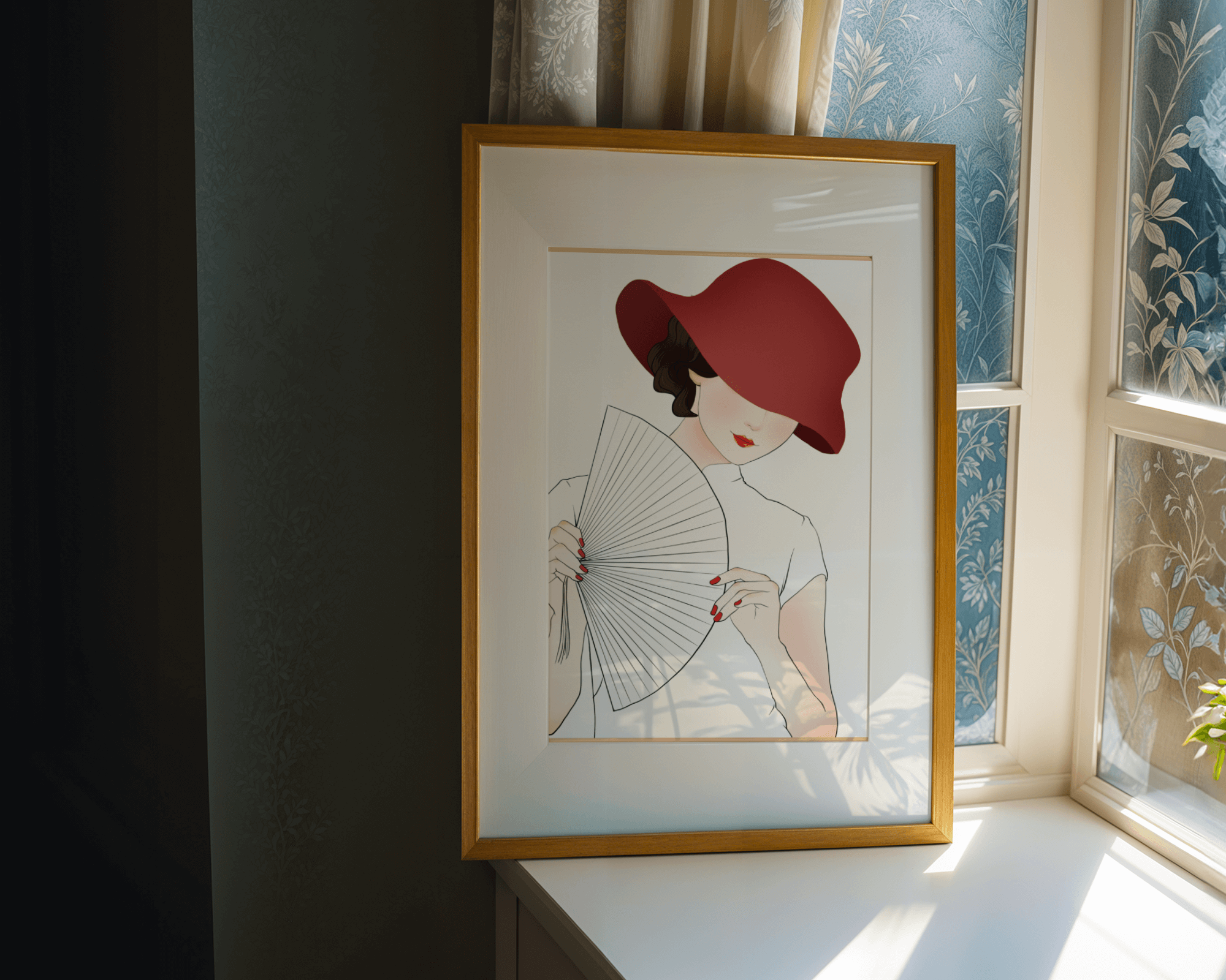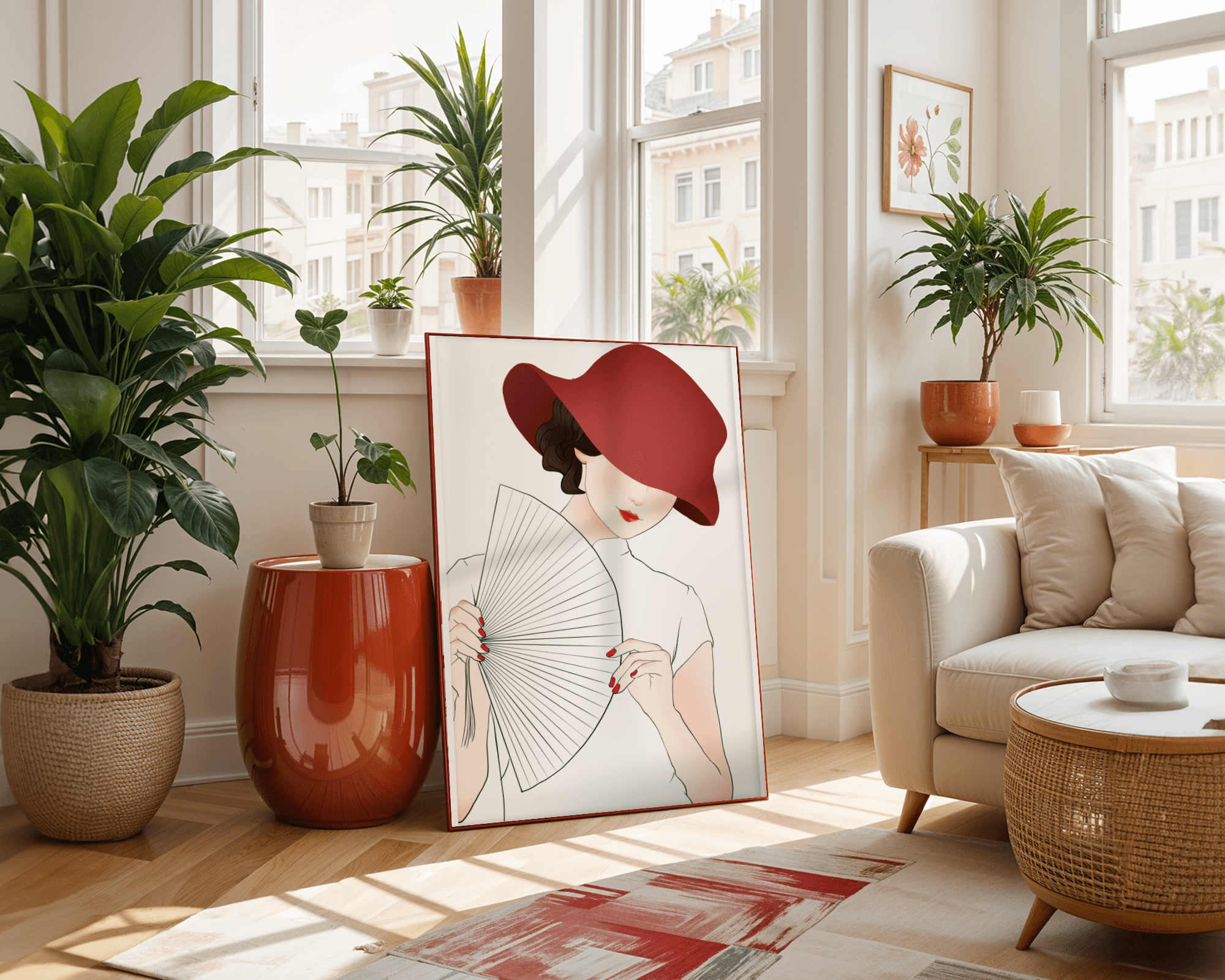This artwork captures the essence of feminine elegance and mystery, making it a perfect addition to fashion-inspired interiors. The contrast of the deep red hat against the soft background adds a striking yet harmonious balance to the composition.